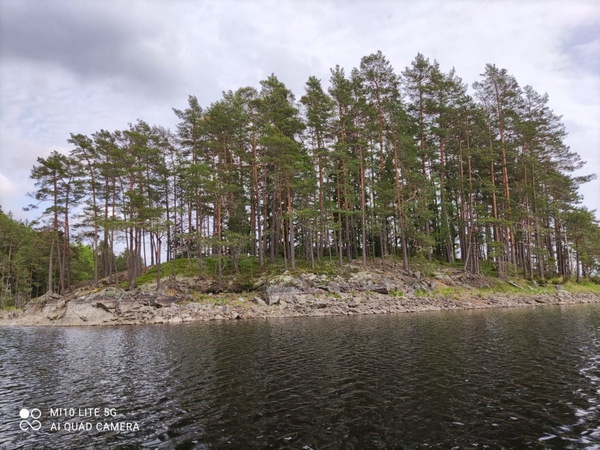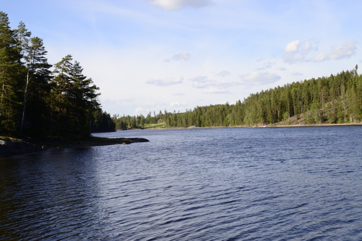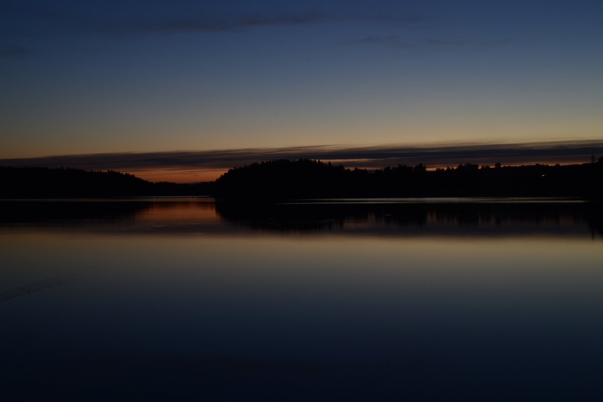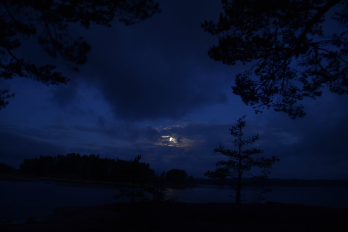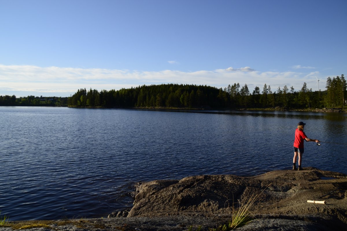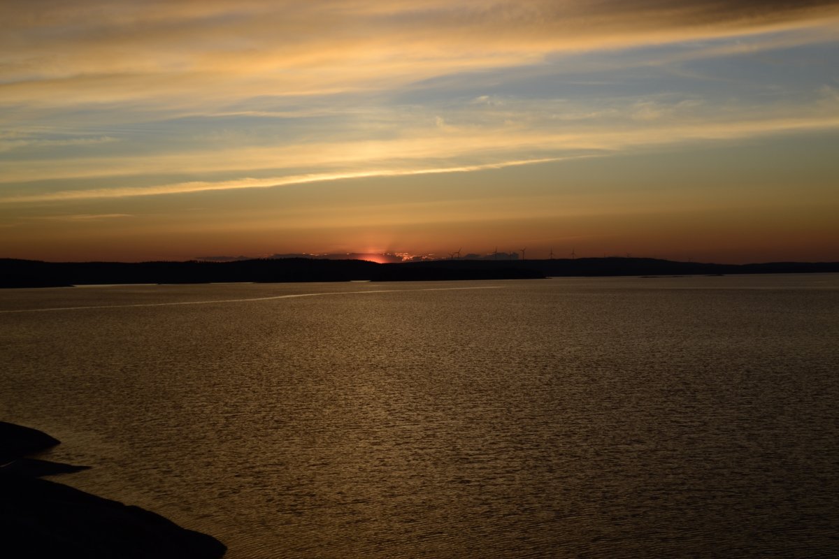 Als wir am nächsten Morgen aufgestanden sind, frühstückten wir Schokomüsli und packten unser Nachtlager zusammen. Unsere Reise sollte weiter in Richtung Norden, Stora Le, gehen. Wir hielten uns ab Camp 36 in Richtung der Umtragestelle, begaben uns somit etwas in Richtung Süden. Etwa einen Kilometer vor der Umtragestelle fiel uns eine kleine Insel ins Auge, auf welcher wir die zweite Nacht in Schweden verbringen wollten. Da wir bereits mittags anlegten entschlossen wir uns dazu, warm Mittag zu essen. Wir machen uns Nudeln mit Käsesoße. Den restlichen Tag angelten wir gelegentlich, bauten einen Windschutz auf und sammelten Feuerholz. Zum Abendessen gab es Tomatensuppe nach Rezept aus dem Outdoorkochbuch, mitsamt Stockbrot. Abends angelten wir noch weiter und ich machte noch ein paar Fotos von der untergehenden Sonne.