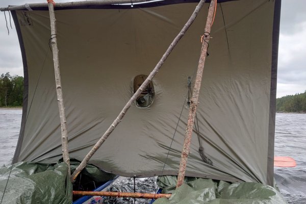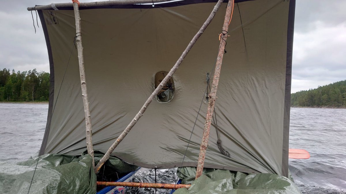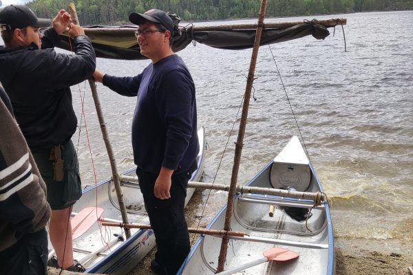 Am Morgen des siebten und vorletzten Tages bauten wir uns einen Katamaran, wie wir ihn bereits bei einigen anderen Gruppen gesehen hatten. Wir verpassten unserem Katamaran jedoch ein Upgrade, indem wir ein Segel bauten. Da wir mit dem Wind Fluss aufwärtsfuhren, konnten wir dieses sehr gut nutzen und sparten uns somit eine Menge Arbeit und vor allem Energie. Von anderen Gruppen bekamen wir für unsere Konstruktion teils sogar Applaus. Der Wind und somit der Wellengang waren an diesem Tag etwas stärker und deshalb blieben wir nicht ganz trocken. Unser Ziel war Camp 14, damit wir es am letzten Tag nicht allzu weit zum Outdoorcamp hatten. Da Camp 14 und Camp 13 jedoch besetzt waren, legten wir an der Feuerstelle zwischen beiden Camps an. Wir bereiteten uns einen Mix aus Kidney Bohnen, grünen Bohnen und Baked Beans mit Zwiebeln und zum Teil Speck zu und trockneten unsere Kleidung Am Abend gab uns eine Gruppe aus ihren Vorräten noch zwei Konserven Pilze und drei Tüten Pilzreis. Wir entschlossen uns dazu in unserer letzten Nacht in Schwedens Wildnis nicht schlafen zu gehen.