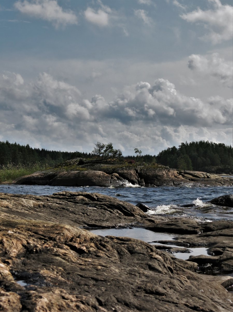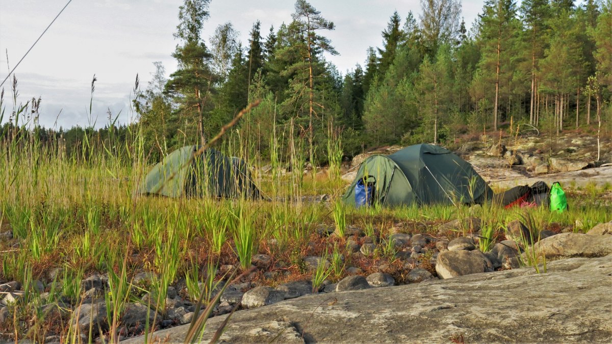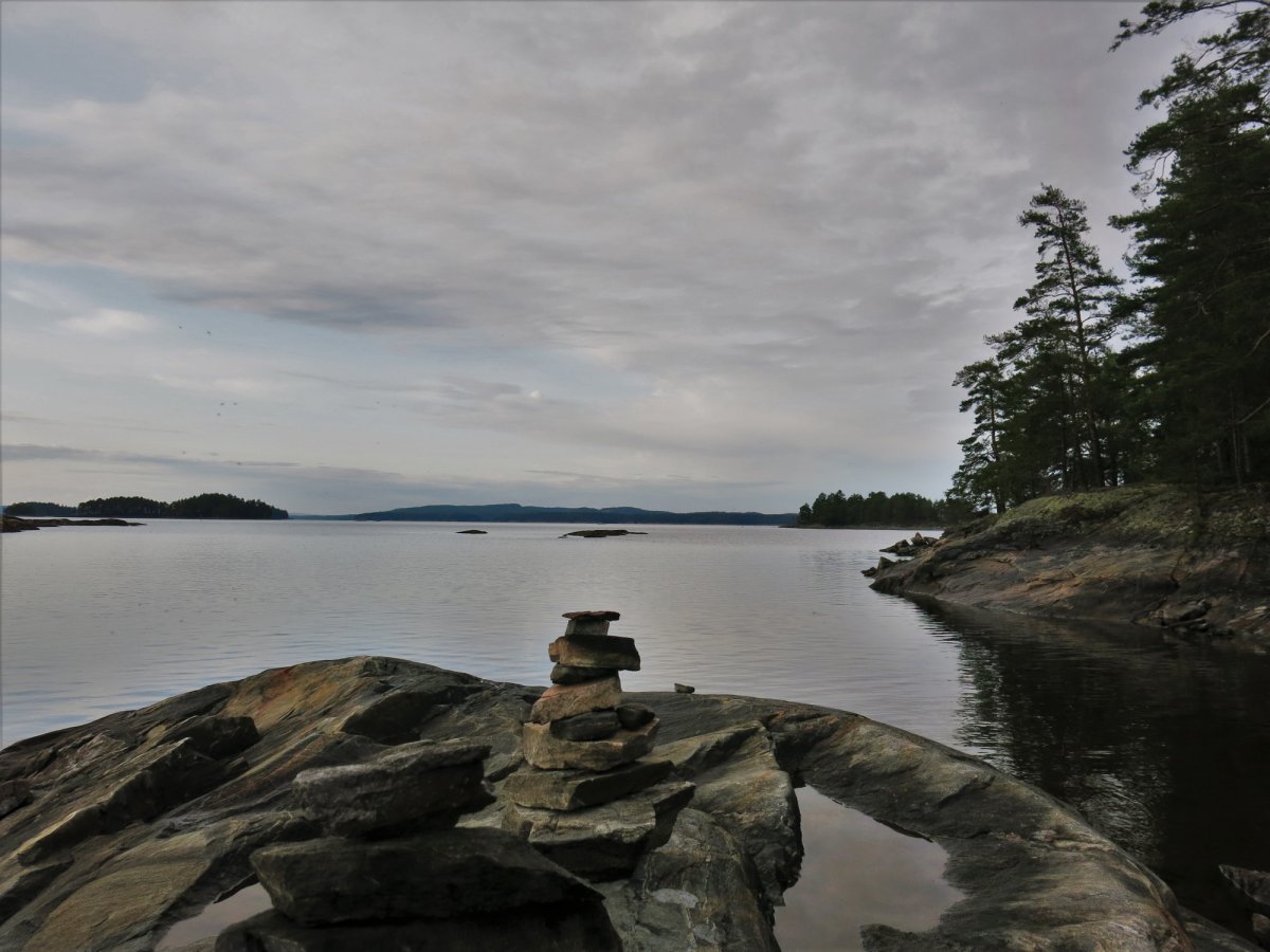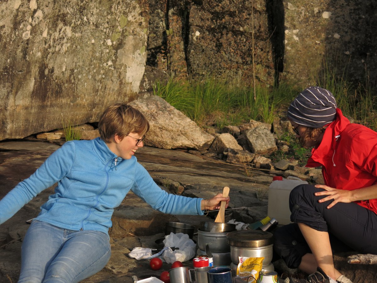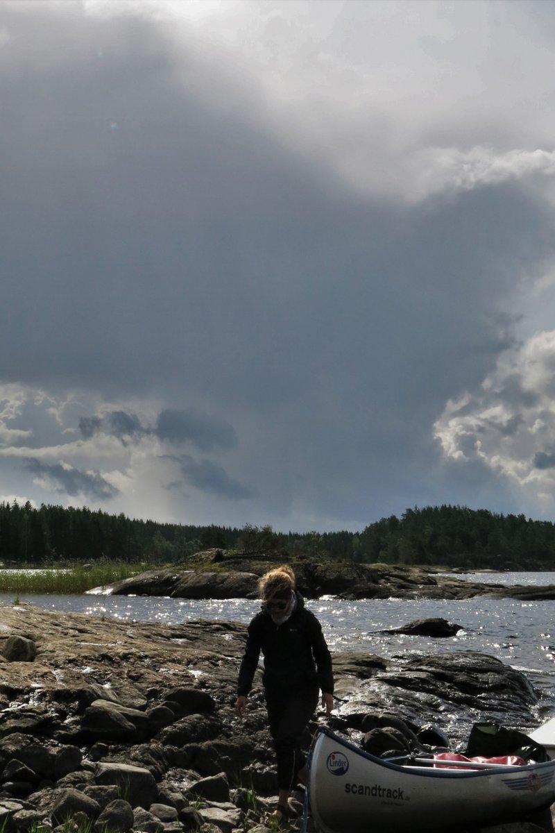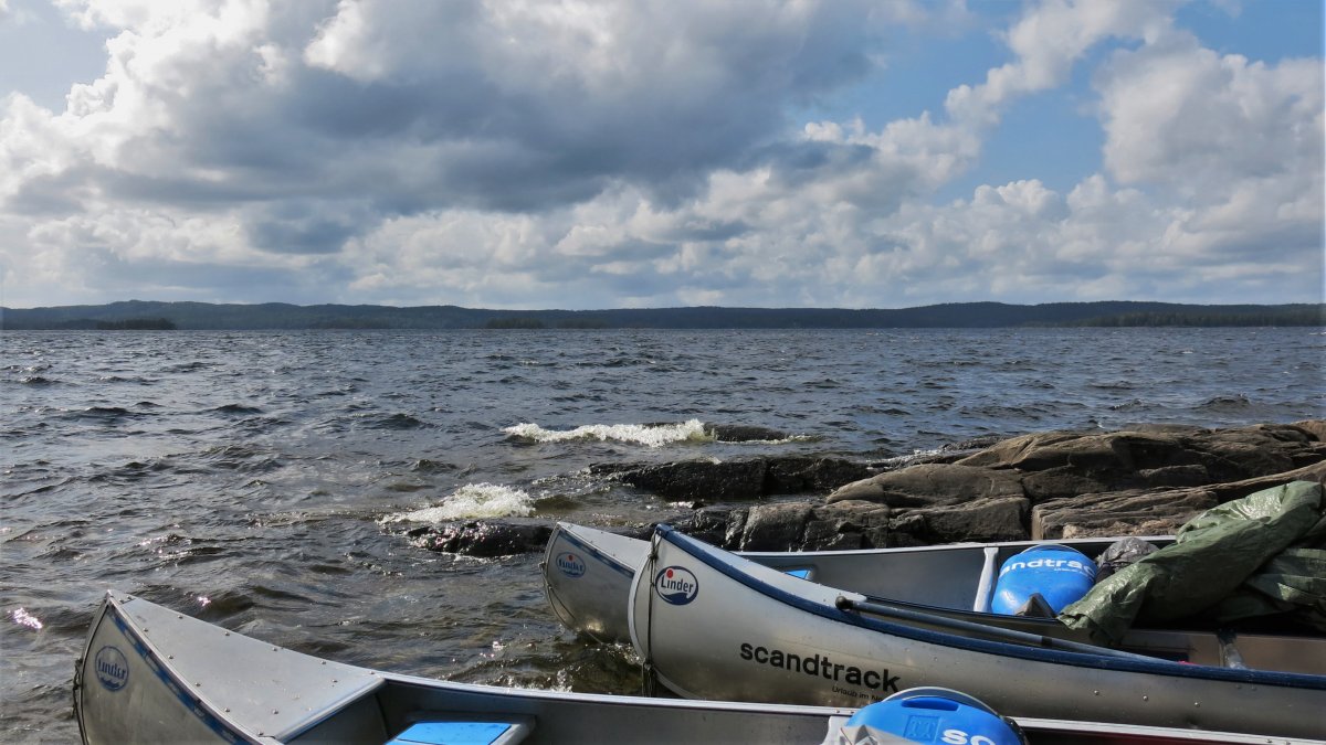 Wir wachen bei strahlendem Sonnenschein auf. Leider ist Luise ziemlich erkältet und ein bisschen fiebrig, jetzt bin ich die einzige, die noch gut schleppen kann. Zum Frühstück gibt es leckeres Eiweißbrot mit Nutella und Marmelade aus frisch gesammelten Preiselbeeren. Unglaublich lecker und mit so vielen Vitaminen, das hilft bestimmt sogar gegen Bänderriss. Als wir alles zusammengepackt haben und eigentlich loskönnen, fängt es ziemlich an zu schütten. Die Planen sind schon weggepackt, aber wir suchen Schutz unter ein paar großen Tannen, bis der Regen nachlässt. Wir steuern aus unserer kleinen Inselgruppe heraus und uns wird leider klar, dass wir den Wind unterschätzt haben, unser Rastplatz lag nämlich im Windschatten der Insel. Außerdem haben wir es dank unserer außerordentlich guten Navigation geschafft, In der Mitte vom See Foxen zu starten, sodass wir jetzt gut den halben See bei Wellengang und Wind von schräg vorne überqueren müssen. Zu zweit geht das noch, aber allein im Kanu ist das eine ganz schön spannende Schaukelpartie, die ich nicht unbedingt wiederholen möchte. Nächstes Mal wird das Einzelkanu schwerer bepackt, damit es nicht so schaukelt. Nach einer knappen Stunde sind wir noch nicht da, wo wir hinwollten, aber immerhin haben wir eine Insel am anderen Ufer erreicht, an der ich anlegen muss, weil der Wind noch zunimmt und ich mit meinen Kräften ziemlich am Ende bin. Ich bin ein Stück von den anderen beiden abgetrieben, aber zum Glück kommen sie mir hinterher. Auf den Felsen vor der Insel sind wir nicht alleine, Hiva und Maurice aus Hamburg mussten dort auch erstmal Pause machen. Um Kraft zu tanken, gibt es zur Abwechslung leckere belegte Eiweißbrote und eine rettende Tüte Saftgoldbären, jetzt wieder bei strahlendem Sonnenschein. Leider nimmt der Wind aber immer noch zu und aus See- wird Antlantikküsten-Feeling. Schön zum Anschauen und Fotografieren, schlecht zum Weiterfahren. Nach drei Stunden warten, spielen und sonnen entscheiden wir uns dann, auf der Insel zu bleiben, der Wind lässt uns keine andere Wahl. Das Problem ist aber, dass es eigentlich keinen Ort gibt, wo man die Zelte aufbauen kann, da überall nur Felsen sind. Nach ein bisschen suchen finden wir dann aber Plätze, die zwar ein bisschen uneben sind, aber an denen die Heringe auch halten. Diesmal bauen wir aus unseren Planen ein windgeschütztes Küchenzelt mit Seeblick, kochen Tee, Suppe und Kartoffeln mit Chili sin carne. Maurice und Hiva setzen sich zu uns und schenken uns eine Knolle Knoblauch, damit wird das Essen perfekt. Der Abend wird lang und unterhaltsam und endet mit einem Bad im eiskalten See unter einem klaren Sternenhimmel.