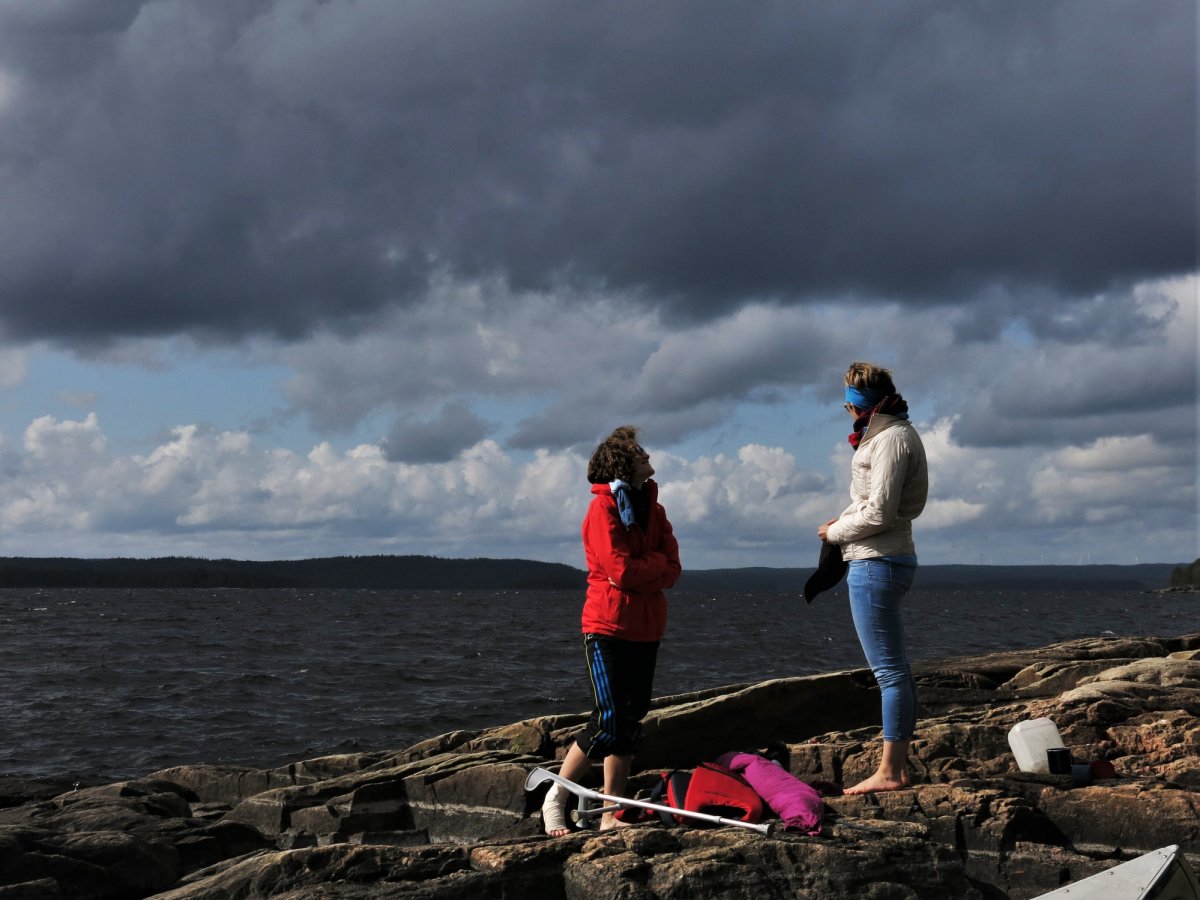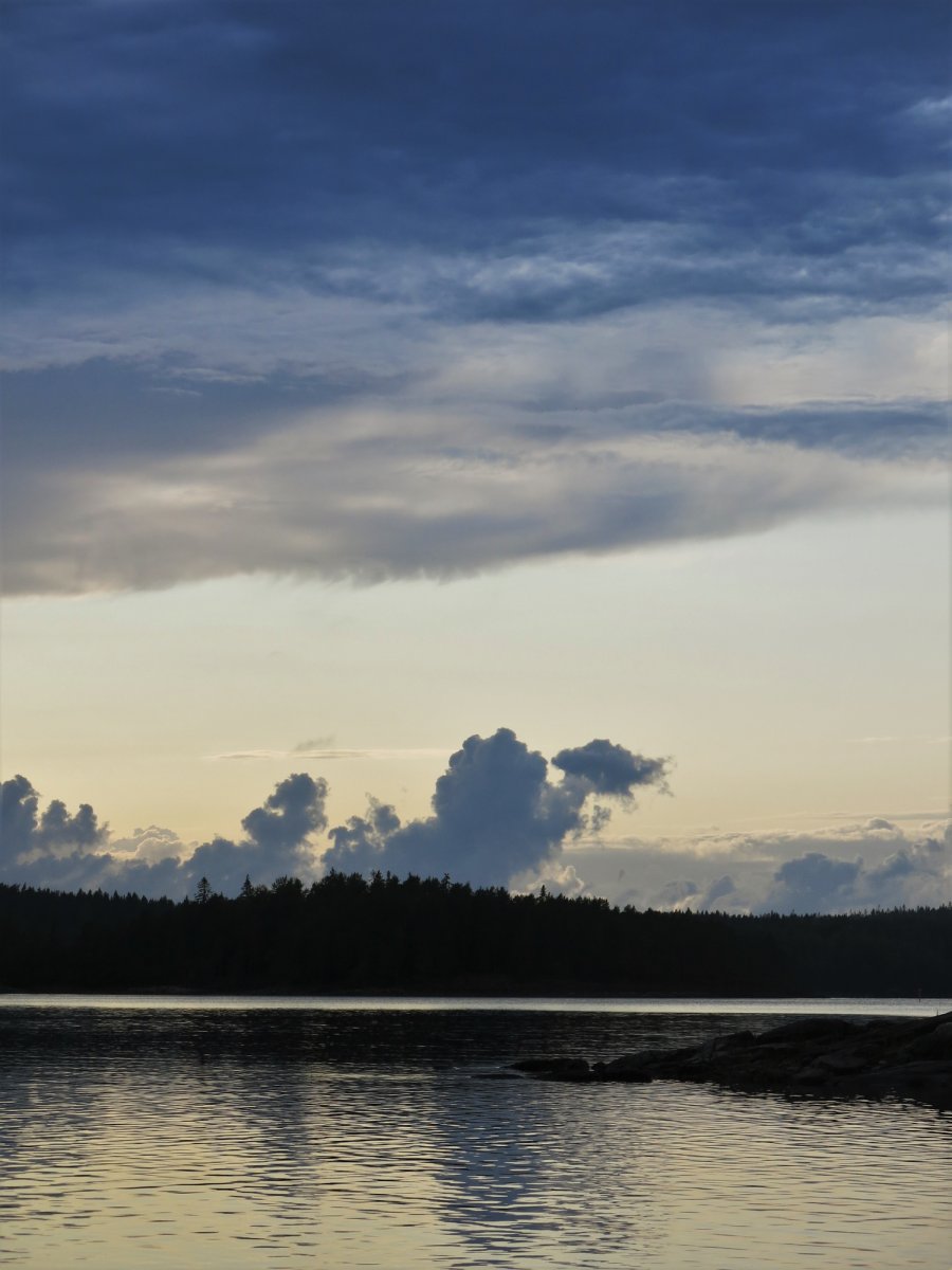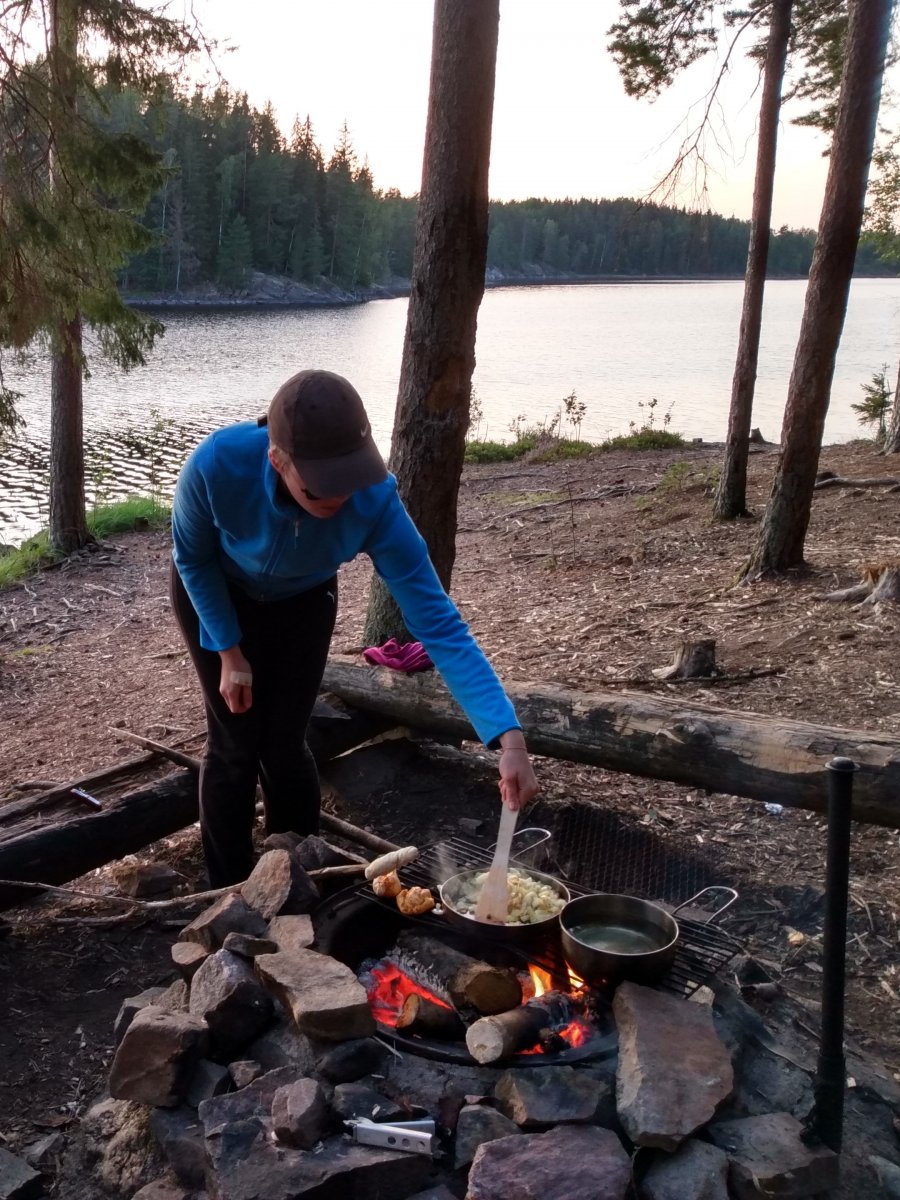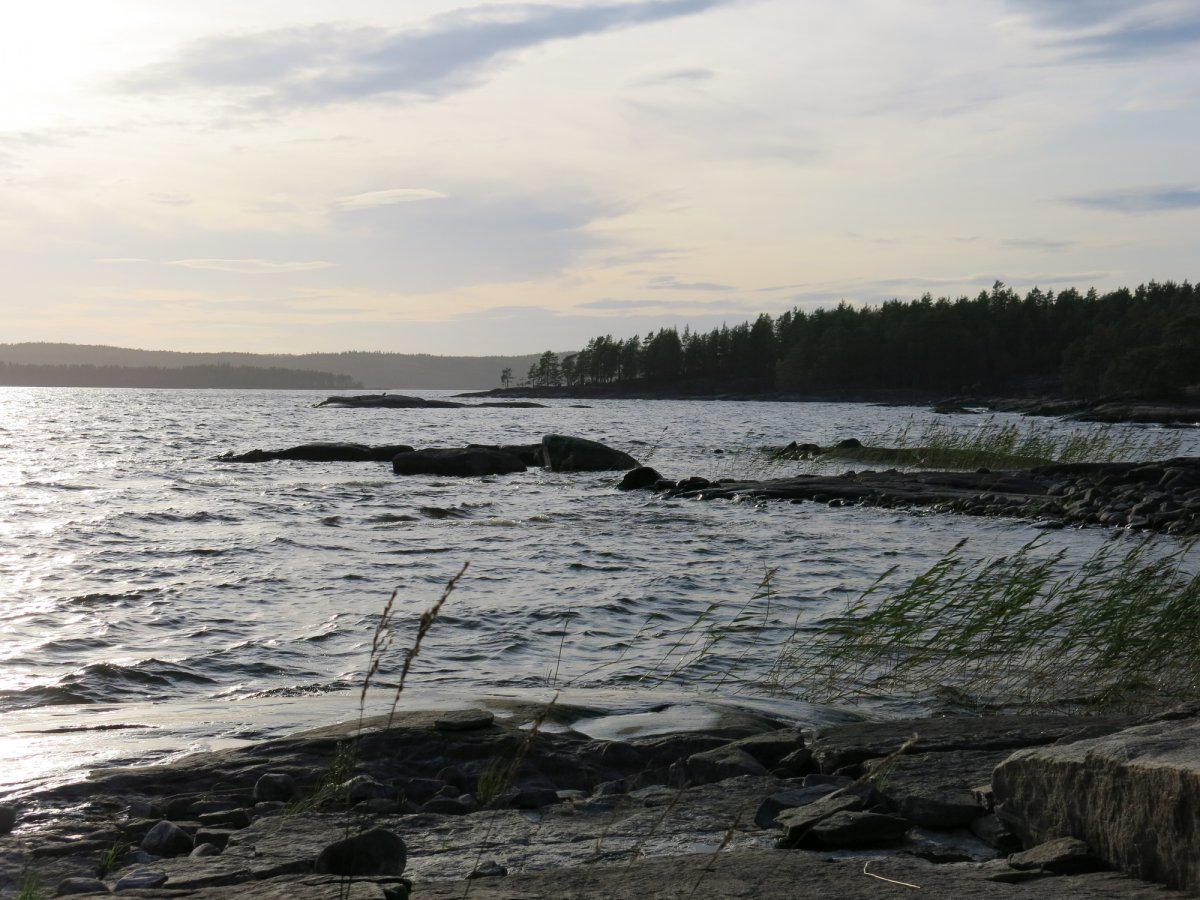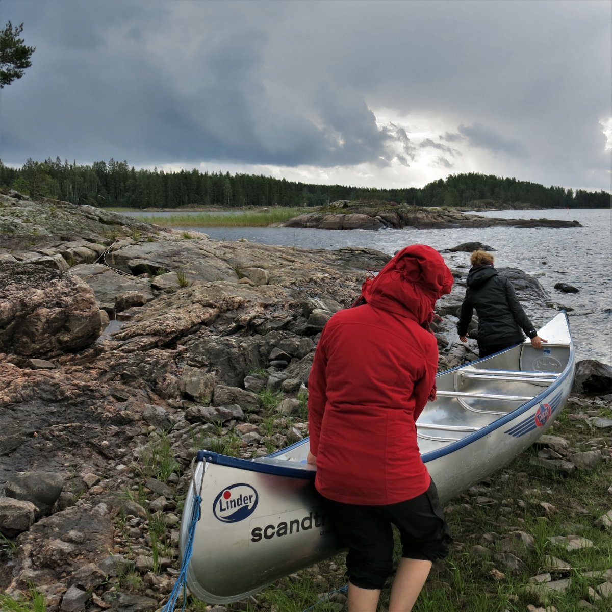 Wir wachen bei strahlendem Sonnenschein auf. Leider ist Luise ziemlich erkältet und ein bisschen fiebrig, jetzt bin ich die einzige, die noch gut schleppen kann. Zum Frühstück gibt es leckeres Eiweißbrot mit Nutella und Marmelade aus frisch gesammelten Preiselbeeren. Unglaublich lecker und mit so vielen Vitaminen, das hilft bestimmt sogar gegen Bänderriss. Als wir alles zusammengepackt haben und eigentlich loskönnen, fängt es ziemlich an zu schütten. Die Planen sind schon weggepackt, aber wir suchen Schutz unter ein paar großen Tannen, bis der Regen nachlässt. Wir steuern aus unserer kleinen Inselgruppe heraus und uns wird leider klar, dass wir den Wind unterschätzt haben, unser Rastplatz lag nämlich im Windschatten der Insel. Außerdem haben wir es dank unserer außerordentlich guten Navigation geschafft, In der Mitte vom See Foxen zu starten, sodass wir jetzt gut den halben See bei Wellengang und Wind von schräg vorne überqueren müssen. Zu zweit geht das noch, aber allein im Kanu ist das eine ganz schön spannende Schaukelpartie, die ich nicht unbedingt wiederholen möchte. Nächstes Mal wird das Einzelkanu schwerer bepackt, damit es nicht so schaukelt. Nach einer knappen Stunde sind wir noch nicht da, wo wir hinwollten, aber immerhin haben wir eine Insel am anderen Ufer erreicht, an der ich anlegen muss, weil der Wind noch zunimmt und ich mit meinen Kräften ziemlich am Ende bin. Ich bin ein Stück von den anderen beiden abgetrieben, aber zum Glück kommen sie mir hinterher. Auf den Felsen vor der Insel sind wir nicht alleine, Hiva und Maurice aus Hamburg mussten dort auch erstmal Pause machen. Um Kraft zu tanken, gibt es zur Abwechslung leckere belegte Eiweißbrote und eine rettende Tüte Saftgoldbären, jetzt wieder bei strahlendem Sonnenschein. Leider nimmt der Wind aber immer noch zu und aus See- wird Antlantikküsten-Feeling. Schön zum Anschauen und Fotografieren, schlecht zum Weiterfahren. Nach drei Stunden warten, spielen und sonnen entscheiden wir uns dann, auf der Insel zu bleiben, der Wind lässt uns keine andere Wahl. Das Problem ist aber, dass es eigentlich keinen Ort gibt, wo man die Zelte aufbauen kann, da überall nur Felsen sind. Nach ein bisschen suchen finden wir dann aber Plätze, die zwar ein bisschen uneben sind, aber an denen die Heringe auch halten. Diesmal bauen wir aus unseren Planen ein windgeschütztes Küchenzelt mit Seeblick, kochen Tee, Suppe und Kartoffeln mit Chili sin carne. Maurice und Hiva setzen sich zu uns und schenken uns eine Knolle Knoblauch, damit wird das Essen perfekt. Der Abend wird lang und unterhaltsam und endet mit einem Bad im eiskalten See unter einem klaren Sternenhimmel.