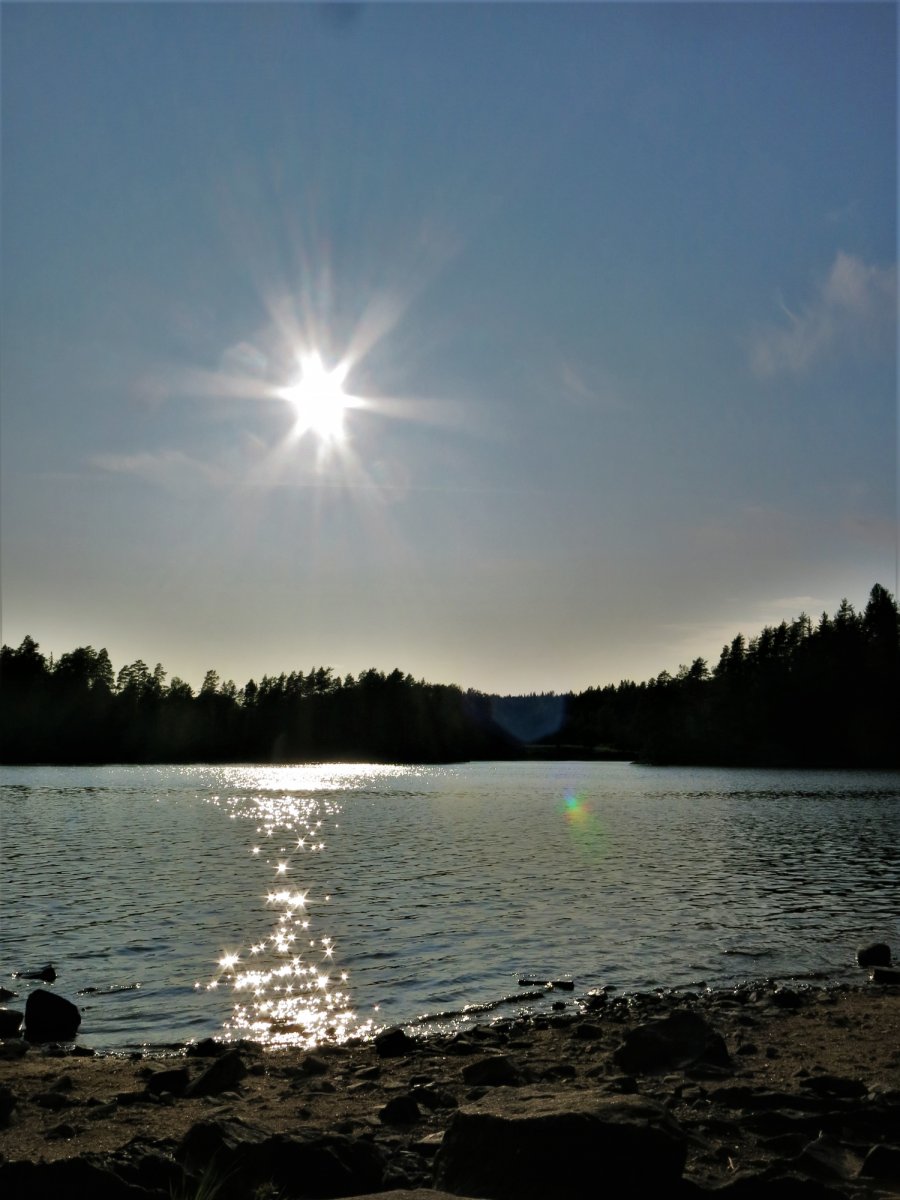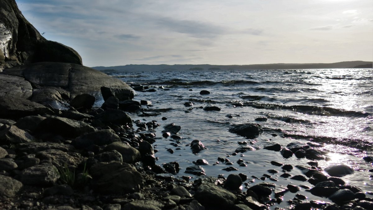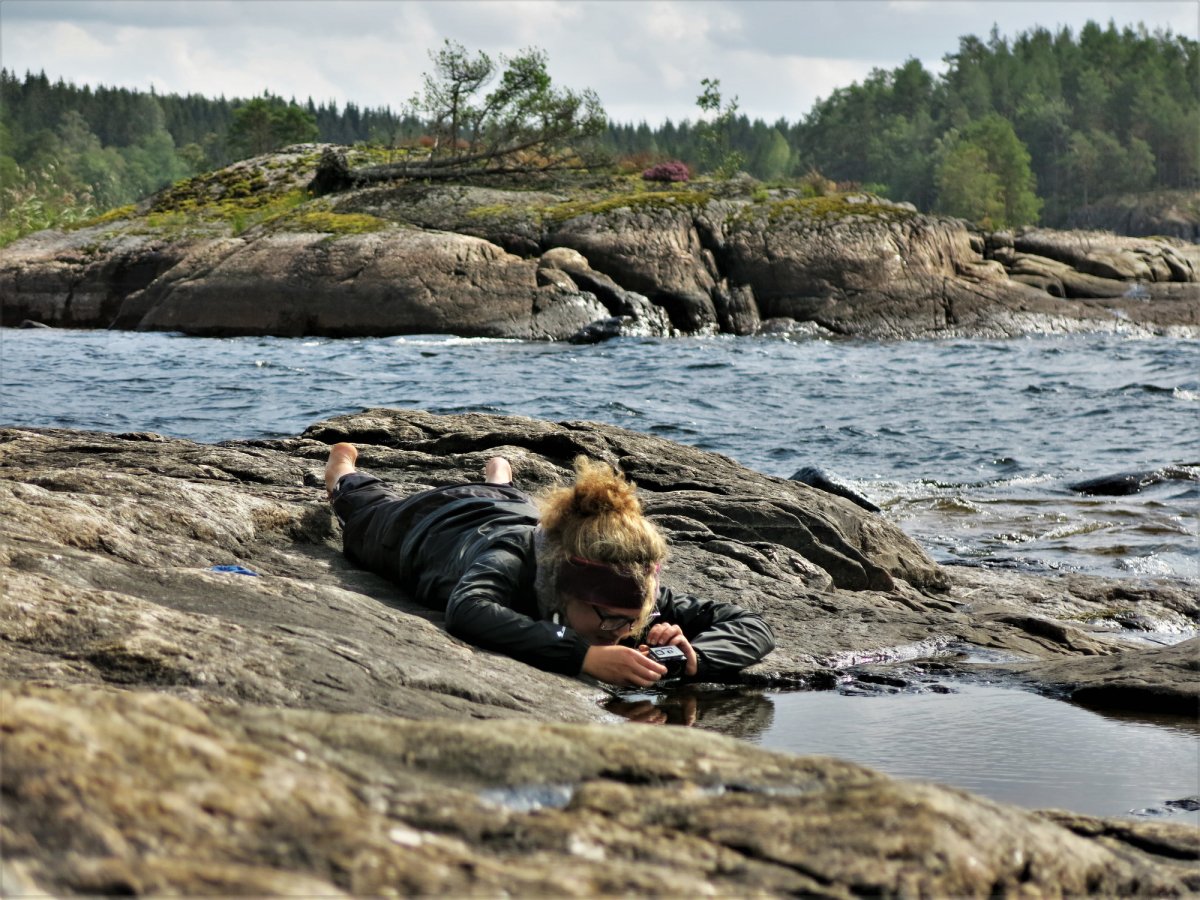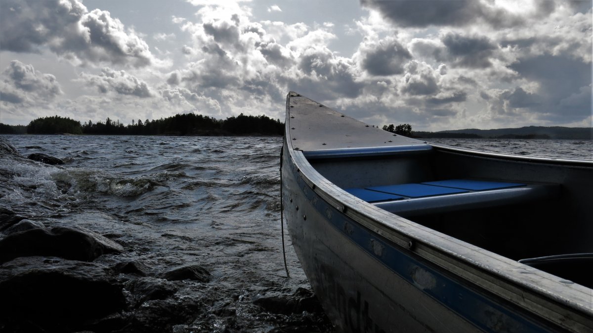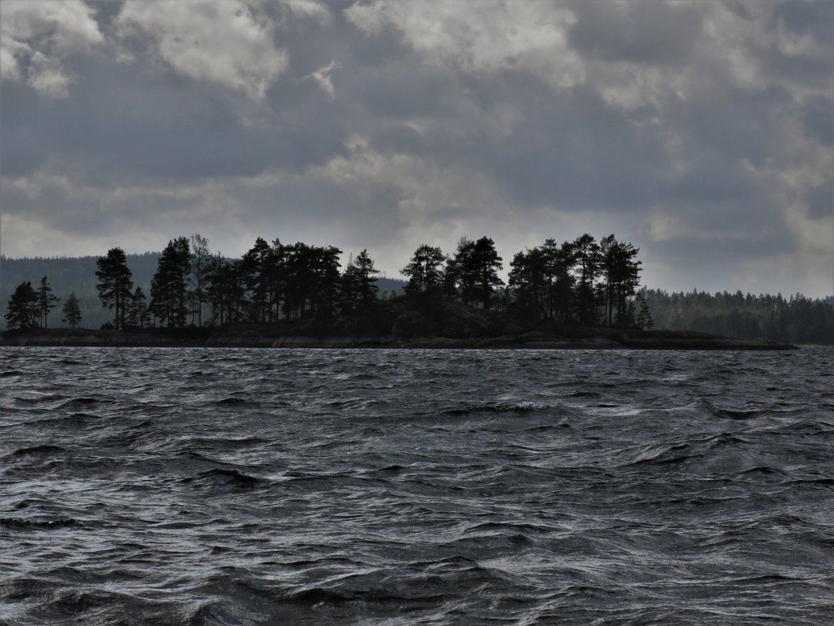 Wir wachen bei strahlendem Sonnenschein auf. Leider ist Luise ziemlich erkältet und ein bisschen fiebrig, jetzt bin ich die einzige, die noch gut schleppen kann. Zum Frühstück gibt es leckeres Eiweißbrot mit Nutella und Marmelade aus frisch gesammelten Preiselbeeren. Unglaublich lecker und mit so vielen Vitaminen, das hilft bestimmt sogar gegen Bänderriss. Als wir alles zusammengepackt haben und eigentlich loskönnen, fängt es ziemlich an zu schütten. Die Planen sind schon weggepackt, aber wir suchen Schutz unter ein paar großen Tannen, bis der Regen nachlässt. Wir steuern aus unserer kleinen Inselgruppe heraus und uns wird leider klar, dass wir den Wind unterschätzt haben, unser Rastplatz lag nämlich im Windschatten der Insel. Außerdem haben wir es dank unserer außerordentlich guten Navigation geschafft, In der Mitte vom See Foxen zu starten, sodass wir jetzt gut den halben See bei Wellengang und Wind von schräg vorne überqueren müssen. Zu zweit geht das noch, aber allein im Kanu ist das eine ganz schön spannende Schaukelpartie, die ich nicht unbedingt wiederholen möchte. Nächstes Mal wird das Einzelkanu schwerer bepackt, damit es nicht so schaukelt. Nach einer knappen Stunde sind wir noch nicht da, wo wir hinwollten, aber immerhin haben wir eine Insel am anderen Ufer erreicht, an der ich anlegen muss, weil der Wind noch zunimmt und ich mit meinen Kräften ziemlich am Ende bin. Ich bin ein Stück von den anderen beiden abgetrieben, aber zum Glück kommen sie mir hinterher. Auf den Felsen vor der Insel sind wir nicht alleine, Hiva und Maurice aus Hamburg mussten dort auch erstmal Pause machen. Um Kraft zu tanken, gibt es zur Abwechslung leckere belegte Eiweißbrote und eine rettende Tüte Saftgoldbären, jetzt wieder bei strahlendem Sonnenschein. Leider nimmt der Wind aber immer noch zu und aus See- wird Antlantikküsten-Feeling. Schön zum Anschauen und Fotografieren, schlecht zum Weiterfahren. Nach drei Stunden warten, spielen und sonnen entscheiden wir uns dann, auf der Insel zu bleiben, der Wind lässt uns keine andere Wahl. Das Problem ist aber, dass es eigentlich keinen Ort gibt, wo man die Zelte aufbauen kann, da überall nur Felsen sind. Nach ein bisschen suchen finden wir dann aber Plätze, die zwar ein bisschen uneben sind, aber an denen die Heringe auch halten. Diesmal bauen wir aus unseren Planen ein windgeschütztes Küchenzelt mit Seeblick, kochen Tee, Suppe und Kartoffeln mit Chili sin carne. Maurice und Hiva setzen sich zu uns und schenken uns eine Knolle Knoblauch, damit wird das Essen perfekt. Der Abend wird lang und unterhaltsam und endet mit einem Bad im eiskalten See unter einem klaren Sternenhimmel.