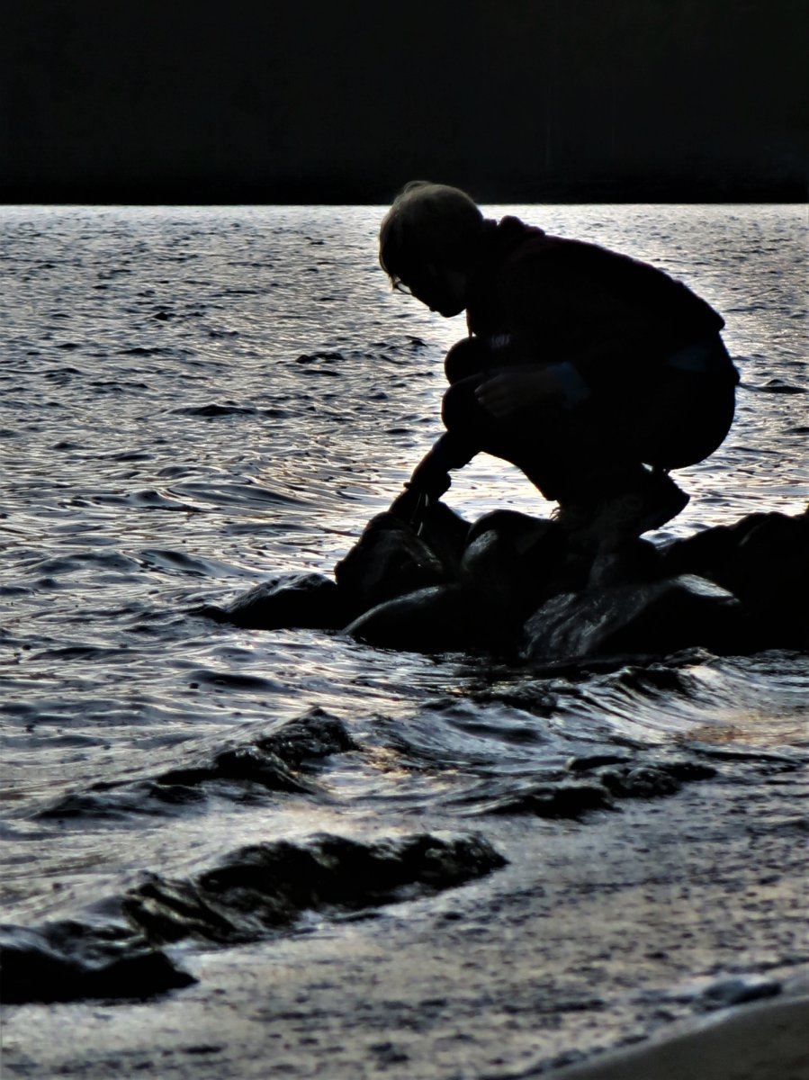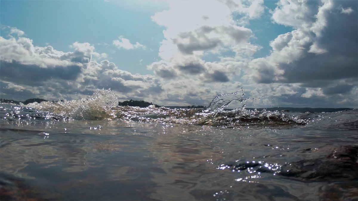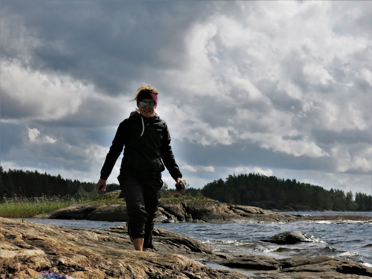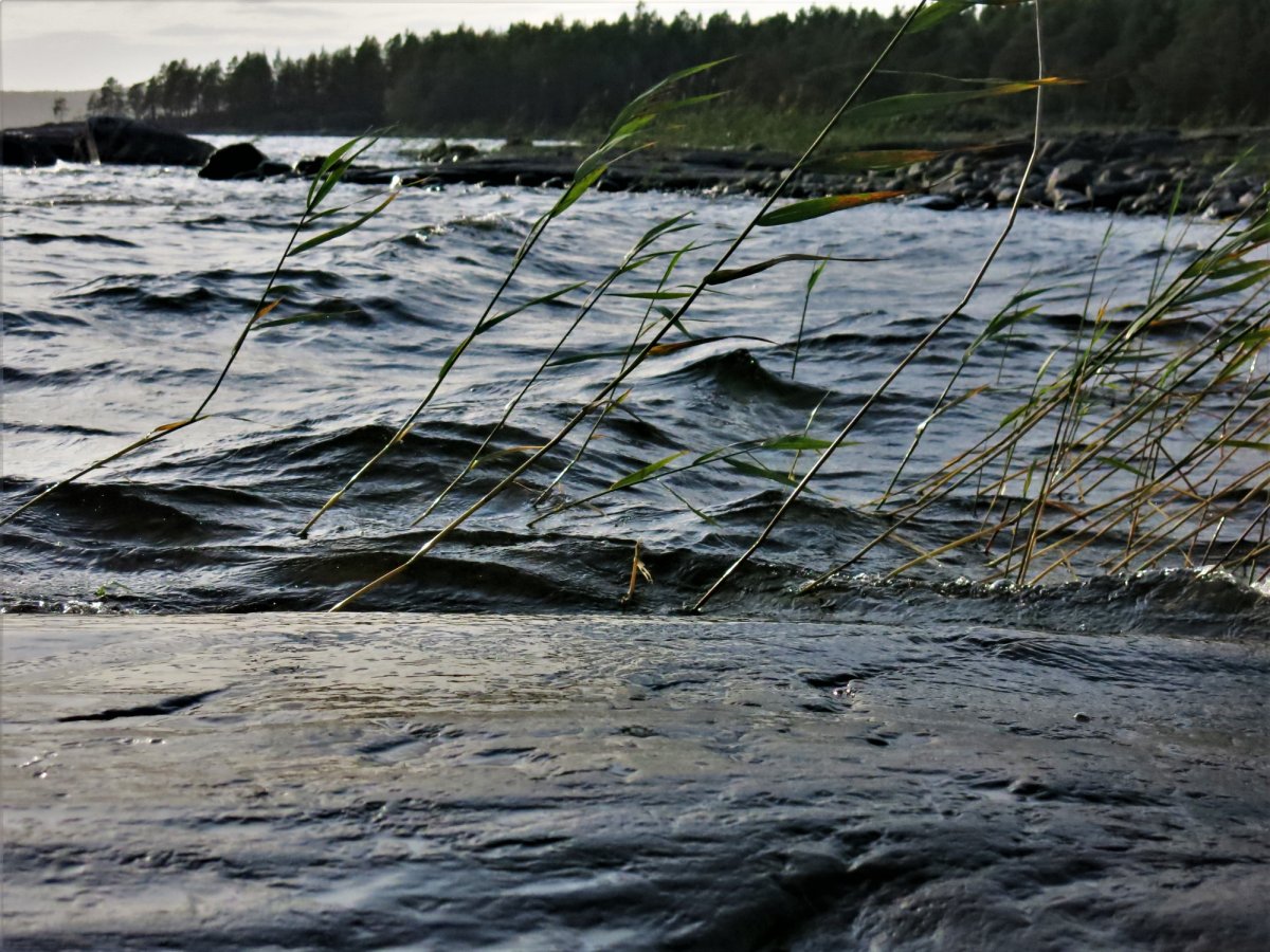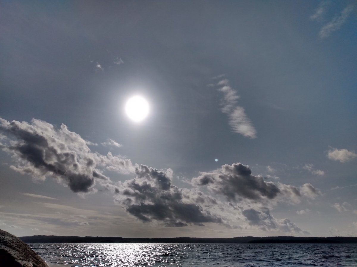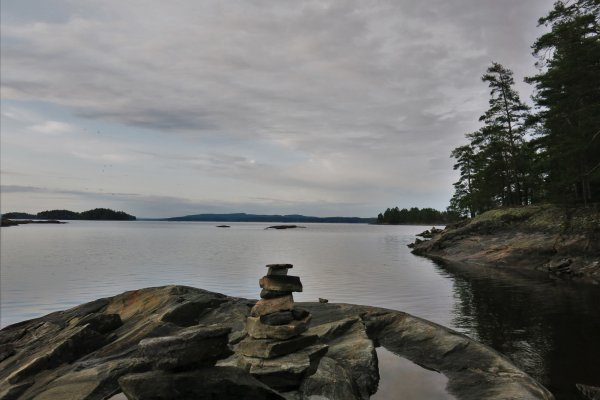 Wir wachen bei strahlendem Sonnenschein auf. Leider ist Luise ziemlich erkältet und ein bisschen fiebrig, jetzt bin ich die einzige, die noch gut schleppen kann. Zum Frühstück gibt es leckeres Eiweißbrot mit Nutella und Marmelade aus frisch gesammelten Preiselbeeren. Unglaublich lecker und mit so vielen Vitaminen, das hilft bestimmt sogar gegen Bänderriss. Als wir alles zusammengepackt haben und eigentlich loskönnen, fängt es ziemlich an zu schütten. Die Planen sind schon weggepackt, aber wir suchen Schutz unter ein paar großen Tannen, bis der Regen nachlässt. Wir steuern aus unserer kleinen Inselgruppe heraus und uns wird leider klar, dass wir den Wind unterschätzt haben, unser Rastplatz lag nämlich im Windschatten der Insel. Außerdem haben wir es dank unserer außerordentlich guten Navigation geschafft, In der Mitte vom See Foxen zu starten, sodass wir jetzt gut den halben See bei Wellengang und Wind von schräg vorne überqueren müssen. Zu zweit geht das noch, aber allein im Kanu ist das eine ganz schön spannende Schaukelpartie, die ich nicht unbedingt wiederholen möchte. Nächstes Mal wird das Einzelkanu schwerer bepackt, damit es nicht so schaukelt. Nach einer knappen Stunde sind wir noch nicht da, wo wir hinwollten, aber immerhin haben wir eine Insel am anderen Ufer erreicht, an der ich anlegen muss, weil der Wind noch zunimmt und ich mit meinen Kräften ziemlich am Ende bin. Ich bin ein Stück von den anderen beiden abgetrieben, aber zum Glück kommen sie mir hinterher. Auf den Felsen vor der Insel sind wir nicht alleine, Hiva und Maurice aus Hamburg mussten dort auch erstmal Pause machen. Um Kraft zu tanken, gibt es zur Abwechslung leckere belegte Eiweißbrote und eine rettende Tüte Saftgoldbären, jetzt wieder bei strahlendem Sonnenschein. Leider nimmt der Wind aber immer noch zu und aus See- wird Antlantikküsten-Feeling. Schön zum Anschauen und Fotografieren, schlecht zum Weiterfahren. Nach drei Stunden warten, spielen und sonnen entscheiden wir uns dann, auf der Insel zu bleiben, der Wind lässt uns keine andere Wahl. Das Problem ist aber, dass es eigentlich keinen Ort gibt, wo man die Zelte aufbauen kann, da überall nur Felsen sind. Nach ein bisschen suchen finden wir dann aber Plätze, die zwar ein bisschen uneben sind, aber an denen die Heringe auch halten. Diesmal bauen wir aus unseren Planen ein windgeschütztes Küchenzelt mit Seeblick, kochen Tee, Suppe und Kartoffeln mit Chili sin carne. Maurice und Hiva setzen sich zu uns und schenken uns eine Knolle Knoblauch, damit wird das Essen perfekt. Der Abend wird lang und unterhaltsam und endet mit einem Bad im eiskalten See unter einem klaren Sternenhimmel.