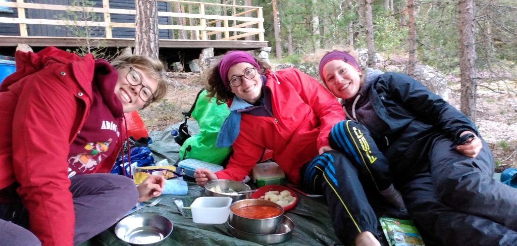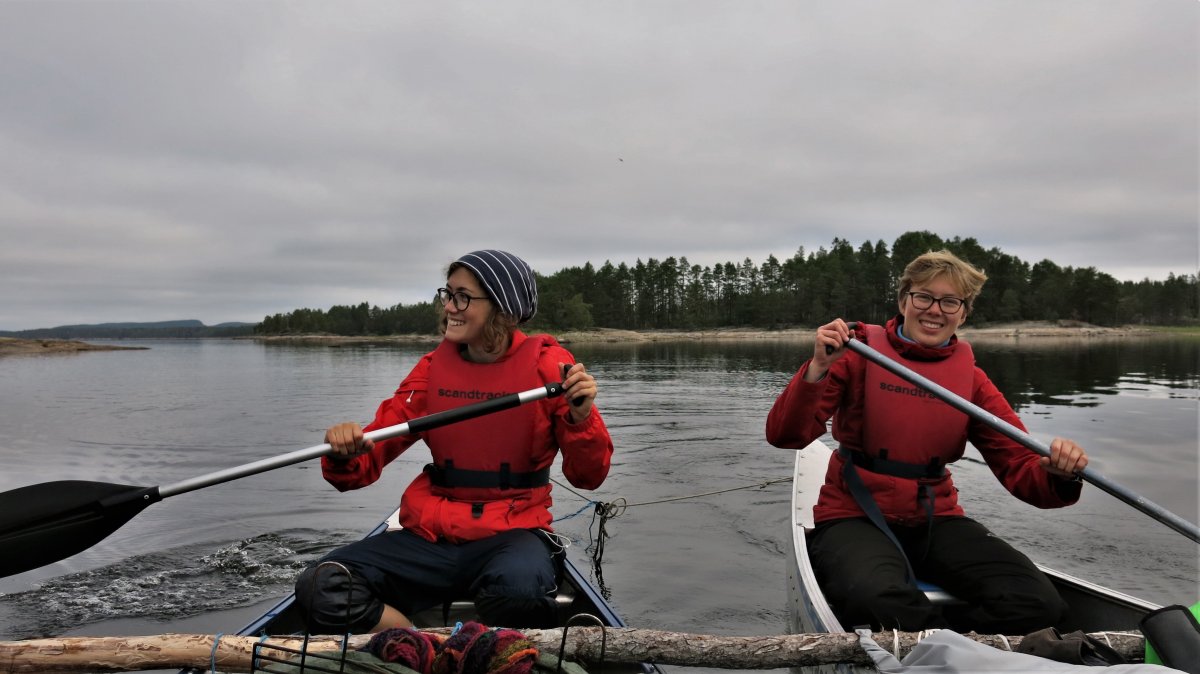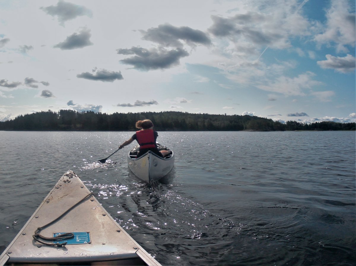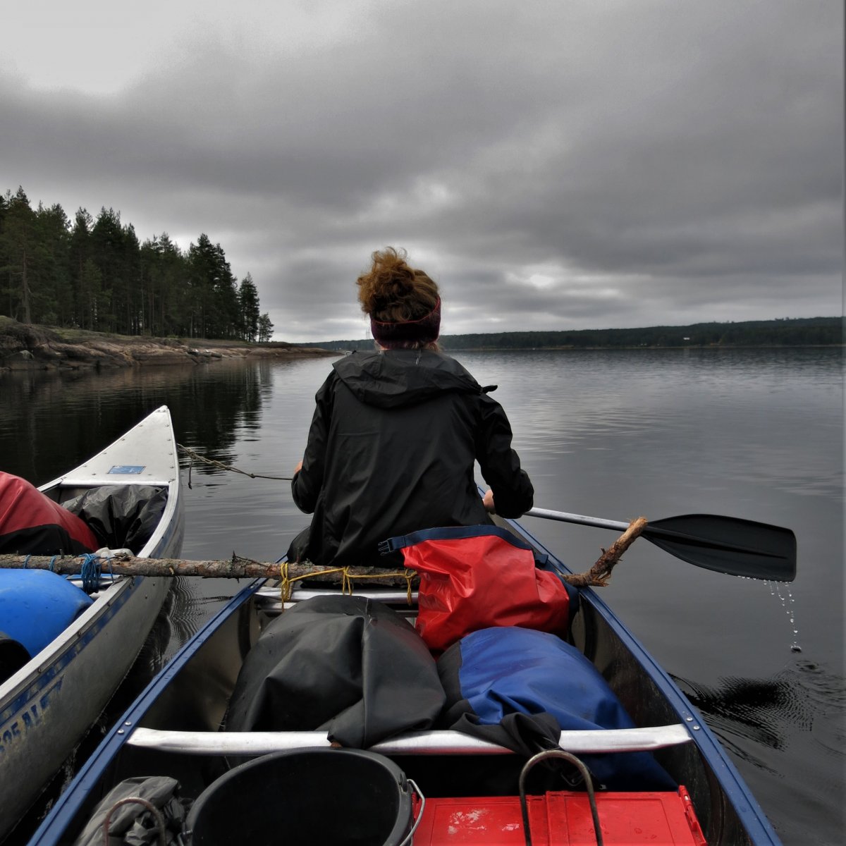 Am nächsten Tag sieht alles viel besser aus: Die Sonne scheint, es gibt Kaffee und Johanna sagt, sie kann und will die Kanufahrt antreten. Nach einer Privateinweisung ins Kanufahren (alle anderen sind ja gestern losgefahren), viel Schlepperei und einer wenig eleganten Kletteraktion ins Kanu mit Krücken, haben wir es dann wirklich geschafft: Wir fahren! Zwar ziemlich kreuz und quer (lenken ist doch nicht so einfach wie beim Fahrradfahren), aber immerhin. Pünktlich zum Start fängt es auch wieder an zu nieseln, aber uns ist das egal. Es ist auch anstrengender als erwartet; nach einer knappen Stunde machen wir deshalb schon die erste Pause. Mitten auf dem See, kein Mensch außer uns und Wasser direkt aus dem See schöpfen. Unsere etwas holprige Anreise ist schon wieder vergessen und abends fühlt es sich an, als wären wir schon ewig hier. Leider haben wir das Navigieren noch nicht so richtig drauf und bauen unser Camp erstmal auf einer Vogelinsel auf. Ob das nun Glück oder Pech ist, weiß keiner so genau, jedenfalls entdecken wir das „Vogelinsel“-Schild noch bevor es dunkel wird und ziehen dann eine Insel weiter. Nochmal alles aufbauen, aber dann gibt es superleckeren, heißen Linseneintopf und Tee (alles mit Seeblick) und wieder schlafen wir wie Steine.