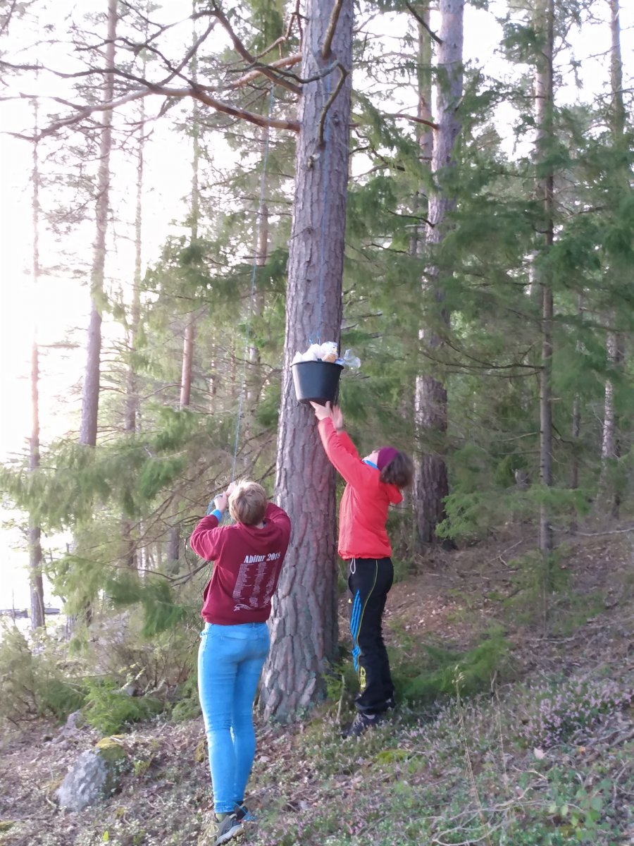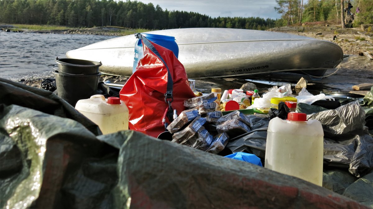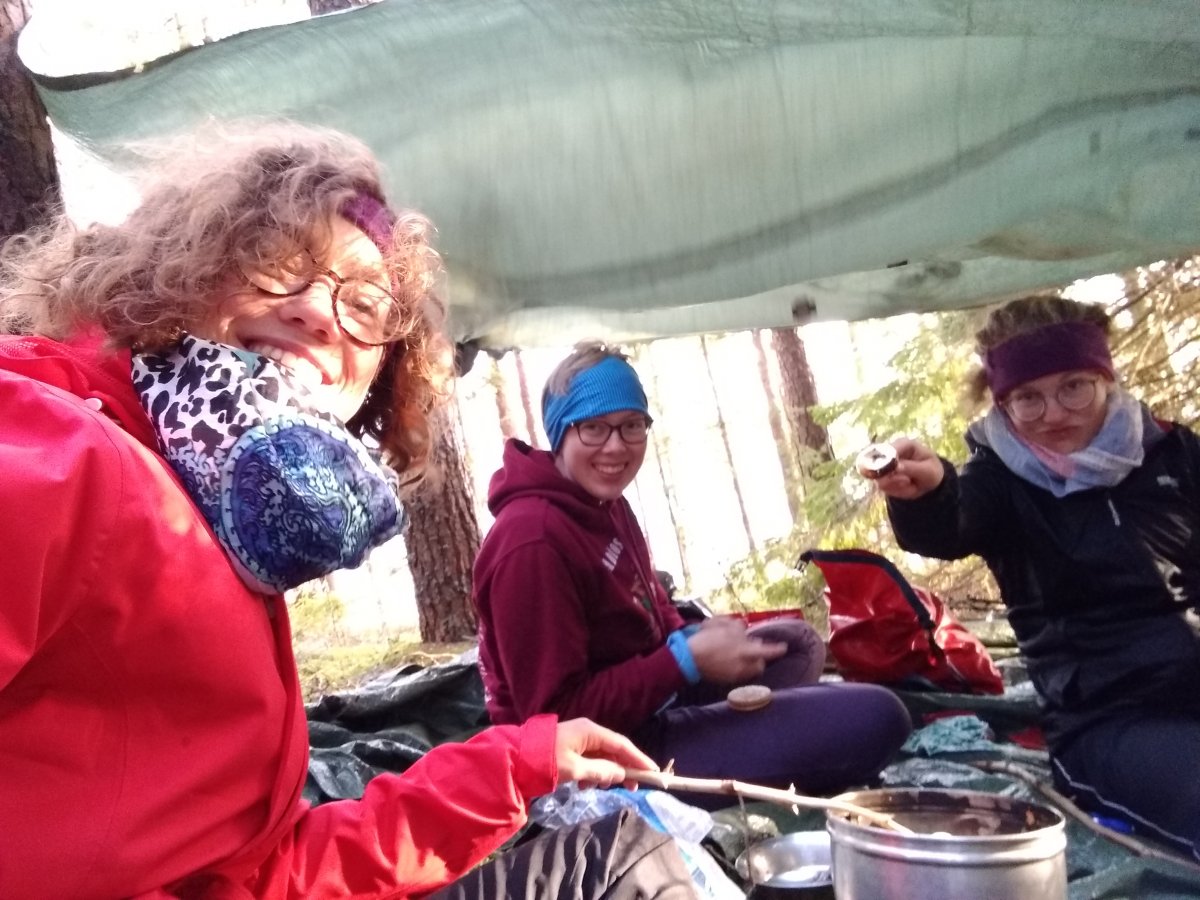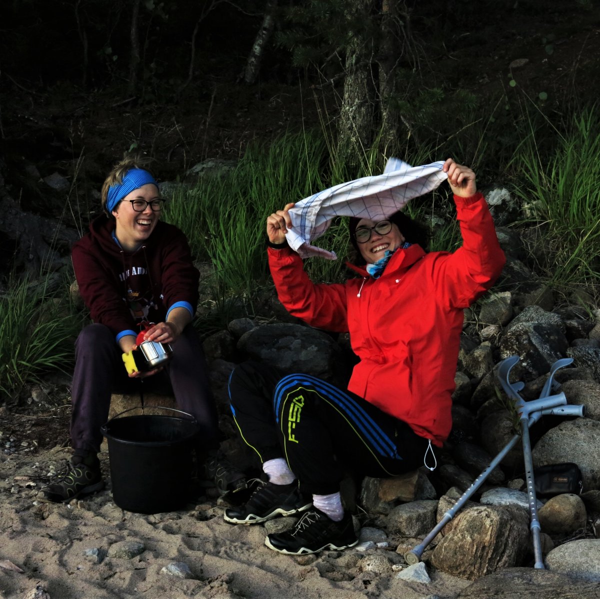 Am nächsten Tag sieht alles viel besser aus: Die Sonne scheint, es gibt Kaffee und Johanna sagt, sie kann und will die Kanufahrt antreten. Nach einer Privateinweisung ins Kanufahren (alle anderen sind ja gestern losgefahren), viel Schlepperei und einer wenig eleganten Kletteraktion ins Kanu mit Krücken, haben wir es dann wirklich geschafft: Wir fahren! Zwar ziemlich kreuz und quer (lenken ist doch nicht so einfach wie beim Fahrradfahren), aber immerhin. Pünktlich zum Start fängt es auch wieder an zu nieseln, aber uns ist das egal. Es ist auch anstrengender als erwartet; nach einer knappen Stunde machen wir deshalb schon die erste Pause. Mitten auf dem See, kein Mensch außer uns und Wasser direkt aus dem See schöpfen. Unsere etwas holprige Anreise ist schon wieder vergessen und abends fühlt es sich an, als wären wir schon ewig hier. Leider haben wir das Navigieren noch nicht so richtig drauf und bauen unser Camp erstmal auf einer Vogelinsel auf. Ob das nun Glück oder Pech ist, weiß keiner so genau, jedenfalls entdecken wir das „Vogelinsel“-Schild noch bevor es dunkel wird und ziehen dann eine Insel weiter. Nochmal alles aufbauen, aber dann gibt es superleckeren, heißen Linseneintopf und Tee (alles mit Seeblick) und wieder schlafen wir wie Steine.