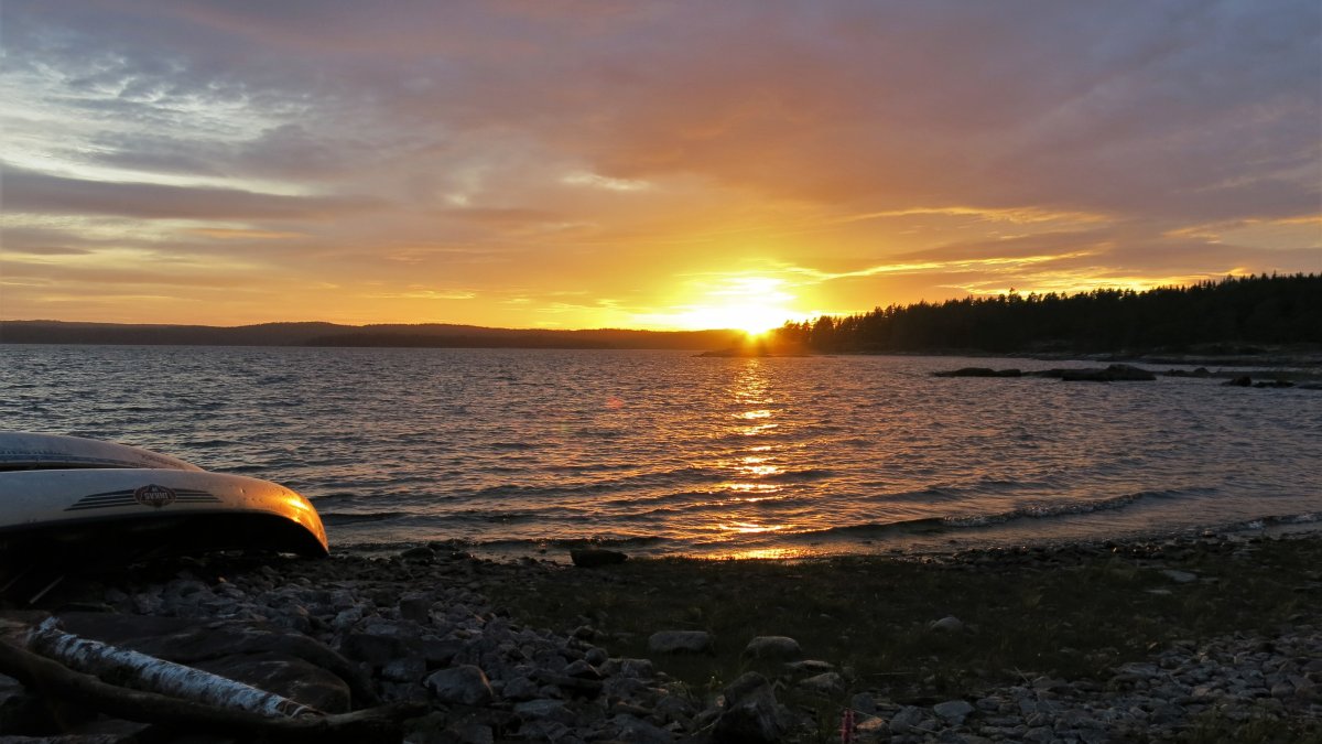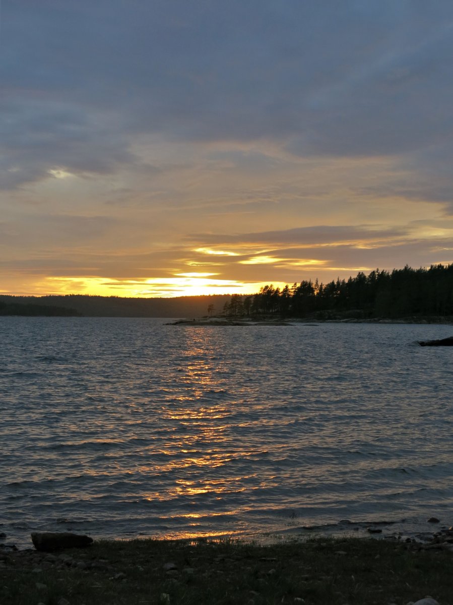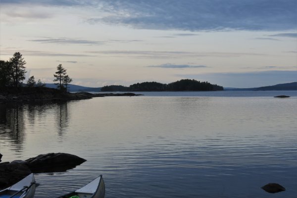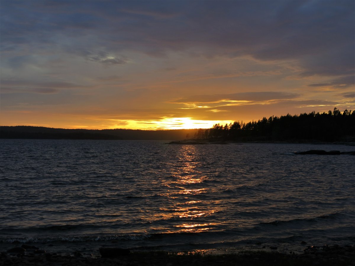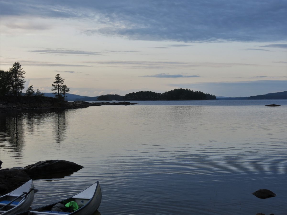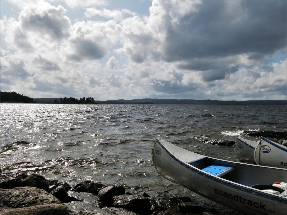 Als wir aufwachen, prasselt der Regen immer noch auf unser Zelt und wir beschließen, mit dem Frühstücken zu warten, bis es trocken(er) ist. Dauert leider bis halb zwölf. Bis dahin vertreiben wir uns die Zeit und den Hunger mit Spielen, Doppelkeksen und Gummibärchen. Irgendwann ist es dann trocken und wir können den modrigen Wald verlassen. Es gibt noch einen kurzen Brunch mit leckerem Eiweißbrot auf dem Felsen direkt am Wasser, dann geht es im Sonnenschein weiter. Zuerst kommen wir gut voran, doch als wir aus der windgeschützten Bucht dem offenen See näherkommen, geht es kaum noch voran. Für 20 m brauchen wir durch Wind und Wellen 20 min. Alleine ist das Kanu so kaum zu steuern und wir treiben immer weiter auseinander. Auf dem See komme ich dann irgendwann gar nicht mehr gegen die Wellen an und versuche nur noch, das Kanu senkrecht zu den Wellen zu drehen, damit es nicht so leicht kentern kann. Eigentlich wollten wir gegen den Wind weiter Richtung Süden fahren, haben aber keine Chance und werden an einen Kiesstrand gespült. Völlig am Ende ziehen wir die Kanus an Land und rufen beim Scandtrack-Team an, ob der Weg von uns aus bis zum Camp morgen zu schaffen ist. Das soll zum Glück kein Problem sein und wir kriegen noch den Tipp, die Kanus mit zwei Ästen zu einem Katamaran zusammenzubinden, da man so auf jeden Fall kentersicherer ist und niemand allein fahren muss. Beruhigt bauen wir alles auf und merken mit jeder Minute mehr, wie schön der Ort ist, an den wir aus Versehen angespült wurden. Der Sonnenuntergang macht den Abend perfekt. Unsere Zelte stehen direkt am Strand und beim Einschlafen hört man das Wellenrauschen.