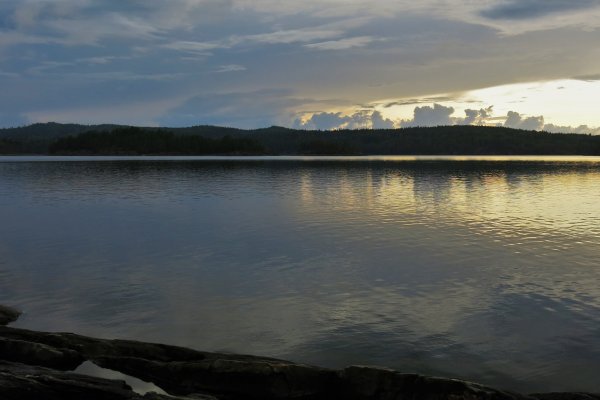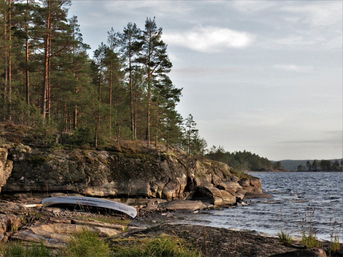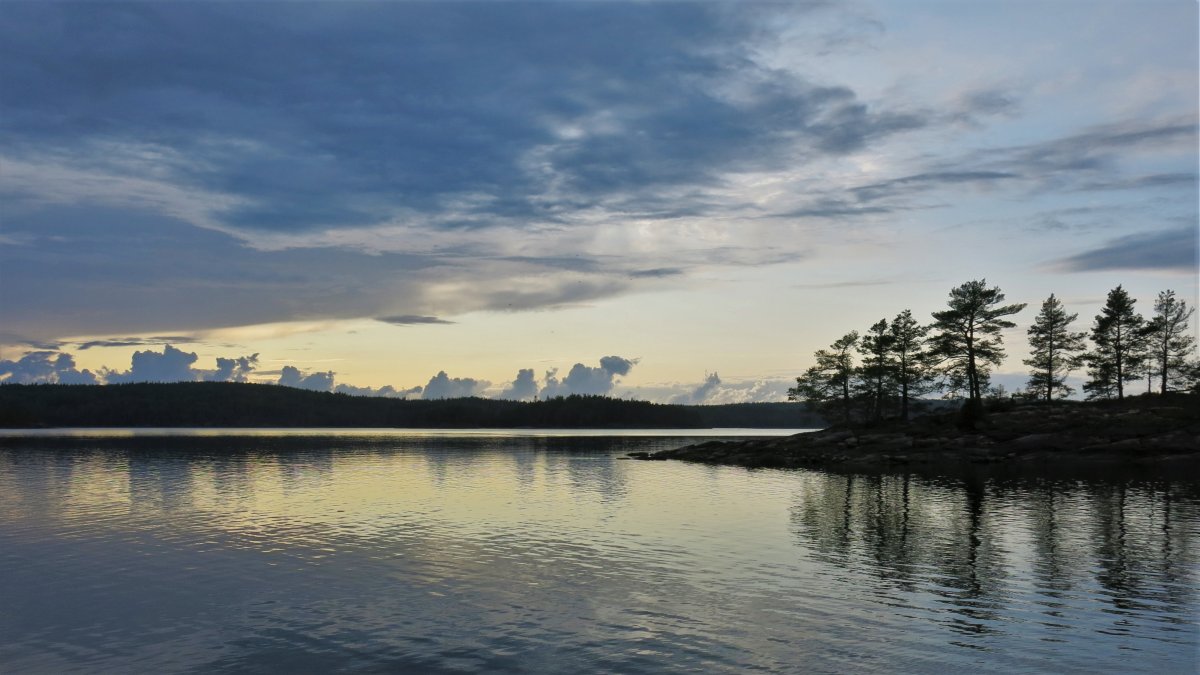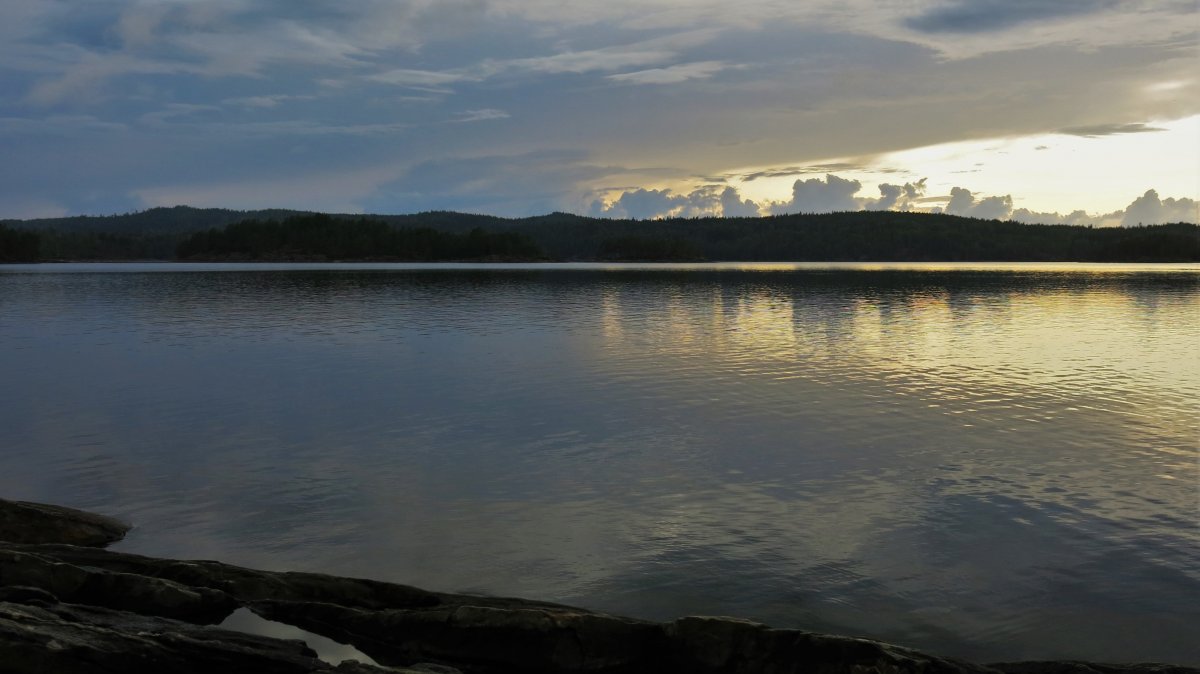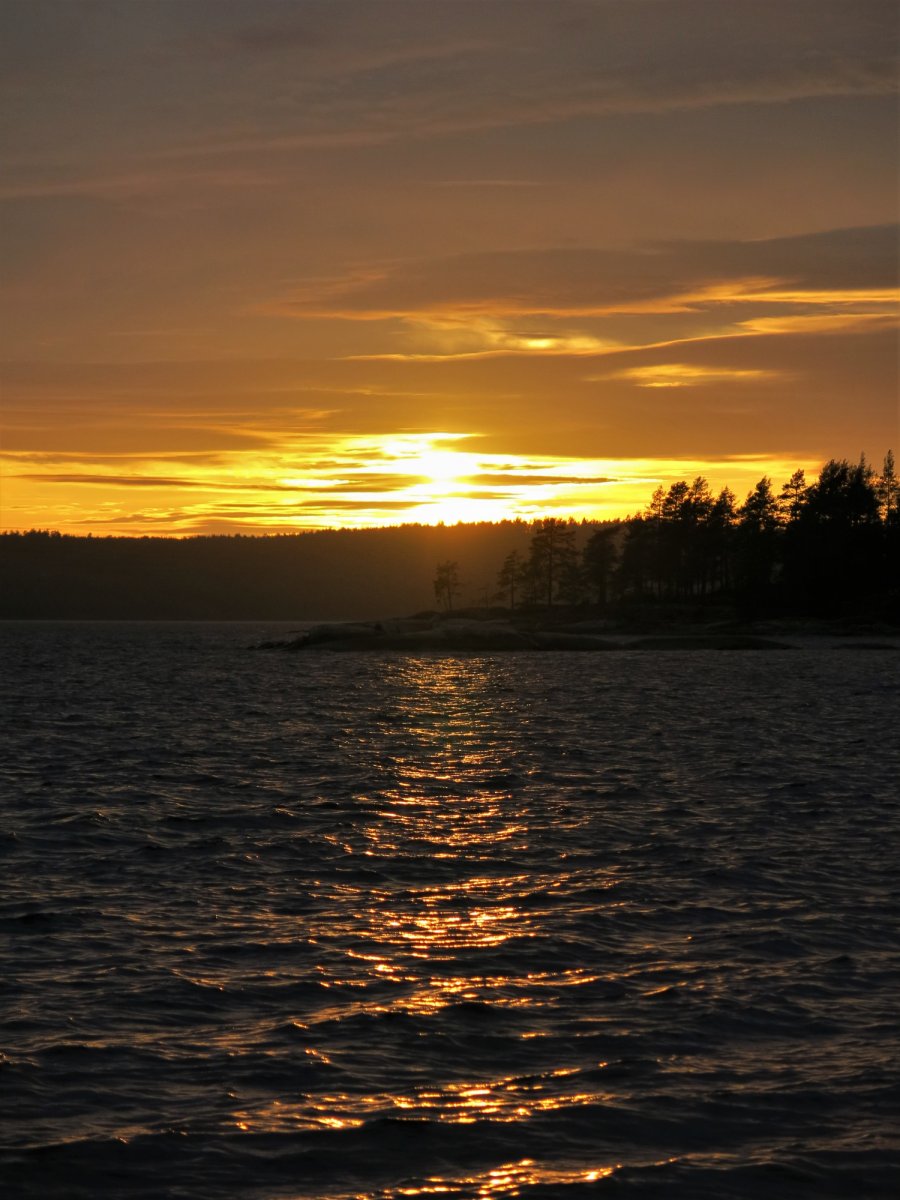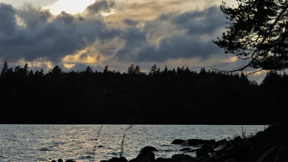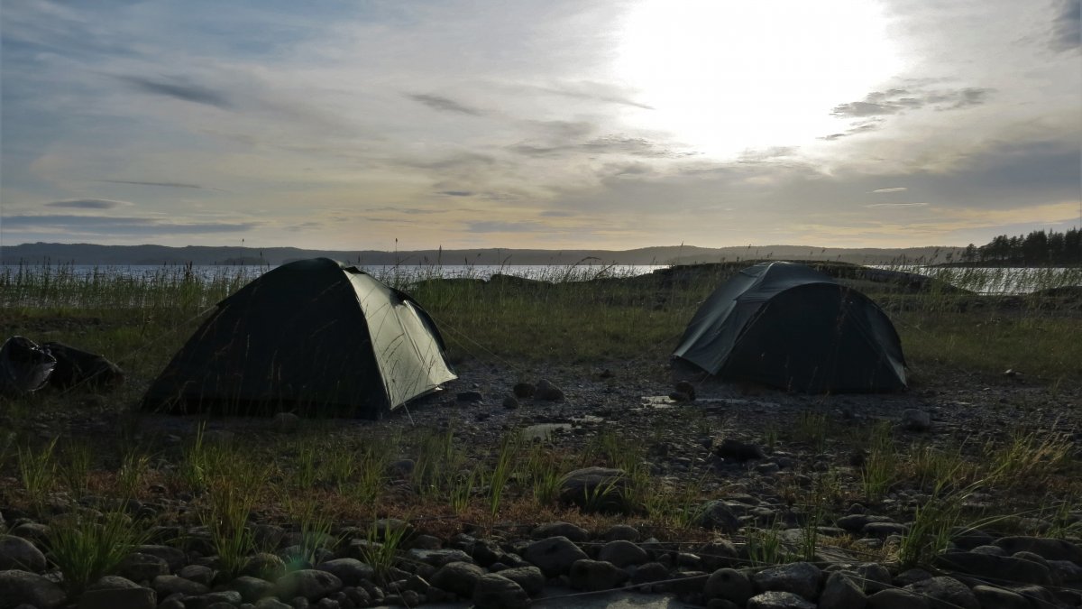 Als wir aufwachen, prasselt der Regen immer noch auf unser Zelt und wir beschließen, mit dem Frühstücken zu warten, bis es trocken(er) ist. Dauert leider bis halb zwölf. Bis dahin vertreiben wir uns die Zeit und den Hunger mit Spielen, Doppelkeksen und Gummibärchen. Irgendwann ist es dann trocken und wir können den modrigen Wald verlassen. Es gibt noch einen kurzen Brunch mit leckerem Eiweißbrot auf dem Felsen direkt am Wasser, dann geht es im Sonnenschein weiter. Zuerst kommen wir gut voran, doch als wir aus der windgeschützten Bucht dem offenen See näherkommen, geht es kaum noch voran. Für 20 m brauchen wir durch Wind und Wellen 20 min. Alleine ist das Kanu so kaum zu steuern und wir treiben immer weiter auseinander. Auf dem See komme ich dann irgendwann gar nicht mehr gegen die Wellen an und versuche nur noch, das Kanu senkrecht zu den Wellen zu drehen, damit es nicht so leicht kentern kann. Eigentlich wollten wir gegen den Wind weiter Richtung Süden fahren, haben aber keine Chance und werden an einen Kiesstrand gespült. Völlig am Ende ziehen wir die Kanus an Land und rufen beim Scandtrack-Team an, ob der Weg von uns aus bis zum Camp morgen zu schaffen ist. Das soll zum Glück kein Problem sein und wir kriegen noch den Tipp, die Kanus mit zwei Ästen zu einem Katamaran zusammenzubinden, da man so auf jeden Fall kentersicherer ist und niemand allein fahren muss. Beruhigt bauen wir alles auf und merken mit jeder Minute mehr, wie schön der Ort ist, an den wir aus Versehen angespült wurden. Der Sonnenuntergang macht den Abend perfekt. Unsere Zelte stehen direkt am Strand und beim Einschlafen hört man das Wellenrauschen.