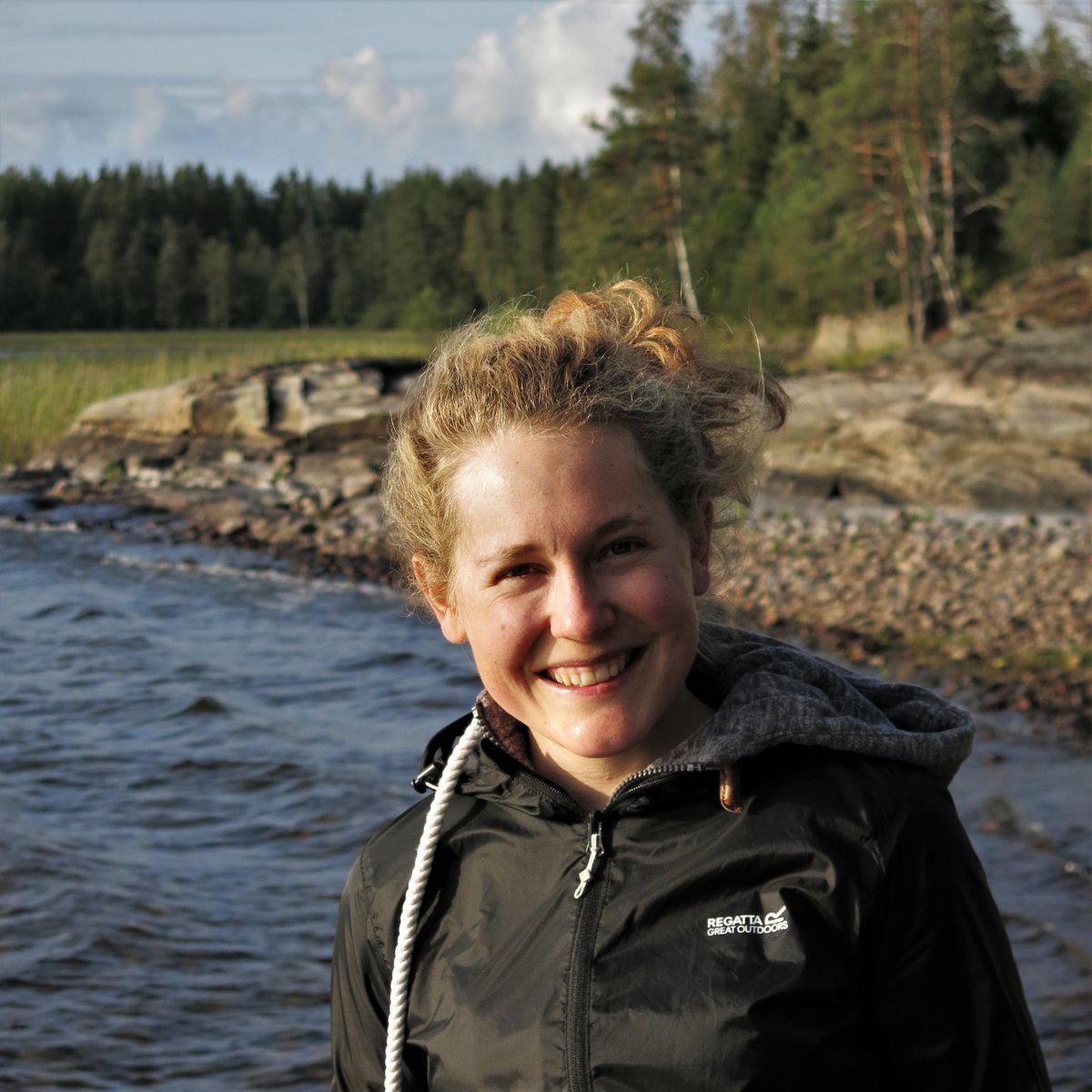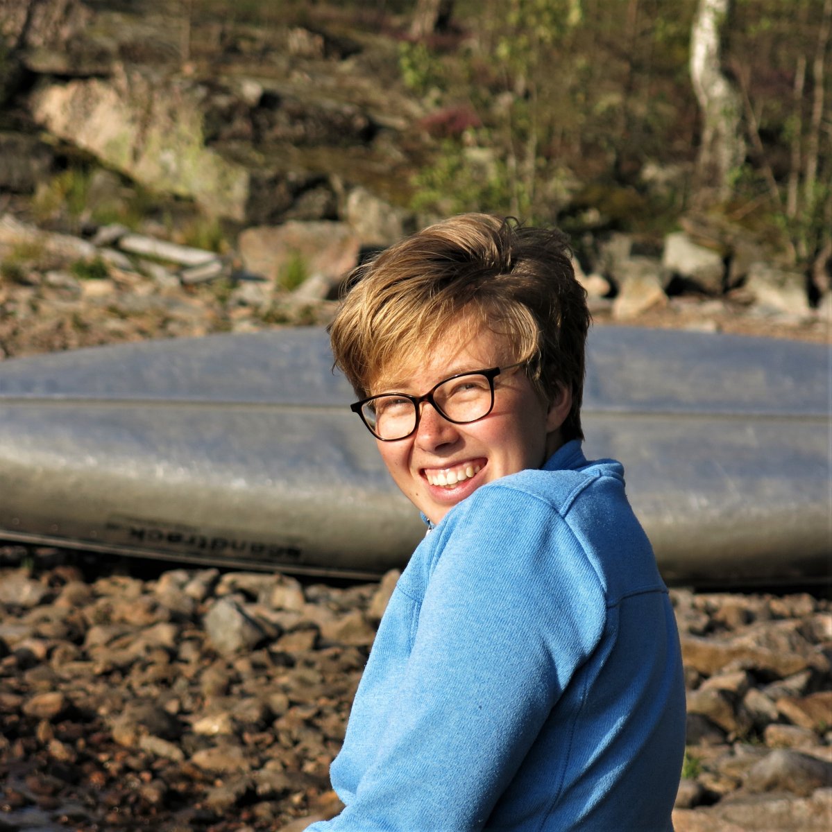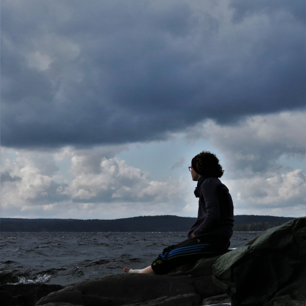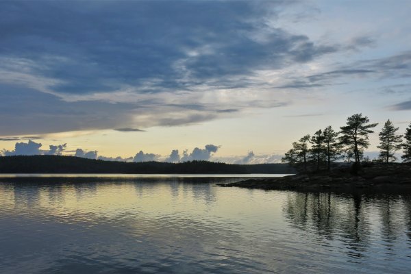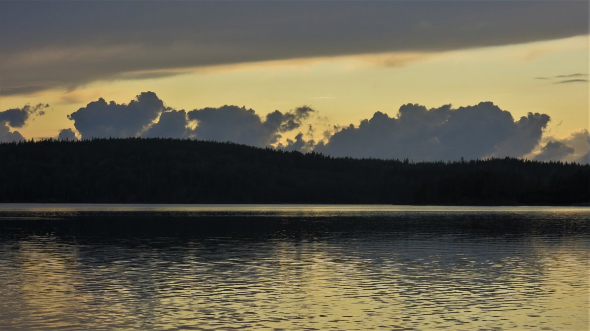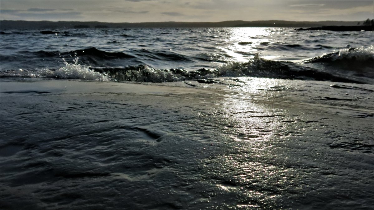 Als wir aufwachen, prasselt der Regen immer noch auf unser Zelt und wir beschließen, mit dem Frühstücken zu warten, bis es trocken(er) ist. Dauert leider bis halb zwölf. Bis dahin vertreiben wir uns die Zeit und den Hunger mit Spielen, Doppelkeksen und Gummibärchen. Irgendwann ist es dann trocken und wir können den modrigen Wald verlassen. Es gibt noch einen kurzen Brunch mit leckerem Eiweißbrot auf dem Felsen direkt am Wasser, dann geht es im Sonnenschein weiter. Zuerst kommen wir gut voran, doch als wir aus der windgeschützten Bucht dem offenen See näherkommen, geht es kaum noch voran. Für 20 m brauchen wir durch Wind und Wellen 20 min. Alleine ist das Kanu so kaum zu steuern und wir treiben immer weiter auseinander. Auf dem See komme ich dann irgendwann gar nicht mehr gegen die Wellen an und versuche nur noch, das Kanu senkrecht zu den Wellen zu drehen, damit es nicht so leicht kentern kann. Eigentlich wollten wir gegen den Wind weiter Richtung Süden fahren, haben aber keine Chance und werden an einen Kiesstrand gespült. Völlig am Ende ziehen wir die Kanus an Land und rufen beim Scandtrack-Team an, ob der Weg von uns aus bis zum Camp morgen zu schaffen ist. Das soll zum Glück kein Problem sein und wir kriegen noch den Tipp, die Kanus mit zwei Ästen zu einem Katamaran zusammenzubinden, da man so auf jeden Fall kentersicherer ist und niemand allein fahren muss. Beruhigt bauen wir alles auf und merken mit jeder Minute mehr, wie schön der Ort ist, an den wir aus Versehen angespült wurden. Der Sonnenuntergang macht den Abend perfekt. Unsere Zelte stehen direkt am Strand und beim Einschlafen hört man das Wellenrauschen.