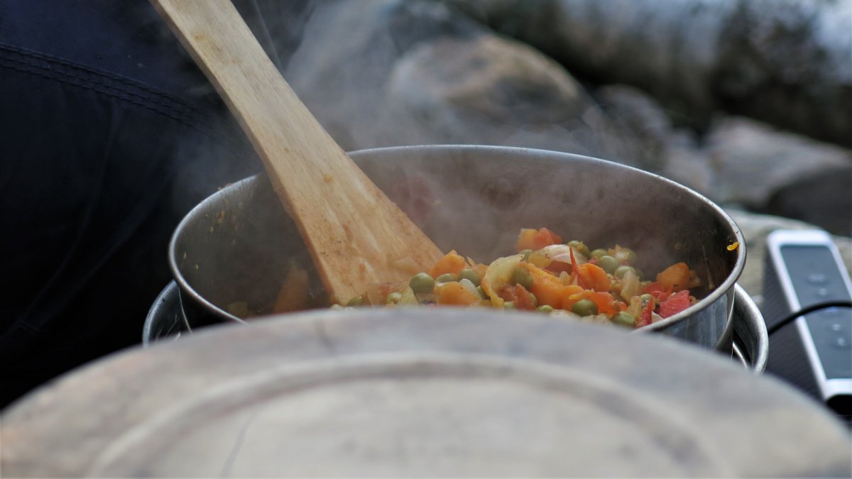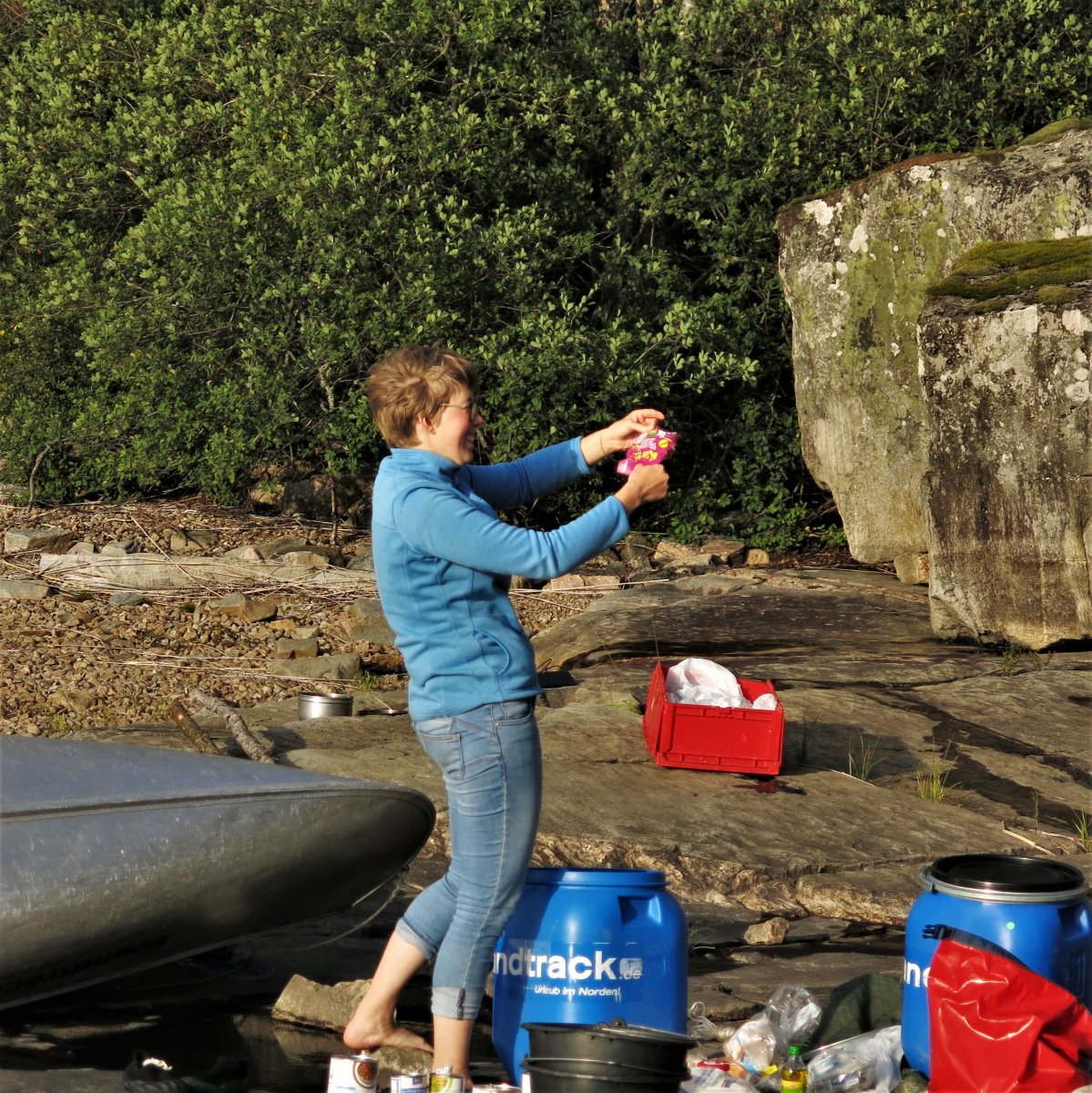 Als wir am nächsten Morgen aus unseren Zelten kriechen, sind Maurice und Hiva schon aufgebrochen. Der Wind hat zum Glück nachgelassen, trotzdem lassen wir uns Zeit mit dem Frühstück und es gibt zur Abwechslung kein Eiweißbrot und Müsli, sondern selbst gebackene Brötchen (Rezept Stockbrotteig) mit Rosinen und Nüssen oder Salami und geschmolzenem Käse. Pappsatt packen wir die Kanus, allerdings donnert es immer wieder um uns herum. Zwischen einem abziehenden und einem aufziehenden Gewitter bei strahlendem Sonnenschein verlassen wir die Felseninsel und paddeln in den Seearm nach Norden. Wir haben Glück, das zweite Gewitter zieht vorbei, wir werden nur einmal sehr kurz sehr nass. Der Wind ist in den kleineren Buchten gar kein Problem mehr und wir paddeln gemütlich die bisher längste Strecke, bis wir ganz im Norden einen schönen Sandstrand finden. Jetzt fühlt es sich doch eher an wie Mittelmeer und zum ersten Mal packen wir die kurzen Hosen aus. Als Abendessen gibt es Couscous mit Tomatensoße und viel Knoblauch und zum Nachtisch gegrillte Marshmallows. Nach einer halben Stunde stellen wir zwar fest, dass wir die eigentlich alle nicht so richtig mögen, können aber trotzdem nicht aufhören. Das Wetter ist perfekt zum Wäschetrocknen und abends haben wir fast zum ersten Mal gar keine nassen Sachen mehr. Abgespült wird am Strand und danach baden wir noch glücklich und ausgiebig 3 min im eiskalten Wasser. Inzwischen riecht alles, was wir haben entweder nach Eukalyptus (Dr. Bronners 100.000 in 1), Knoblauch oder Wald. Ein Traumtag mit einem noch traumhafteren Sonnenuntergang und ganz ohne Eiweißbrot.