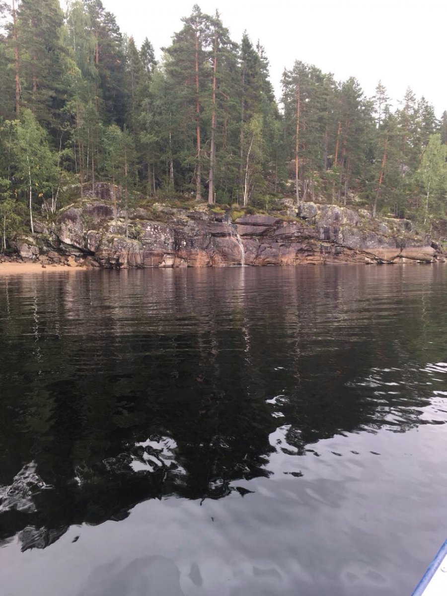 Der Wasserfall war durch den andauernden Regen größer geworden und nun konnte man ihn deutlich sehen und auch hören. Schon wieder waren wir begeistert von seiner Schönheit und entschlossen die Insel hier zu erkunden, in der Hoffnung dass man sein Zelt aufschlagen konnte. Leider hatte unsere Suche nach einem Zeltplatz kein glück. Bäume und eine steile Klippe machten es uns nicht möglich hier unser Zelt auf zu stellen. Wir sahen uns an, somit mussten wir wieder raus, wieder gegen die Wellen kämpfen und wieder weiter fahren. Unsere Kräfte würden nicht lange halten, dessen waren wir uns bewusst doch wir mussten versuchen alles zu geben und so machten wir uns wieder auf den Weg. Es ging wieder auf den See, wir hielten uns wie gewohnt an Ufernähe auf und paddelten. Ich weiß dass wir an diesem Tag alles gegeben habe und ich bin stolz auf meinen Partner und auf mich dass wir diesen Tag bewältigt haben.