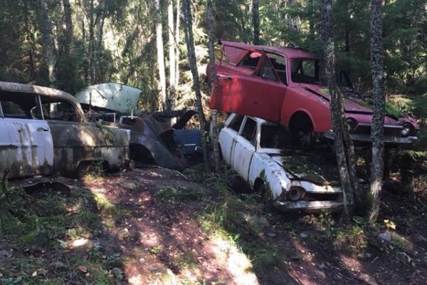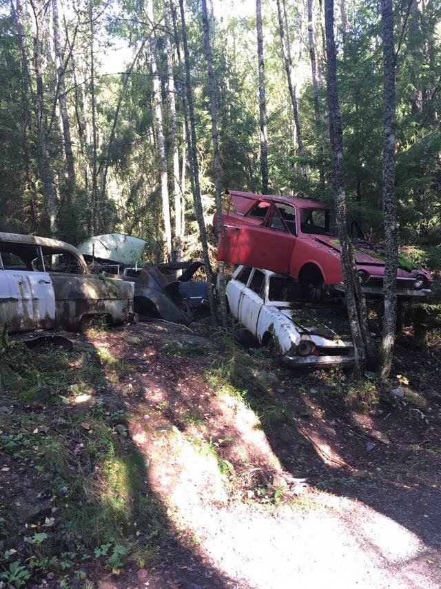 Angekommen auf der anderen Uferseite zogen wir unser Kanu etwas aus dem Wasser und achteten darauf dass es nicht von alleine weg schwimmen konnte. Nun machten wir uns auf den Weg. Heute war einer der schönsten Tage die wir hatten in Schweden. Es waren ca. 17 Grad und die Sonne schien. Das Wasser war ruhig und spiegelte sich. Einfach perfektes Wetter, warum war es bloß nicht die ganze zeit so ? Wenn wir nächstes Jahr noch mal diese Reise machen werden (wir wollen auf jeden Fall diese Reise noch ein Mal machen) dann werden wir es zu einem früheren Zeitpunkt machen, in der Hoffnung dass das Wetter dann besser ist. Naja genug über das Wetter geschrieben, da waren wir also, auf dem Festland wo die Autos waren. Nachdem wir eine kleine Strecke von ca. 10 Minuten gelaufen waren kamen die ersten Autos mitten im Wald zum Vorscheinen. Es waren alte Autos wie man sie sonst aus den alten Filmen kannte. Sie waren mittlerweile auseinander genommen und verrostet. Hier und dort lagen einzelne Reifen herum und hier und dort stand ein Auto ohne Reifen. Es war ein sehr faszinierender Ort. Die Natur hatte die Autos schon voll in beschlag genommen und kleine Gebüsche wuchsen teilweise in ihnen.