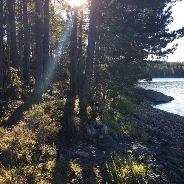 So wühlte ich mich aus meinem Schlafsack und stand auf. Es war relativ frisch draußen, doch in der Sonne war es angenehm warm. Alles um uns herum war still, man konnte die Natur um sich herum fühlen. Die leckten Wellen auf dem See schlugen gegen die Felsen der Insel. Ein Specht schlug gegen einen Baum, auf der Suche nach essen und ein Eichhörnchen huschte über unsere Köpfe weg. Vögel die an unserer Feuerstelle nach essbaren suchten flogen erschrocken zwei Meter weg und beobachten, wie wir uns langsam fertig machten.