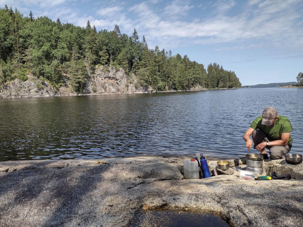 Am 19.07.2021 starteten wir 8 Uhr morgens durch die Enge bei Koperud weiter südlich am Dano 6 vorbei. Weiter ging es an der Fähre zwischen Sund und Jaren vorbei, bei gutem Wind und Wasserverhältnissen. Unser Weg führte nach Nössemark zum einkaufen, weiter an Strandon vorbei zur Insel Rägon wo wir südlich einen wunderschönen Platz gefunden hatten zum Mittagessen, schwimmen und ausruhen. Nach einer ausgiebigen Pause umrundeten wir die restliche Insel und fuhren wieder Richtung Norden wo wir bei stürmischer See und starken Gegenwind unsere Kräfte gut einteilen mussten. Wir ließen die Vogelschutzinseln und Rägon hinter uns. Erschöpft suchten wir uns einen Lagerplatz auf der Westseite des Sees gegenüber der Insel mit der Enge in der der Nähe von Korperud. Luftlinie waren es 22 km an diesem Tag. Heute gab es etwas kräftiges zum Abendessen, Kartoffeln mit gebratenem Schinken und Pilzen.