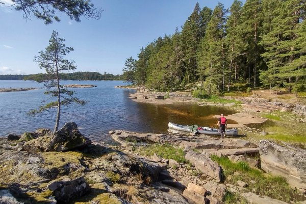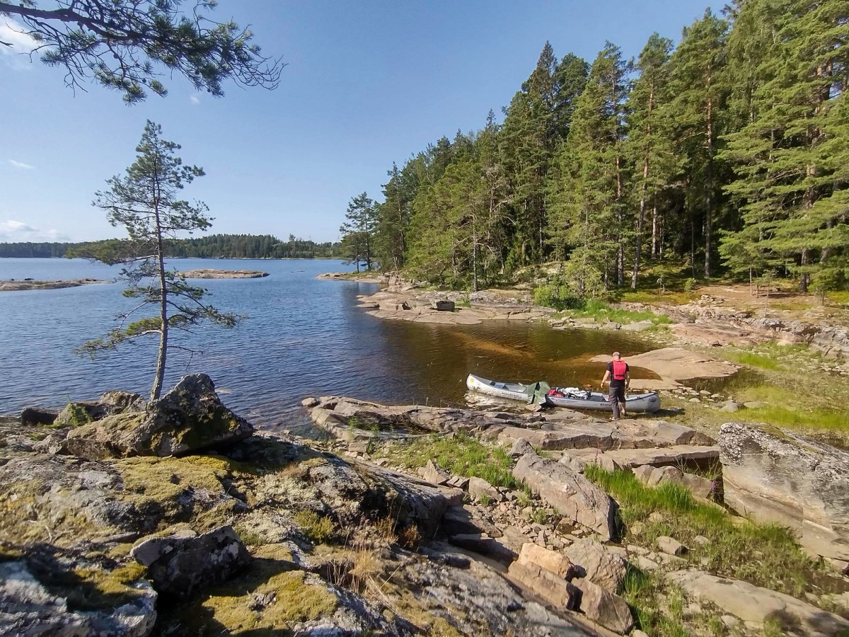 21.07.2021. Wir starteten um 7:45 Uhr Richtung Norden, vorbei an Dano 7 rechts vorbei an der Inseln Trollön links an der Insel Bryntorpson, wo wir wieder einen Barsch gefangen hatten. Nördlich an der Spitze von Hästön machten wir Mittag mit Beeren sammeln, kleiner Wanderung, wir bereiteten den Fisch mit Kartoffeln zu. Danach ging es weiter an der Vogelschutzinsel vorbei wo wir ein Fischadler mit ihren jungen beobachtet hatten. Südlich an Dano 18 in einer schönen Bucht schlugen wir unser Nachtlager auf. Wir sind ca. 16 km gefahren. Ohne Gepäck machten wir uns nochmals auf und erkundeten das Gebiet mit dem Kanu.