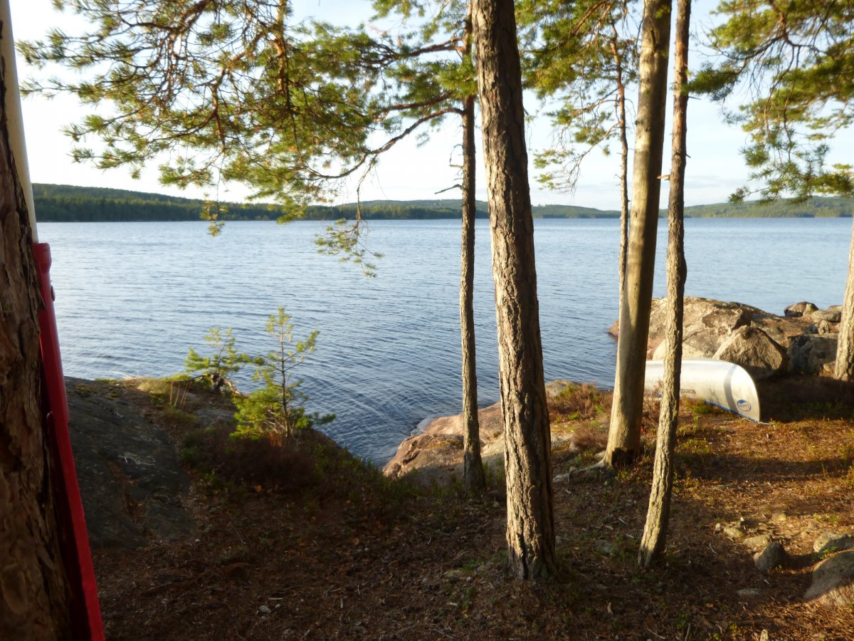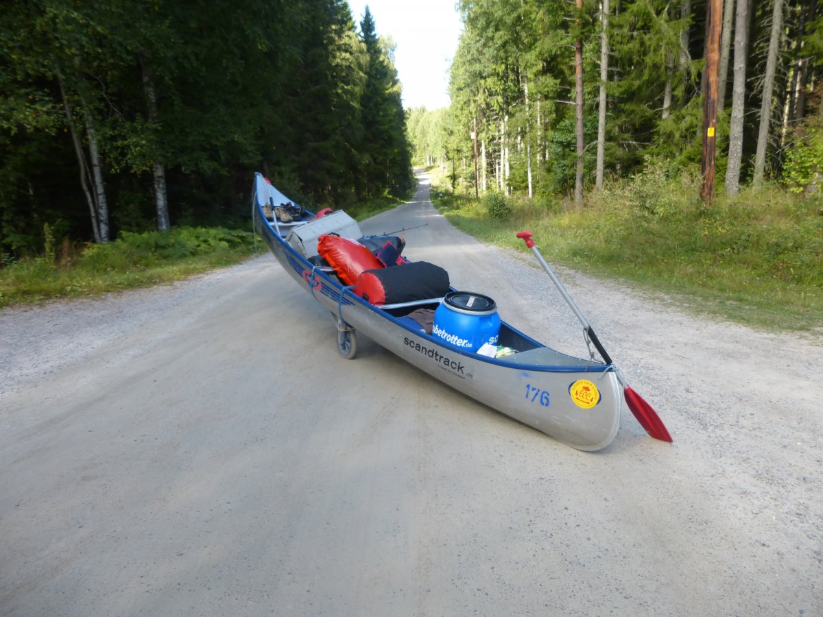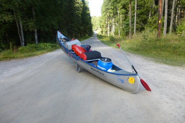 Gegen 11 Uhr sind wir dann endlich auch schon im Hauptcamp angekommen und bekamen jetzt auch was zum Essen und warteten noch auf unseren Buss der uns weiter ins abgelegene Glaskogen bringen sollte. das dauerte noch mal 1 1/2h bis wir dann auch unsere Ausrüstung entgegen nehmen konnten. Da wir schnell los wollten verstauten wir erstmal unsere Sachen ohne groß was zu sortieren im Boot und fuhren ( dank Kanuwagen) es zum See runter wo auch schon ein Pärchen vor uns mit dem ins wasserlassen des Bootes gekämpft hatte. Wir fuhren einfach mit dem Boot inklusive Wagen ins Wasser, die anderen staunten nicht schlecht wie einfach es gehen konnte.
