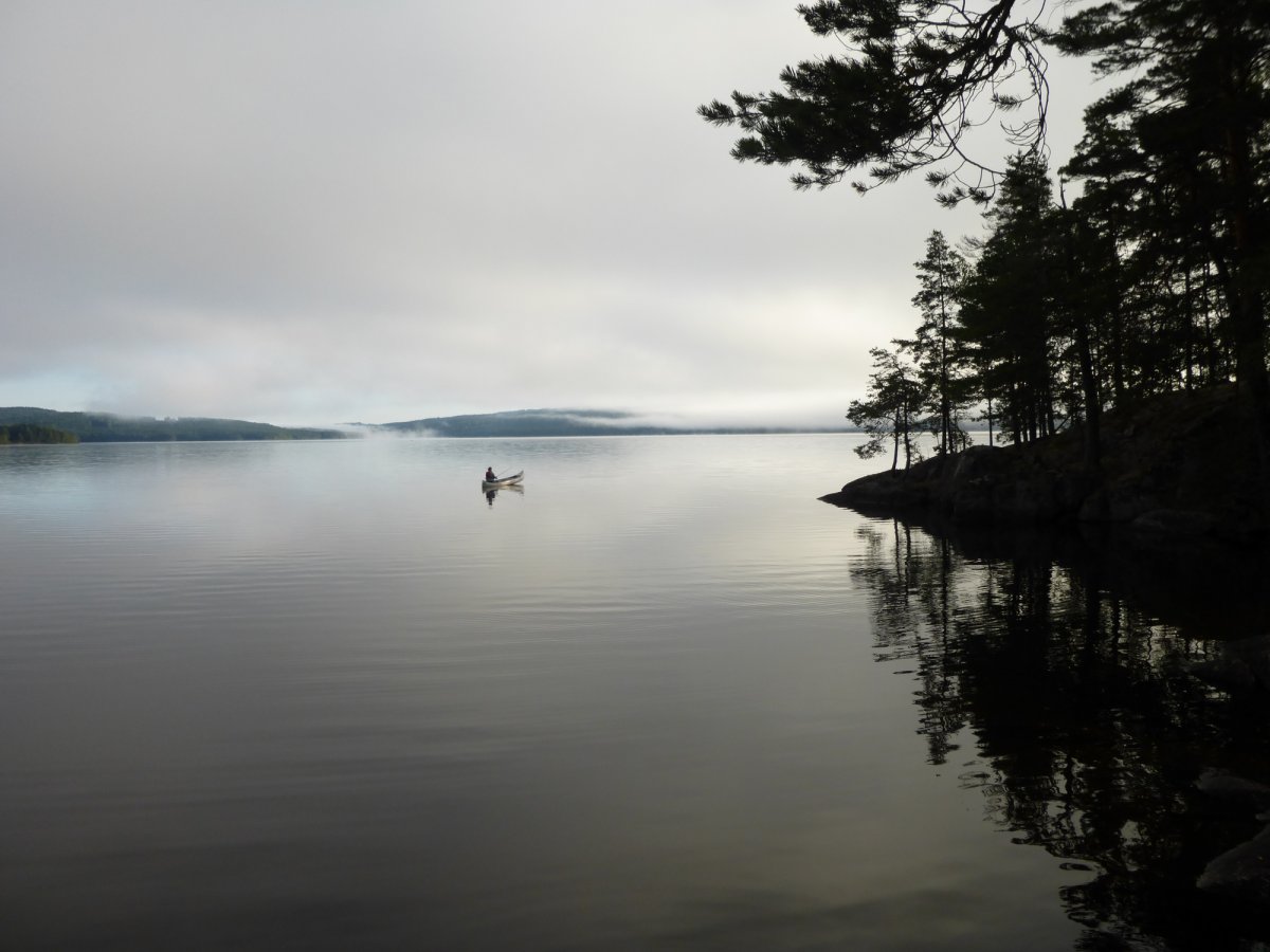 Die Nacht war etwas kalt aber das darf es ende August in Schweden schon sein und da wir ja auch schon früh ins Bett sind haben wir es geschafft noch denn Morgennebel zusehen und ich konnte meine ersten Angel versuche machen. Nach dem leckeren Frühstück packten wir unsere Sachen ins Boot und fuhren los wir wollten es schaffen das Boot auf denn größeren See um zutragen und uns dann da ne Windschutzhütte zu nehmen und dann am Abend nen Lagerfeuer machen und drüber kochen.Unterwegs kamen wir an eine der der wenigen typisch Schwedichenhütten vorbei wo wir auf dem Heimweg auch mal drin schlafen wollten. Nach langem suchen des anlege Platzes zum um tragen standen wir mit unserem Boot welchen wir schon auf dem Kanuwagen wieder hatten vor dem Berg. Ohja das schwere Boot da hoch zu bekommen war schon anstrengend, aber das muss man auch mal gemacht haben. Wir wollten nur noch dass Boot wieder ins Wasser bringen und haben nur das Wasser gesehen und haben darauf hin nicht mal mehr gemerkt das wir mit unserem Boot quer durch denn Wald fahren sind und nicht denn richtigen Weg genommen haben aber nachdem wir unten angekommen waren sind wir wieder ins Boot und haben uns unsere geplante Hütte gesichert. Am Nachmittag sind wir dann baden gegangen und haben die Natur genossen in einem klaren See wo man auch immer mal einen Schluck nehmen kannst und wieder kein Mensch auf dem Wasser. Dann wurde noch ein wenig geangelt und am Abend gab es dann ein Feuer, es gesellten sich noch 2 nette Männer zu uns die wir in der Woche noch öfter treffen sollten. In der Nacht gab es einen schönen Mondaufgang (siehe Foto).