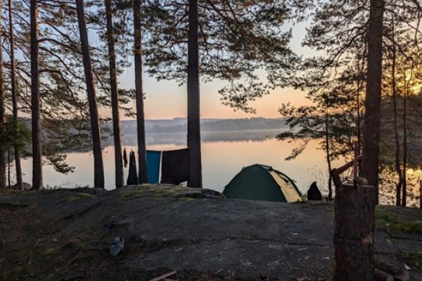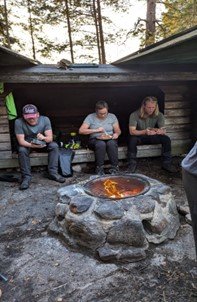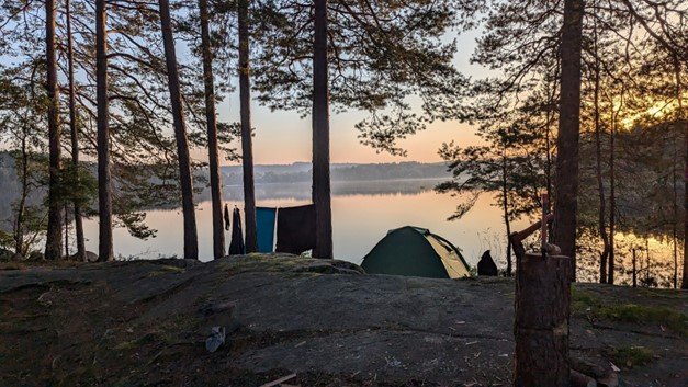 Nach einer kurzen Paddeltour erreichten wir unser Lager für die Nacht, einen idyllisch gelegenen Rastplatz von Scandtrack. Dort erwartete uns Mirko, unser letztes fehlendes Gruppenmitglied. Er war bereits eine Woche allein in Nordmarken mit dem Kanu unterwegs gewesen und nun noch eine weitere Woche mit uns. Als erfahrener Kanu-Wanderer, für den diese Tour bereits die dreizehnte war, hatte er für viele von uns wertvolle Tipps parat. Wir entluden die Kanus, bauten unsere Zelte und Hängematten auf und bereiteten unsere Verpflegung und die Feuerstelle für das Abendessen vor. Zum Abendessen gab es saftige Steaks und würzige Bratwürste, eine kleine Überraschung von Jens, unserem Gastgeber (Chef von Scandtrack). Nach dem Essen musste nur noch der Abwasch erledigt werden. Michi hatte leider ein medizinisches Problem und musste noch am ersten Abend von Arne (dem Sohn von Jens) mit dem Motorboot abgeholt und ins Krankenhaus gebracht werden. Nach diesem kleinen Schock saßen wir noch eine Weile am Feuer bei guten Gesprächen zusammen. Die Stille der Natur, unterbrochen nur vom Plätschern des Wassers, war das einzige, was wir hörten, als wir ins Bett gingen.