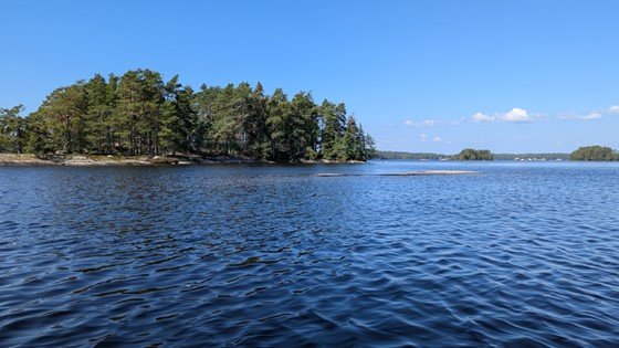 Nach dem Frühstück machten wir uns auf den Weg. Ein Teil der Strecke war uns bereits bekannt, denn wir passierten den Rastplatz, der am Vortag besetzt gewesen war. Nach einer kurzen Überquerung des Sees paddelten wir entlang der Uferlinie. Am Horizont tauchte die Silhouette eines kleinen Ortes auf: Lennartsfors.