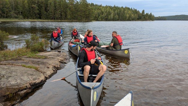 Unsere abenteuerliche Kanutour begann am 30. August 2024 mit einer langen Busfahrt von Leipzig über Berlin und Lübeck nach Schweden. Nach zwei entspannten Fährüberfahrten erreichten wir nach 17 Stunden schließlich unser Ziel, das Basiscamp von Scandtrack in Höglund, Nordmarken. Im Basiscamp angekommen, lernten wir die anderen Teilnehmer und unseren erfahrenen Guide Holger kennen. Nach einer kurzen Einweisung erhielten wir unsere Ausrüstung und die für die gesamte Tour ausgelegte Verpflegung. Die Vorfreude war spürbar, als wir unser Equipment und unsere Verpflegung entgegennahmen. Die Lebensmittel wurden sorgfältig in blauen Transportfässern verstaut, während unsere persönliche Ausrüstung in wasserdichte Packsäcke kam. Nachdem wir alles in unsere Kanus geladen hatten, bekamen wir noch eine kurze Einweisung in Paddeltechnik und Steuerung der Kanus und machten uns dann auf den Weg zu unserem ersten Nachtlager. Die erste Herausforderung bestand darin, das Gleichgewicht der beladenen Boote zu finden. Doch mit etwas Übung und gegenseitiger Hilfe meisterten wir auch diese Aufgabe.