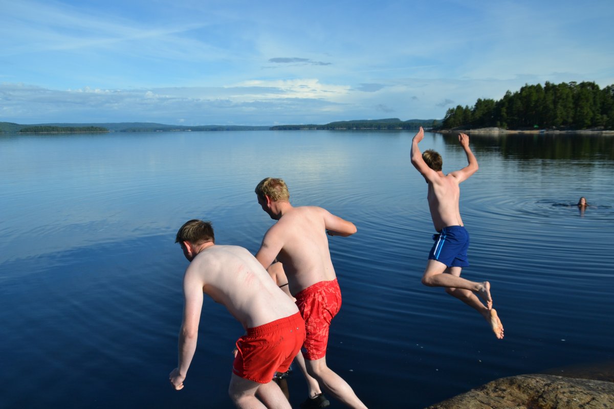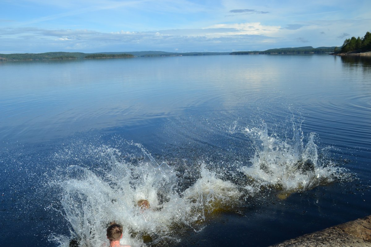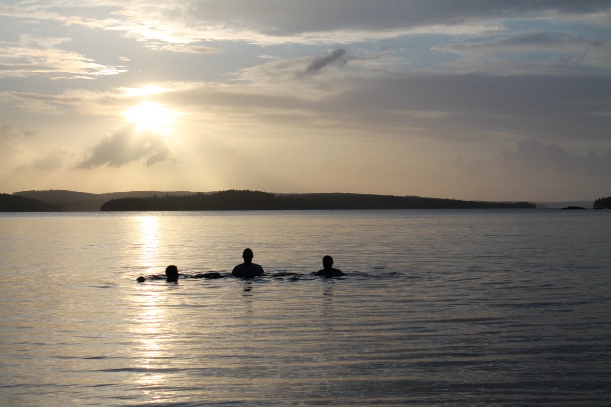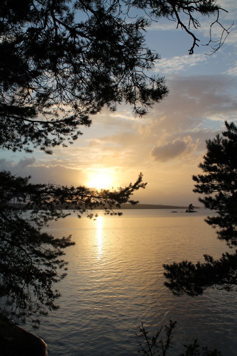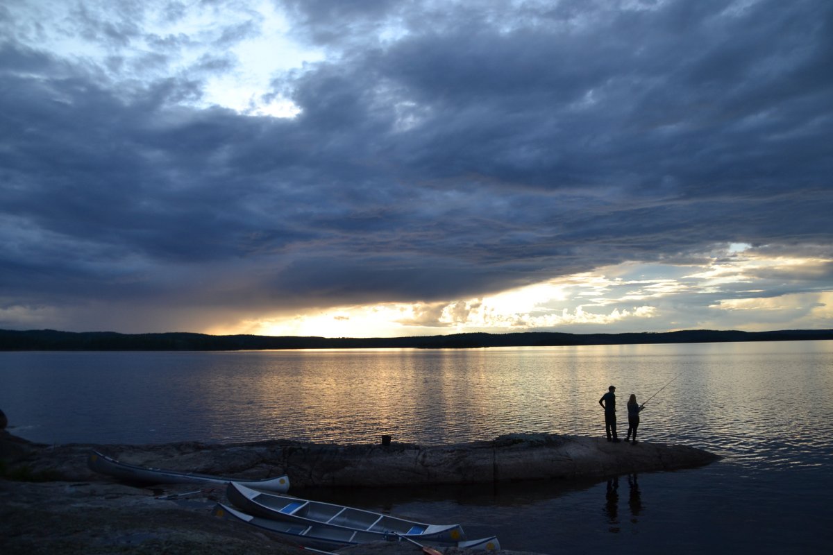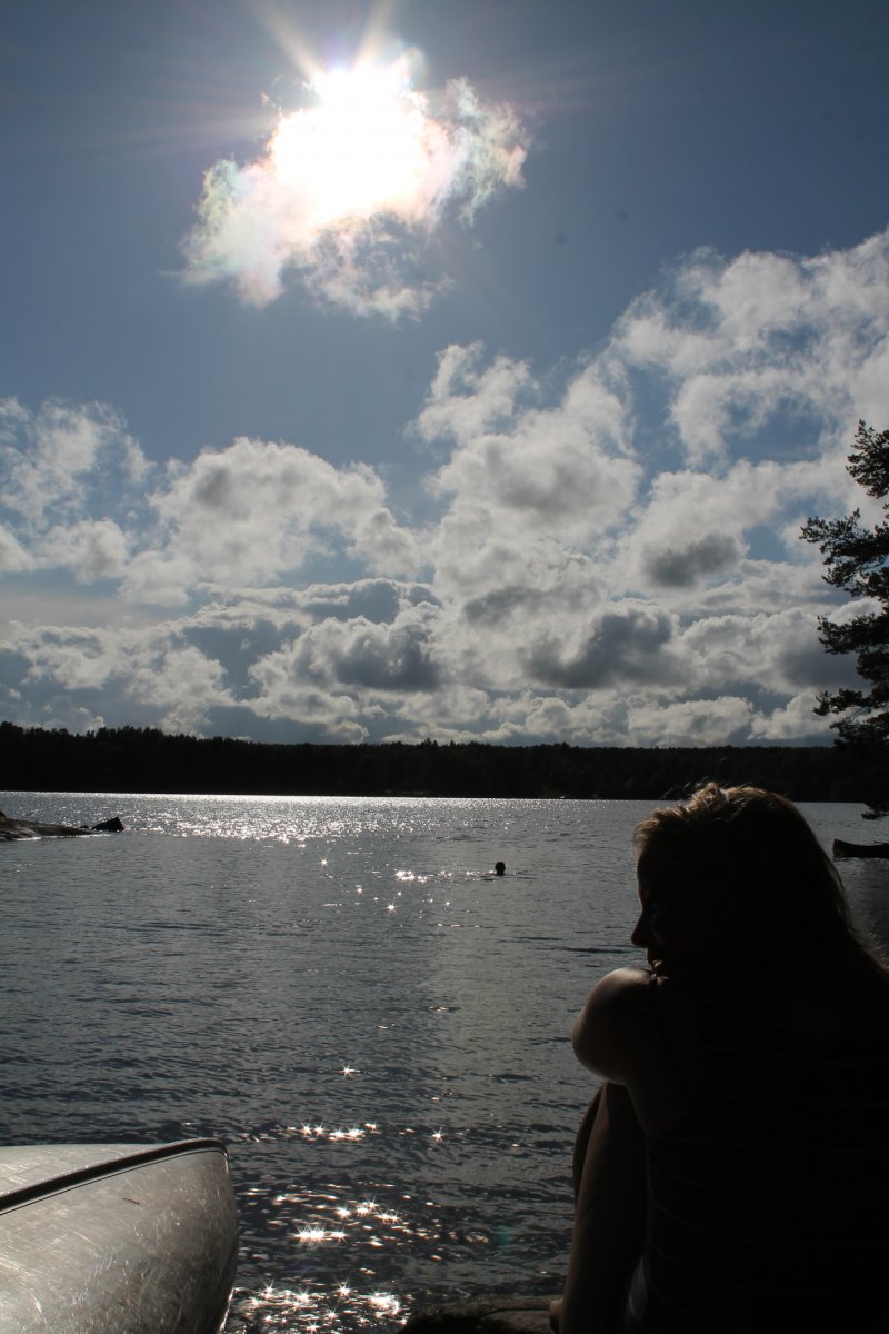 Erster Halt wird erstmal ganz im Sinne des Jedermannsrecht (oder zumindest fast) in einer kleinen Bucht gemacht. Nur leider darf hier kein Feuer gemacht werden. Beschlossen wird, demnächst wird früher aufgebrochen um sich offizielle Lagerplätze zu reservieren auf denen dann auch der Feuerteufel ein wenig zündeln kann. Denn dass ein Feuer und eine kleine Blockhütte nötig sind, merken wir spätestens als wir bei strömenden Regen unter unserer Plane hocken, die Männer sich ins Zelt verkriechen und nur der Fähnchenführer sich weigert, keinen Spaß zu haben und eisern unter der Plane ausharrt und sich des Lebens freut. Wenigstens Omas gute Linsensuppe schmeckt allen. Als das Schauer etwas nachlässt, kommen die Männer nach und nach aus ihren Zelten gekrochen, schließlich sollen abends die Fische besonders gut beißen. Mit Wobbler und co. wird auf Jagd gegangen… Am nächsten Tag wird das Camp geräumt und nach einer ordentlich langen Kanufahrt eine Feuerstelle angesteuert. Es wird direkt in den See gehüpft, die Männer fahren Angeln und es wird ein köstliches Kartoffel-Bohnen-Speck-Mahl zubereitet. Doch, oh nein was ist das? Ein „Feuer-Verbot-Schild“? Das kann nicht sein! Flugs wird Scandtrack angerufen und uns wird bestätigt, dass das Verbot aufgehoben wurde. Üilala, der Feuerteufel kann zuschlagen. Jedoch nur so lange bis wir Besuch von einem schwedischen Ehepaar bekommen (die aber ganz sicher Vorfahren im Ruhrpott haben) um sich über das Feuer zu beschweren. Wohl oder übel müssen wir das Feuer löschen, nicht ohne geheime Pläne zu schmieden was man theoretisch alles mit diesem Schild anstellen könnte...Der Mond scheint hell und der See ist ruhig als wir uns abends ins Zelt verkriechen, doch der Schein trügt…So sollte noch der ein oder anderen in darauffolgenden Nächten von Träumen heimgesucht werden, die von wegschwimmenden Zelten handeln. So sind nachts Teile der Gruppe mehr damit beschäftigt die Zelte vor dem aufkommenden Sturm zu beschützen als zu schlafen. Und auch die romantische Geste, das Zelt relativ Strandnah aufzustellen, sollte sich als nicht allzu positiv erweisen…