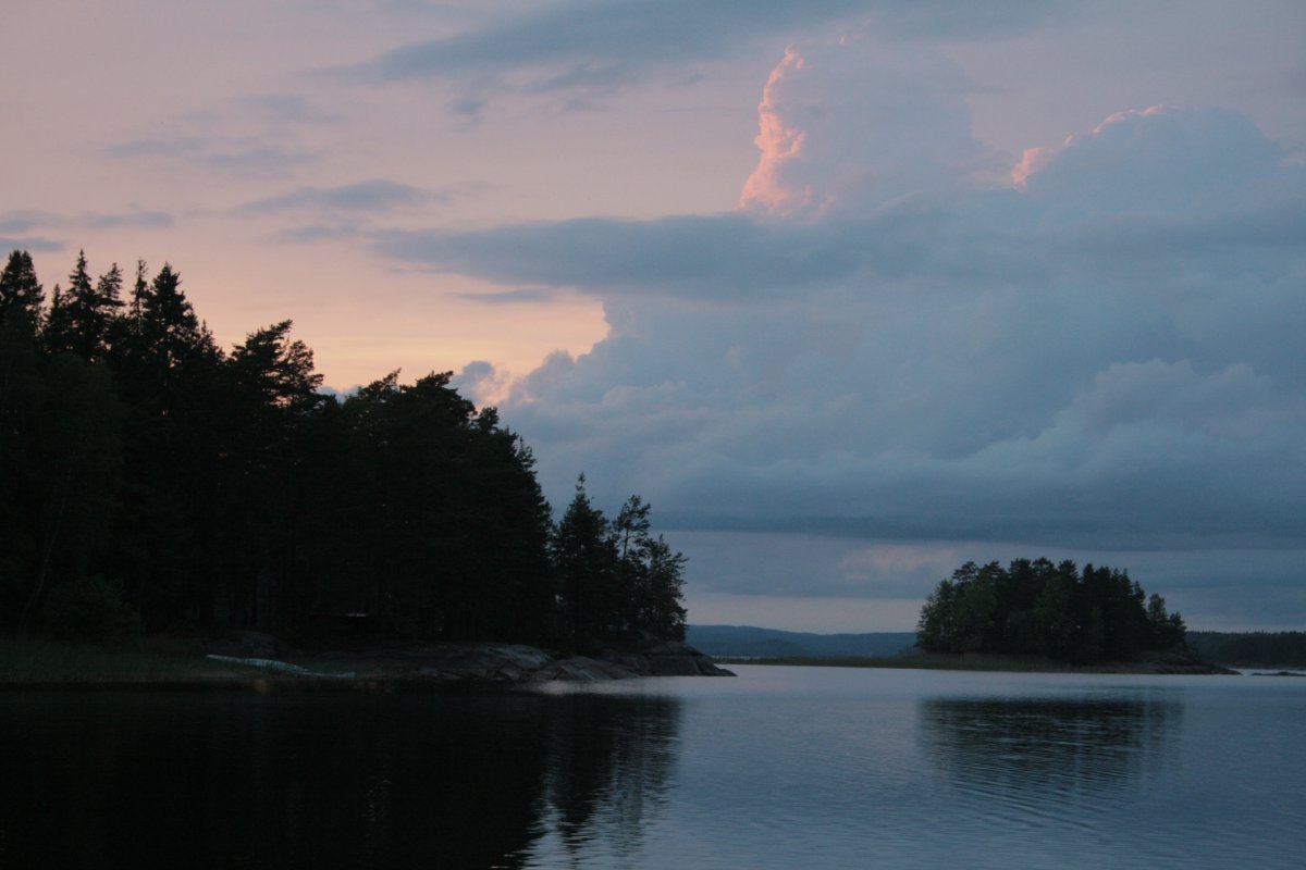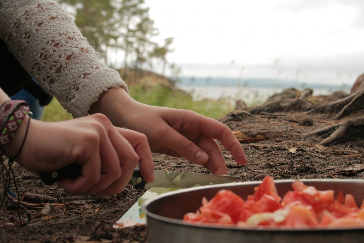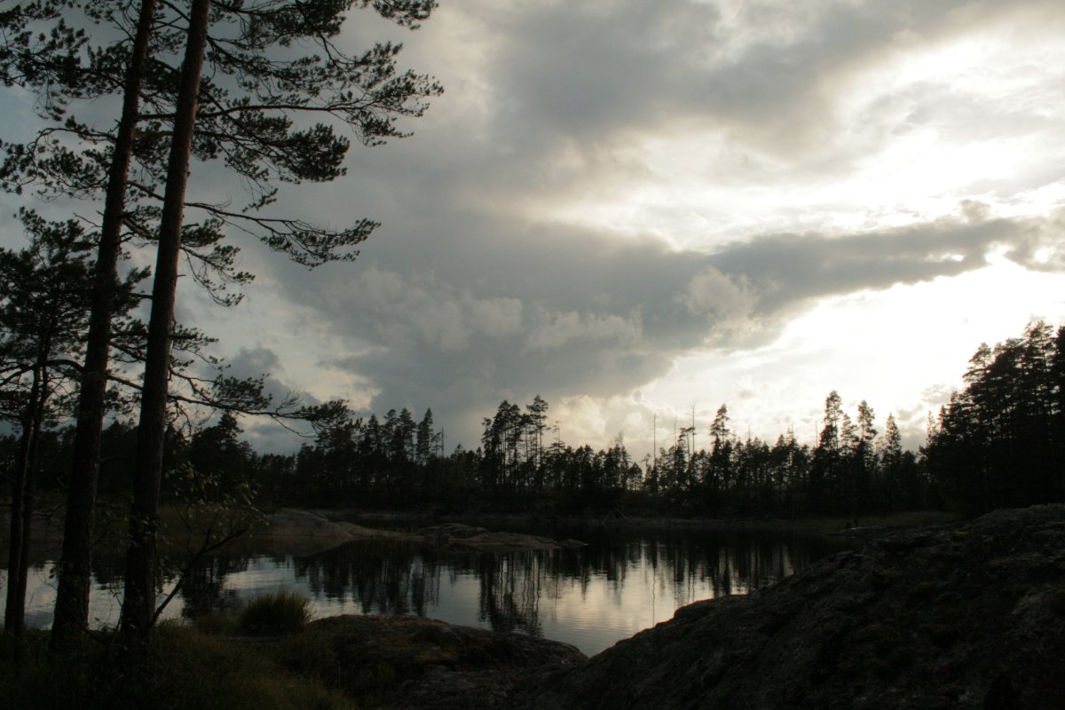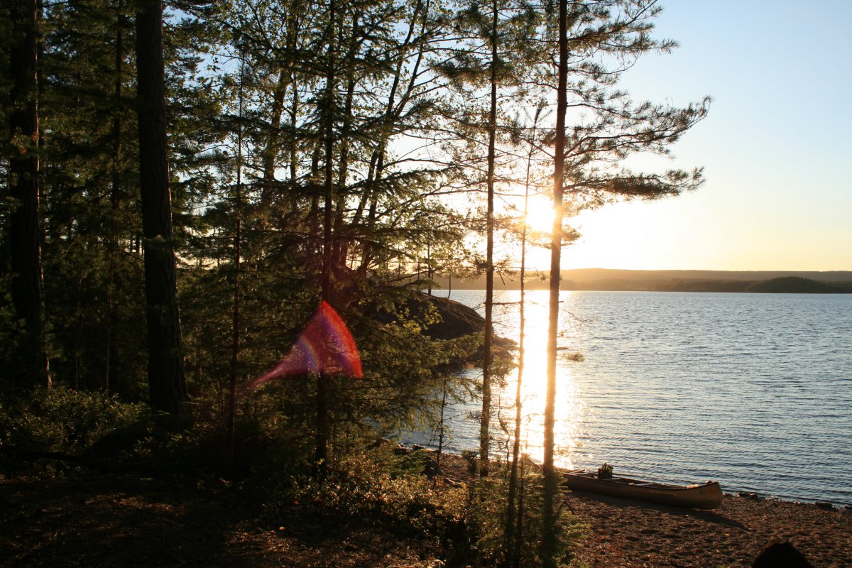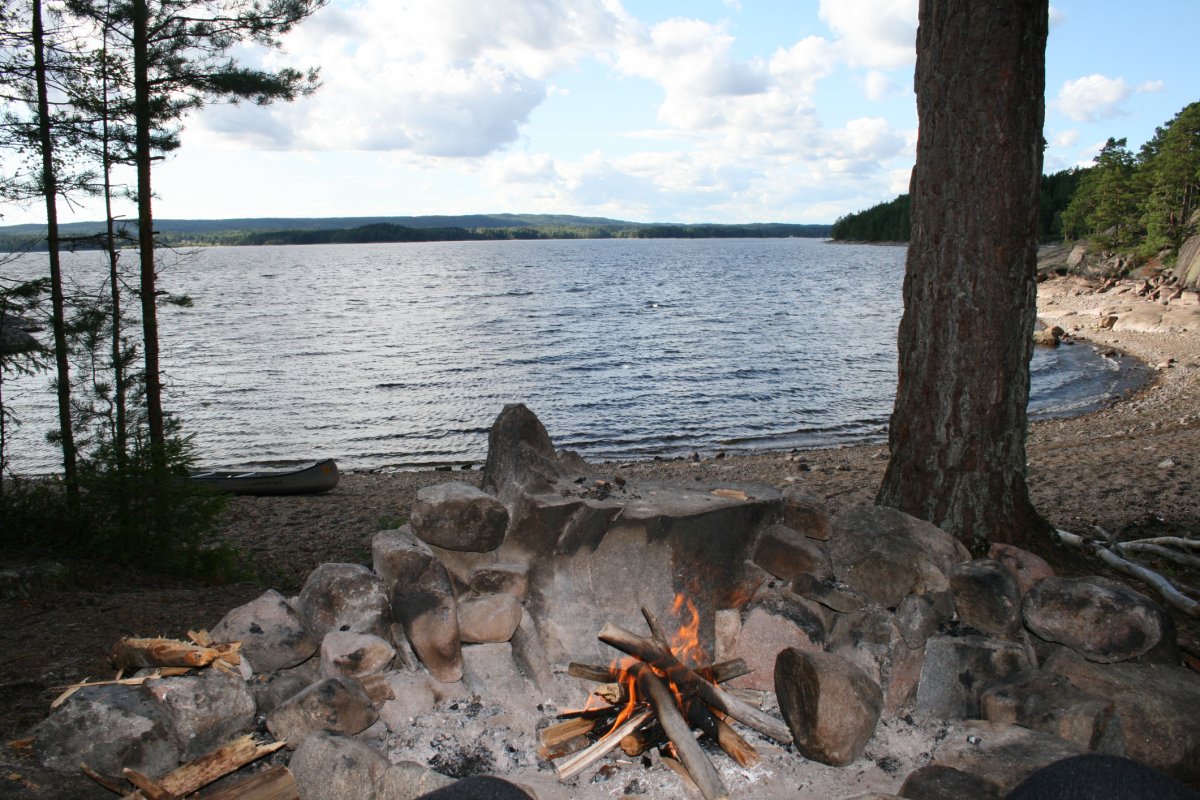 Wir bauten unser Zelt auf, schleppten unsere riesige Proviant-Tonne, unsere Packsäcke sowie weiteres Hab und Gut zu unserem Campingplatz. Während mein Freund sich auf die Suche nach trockenem Feuerholz begab, machte ich mich an unserem Kocher zu schaffen. Mit der riesigen Auswahl an Proviant war es gar nicht so einfach, sich auf eine Sache festzulegen – zumal unsere Mägen bereits jetzt laut um die Wette grummelten. Kartoffeln, Reis, Nudeln, Gemüse? Gar nicht so einfach... Im Endeffekt entschieden wir uns für Nudeln mit einer Soße aus angeschmorten Zwiebeln und frischen Tomaten – aber was wir auch gegessen hätten – bei der Aussicht schmeckte alles gleich doppelt so gut. Während wir unsere Nudeln löffelten, sahen wir der orange-leuchtenden Sonne dabei zu, wie sie mit einem leisen Plopp hinter den weit in den Himmel ragenden Bäumen verschwand. Zum ersten Mal realisierten wir, dass wir wirklich und wahrhaftig angekommen waren – und, dass es nur noch uns und die Weite der Seen mit ihren kleinen Inseln und langen Ufern um uns herum gab. So fühlte sich Freiheit an, mit Kurs in Richtung Abenteuer.