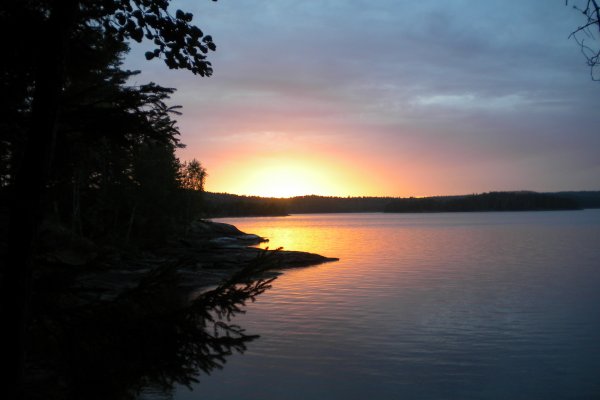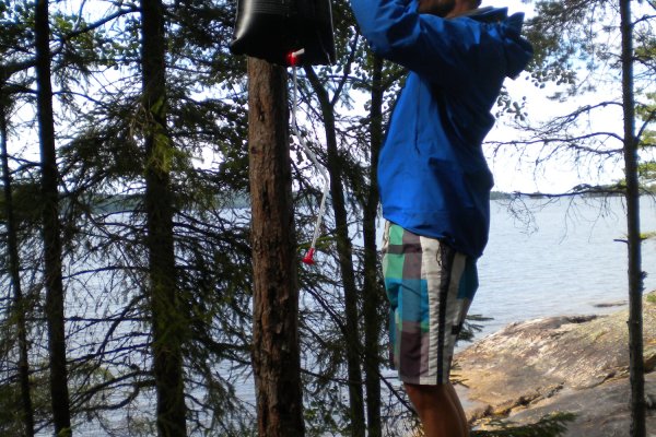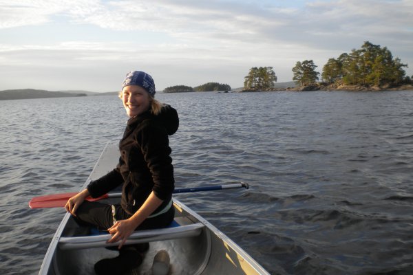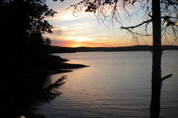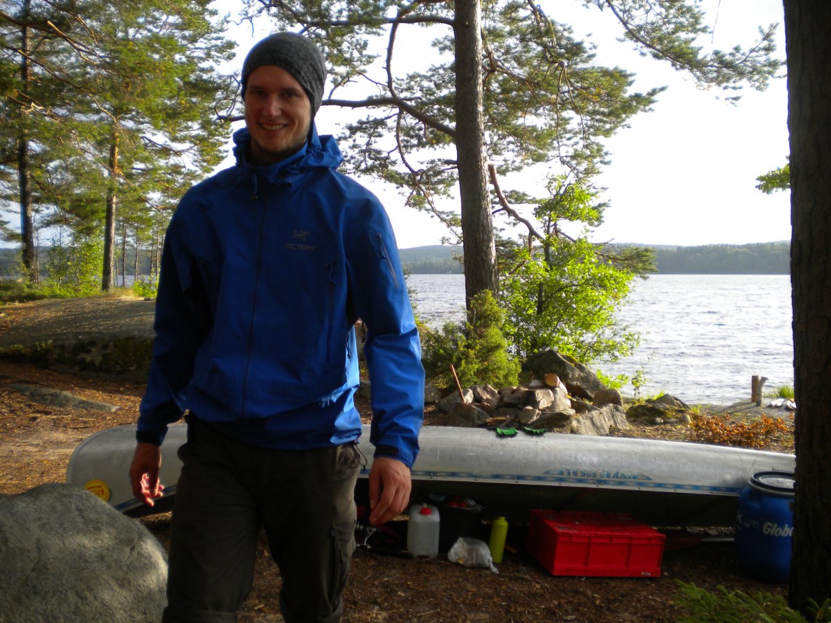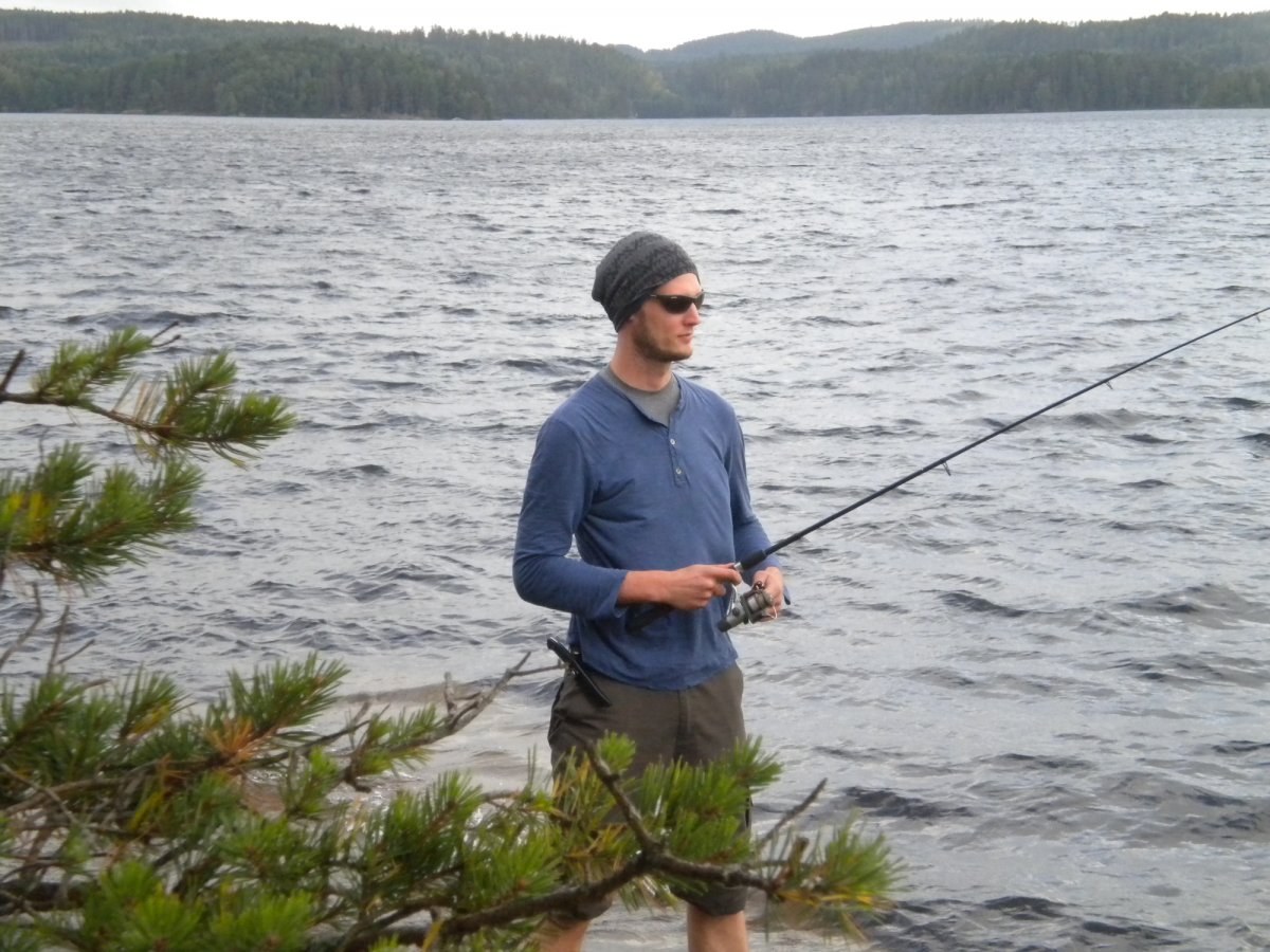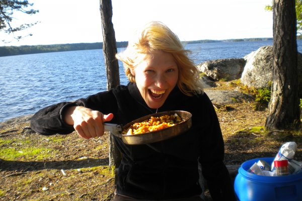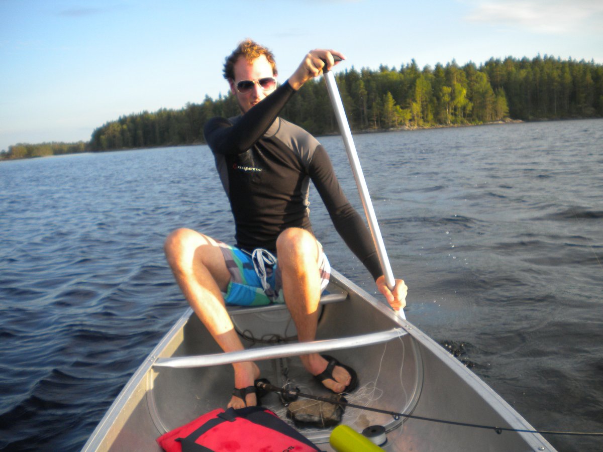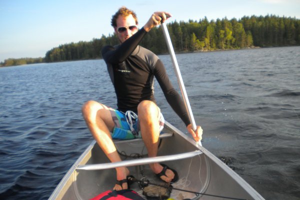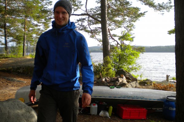 Achim ging dann wieder auf die Jagt nach Fischen. Diesmal fuhr er mit dem Boot auf die See. Damit er nicht weggetrieben wurde, bastelte er sich einen Anker aus Stein und Schnur. Zwei Angler fuhren mit ihrem Kanu an unserem Lager vorbei und zeigten uns stolz ihre Beute: Einen großen Hecht. Da waren wir echt neidisch. Später jedoch hatten wir dann doch noch einen Erfolg: Achim zogen einen Barsch aus dem Wasser. Am letzten Tag erfuhren wir dann von anderen Kanuten, dass sich die ganzen Hechte in den Norden der Seen verzogen hatten. Wie schade!