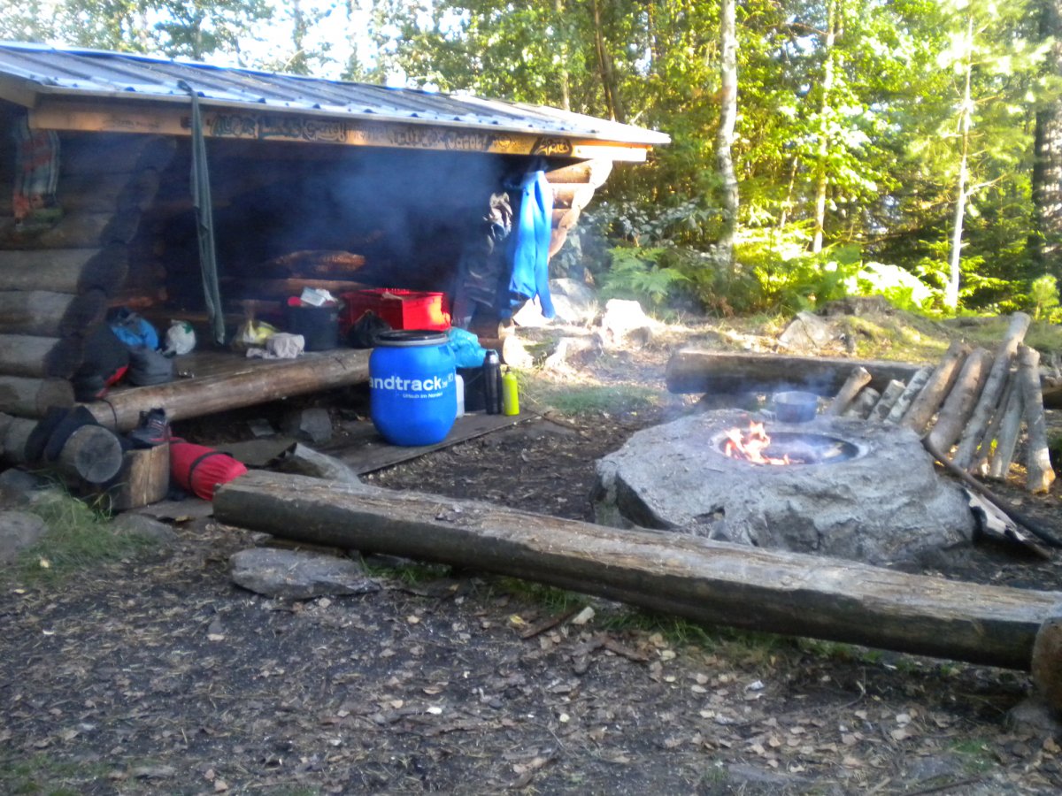 Die Landschaft zog langsam an uns vorbei. Wir verloren jegliches Zeitgefühl. Gegen 13 Uhr erreichten wir unser heutiges Ziel, eine Insel bei Gustavsfors. Da wir die ersten Ankömmlinge waren, freuten wir uns über die leere Schutzhütte. Das war unser erstes Mal in einer solchen Hütte – für uns ein besonderes Erlebnis ;-)