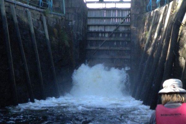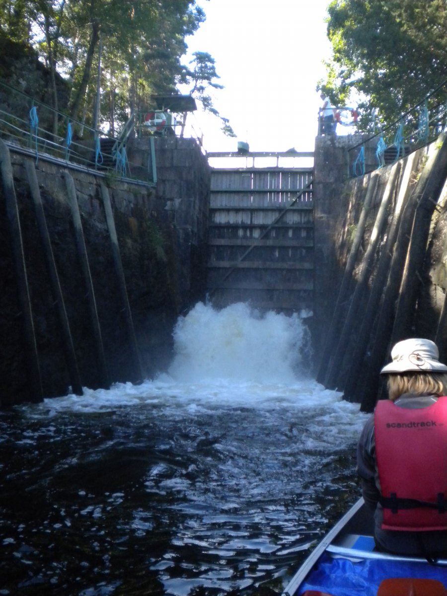 Früher als geplant kamen wir an der Destination in Lennartsfors an. Herzlich wurden wir vom Scandtrack-Team begrüßt. Kurz wurde der Tagesablauf erklärt. Nach einer Bockwurst mit Brötchen erhielten wir dann am Ausrüstungsverleih unsere komplette Ausrüstung inkl. Proviant. Da wir erst der zweite Reisebus an diesem Tag waren, ging die Ausgabe recht zügig. Nach dem Befüllen der wasserfesten Packsäcke und einem kurzen Ausrüstungscheck, machten wir uns auf den Weg zum Kanuverleih. Nach einer kurzen & knackigen Einführung ging es endlich auf's Wasser: In Richtung Schleuse bei Lennartsfors – auf den Lelang!