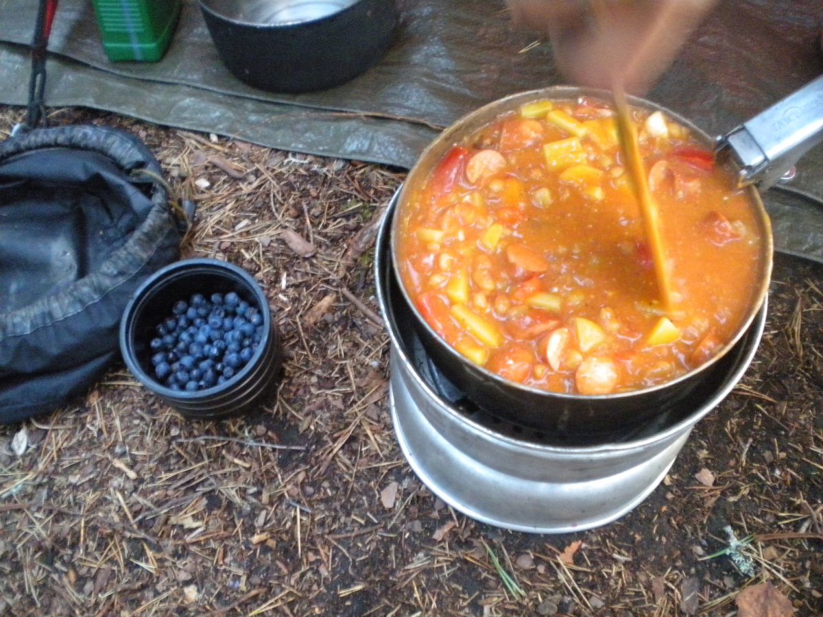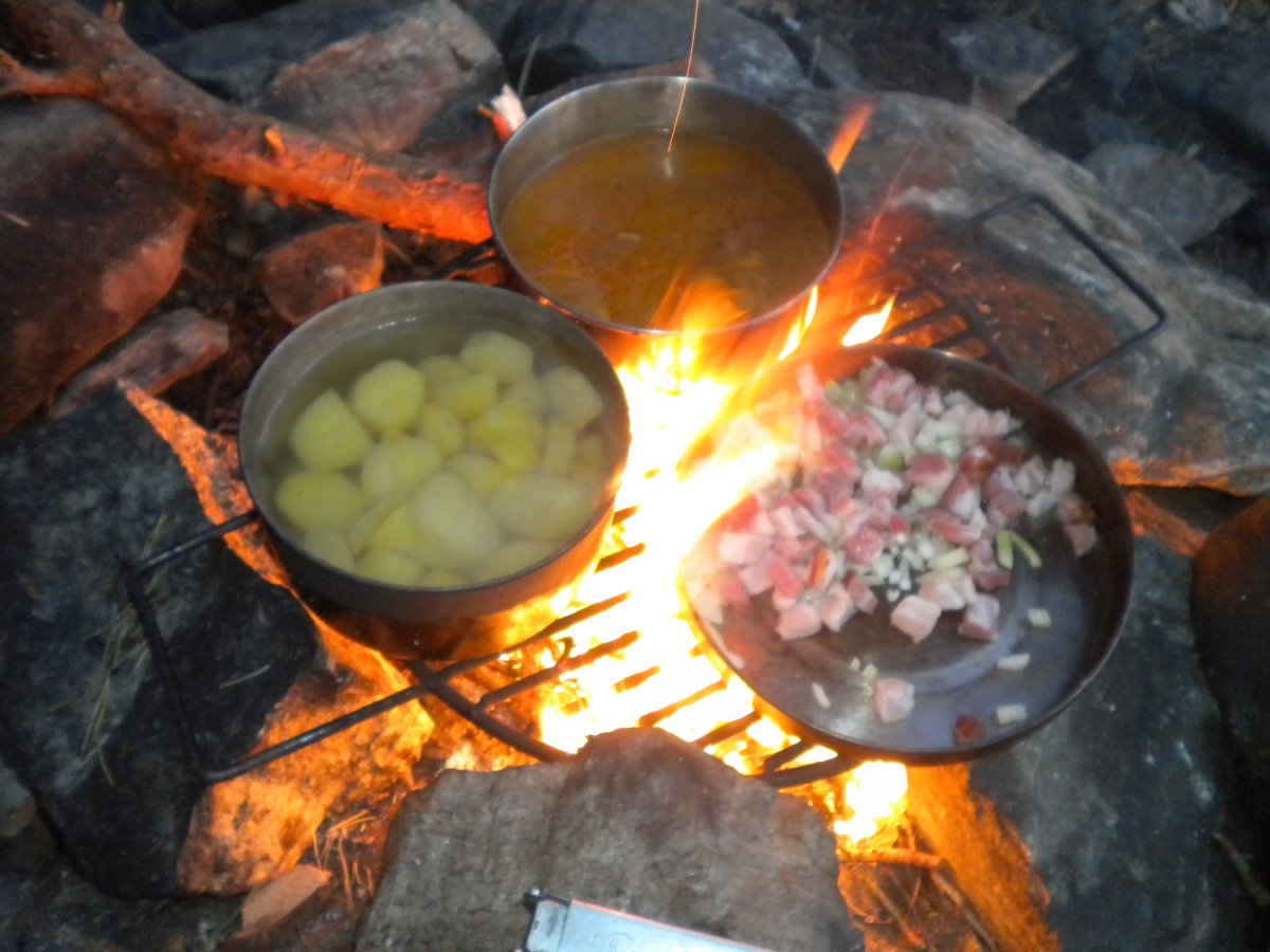 Im Anschluss an das Ausladen und Aufbauen unseres Lagers bemerkten wir unseren Bärenhunger. Wir kreierten aus Zwiebeln, Speck, Bockwurst, Baked Beans, Kartoffeln und Tomaten einen deftigen Eintopf, den wir „Beaked-Wurst-Eintopf“ nannten – leeeeeeecker!!