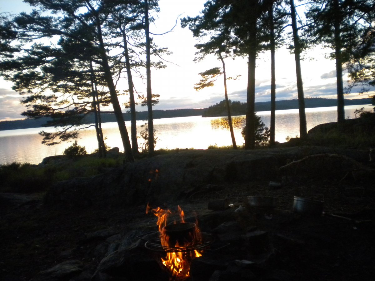 Wie schon von anderen Kanuten gehört, gab es hier viele steile Felsküsten, an denen man nur schlecht mit dem Kanu anlegen konnte. Vorallem sahen wir hier viel mehr Privatgrundstücke und auch der Boots-/ Schiffsverkehr war in dieser Region um einiges höher als am Lelang. Nach längerem Suchen, auf mehreren Inseln in Norwegen, paddelten wir dann doch einen guten Kilometer wieder zurück bis auf die Insel Trollön und fanden eine ruhige Bucht auf der norwegischen Seite. Von hier aus war weit und breit wieder nur die Natur zu sehen. Glücklicherweise lag hier so viel Holz, dass wir uns das Holzhacken sparen konnten.