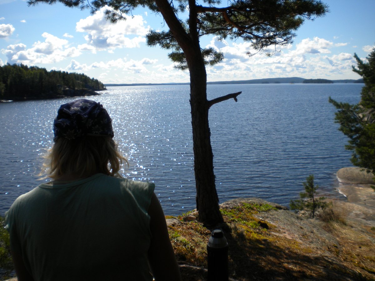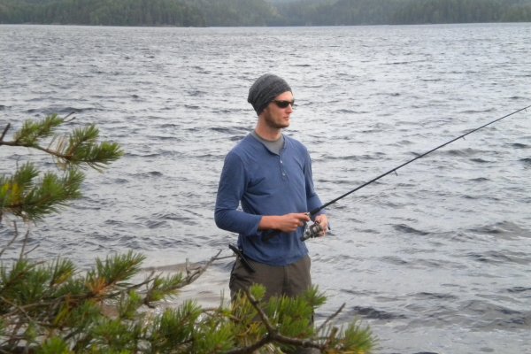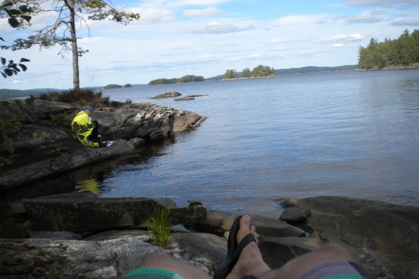 Nach dem gestrigen Paddelmarathon entschieden wir uns heute für einen Faulenzertag. Wir suchten uns einen windgeschützten Platz am Felsufer und relaxten: Lesen, Lernen, Angeln.