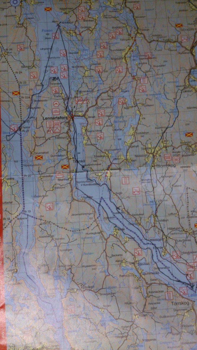 Der Tagesproviant: Tee, Wasser, Obst und Kekse wurde gut verstaut. Es ging 25 km von Gustavfors auf der anderen Seite des Lelang zurück auf den Foxen. Auf einer Landzuge in der Mitte des südlichen Endes des Foxen schlugen wir unser Nachtlager auf.