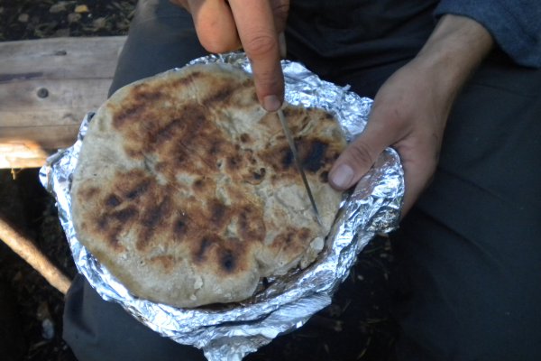 Vor Antritt der Reise gaben uns Freunde den Tipp Sauerteig mitzunehmen. Nun bereiteten wir den Teig zusammen mit Mehl und Wasser zu. Die Pfanne unseres Kochsetts musste als Backblech herhalten. Wir bastelten eine Konstruktion, von der die Pizza von jeder Seite Hitze abbekam. Zuerst entschieden wir uns für eine Salami-Pilze-Pizza. Die war so genial, dass wir direkt eine zweite „in den Ofen“ schoben. Einfach nur lecker!