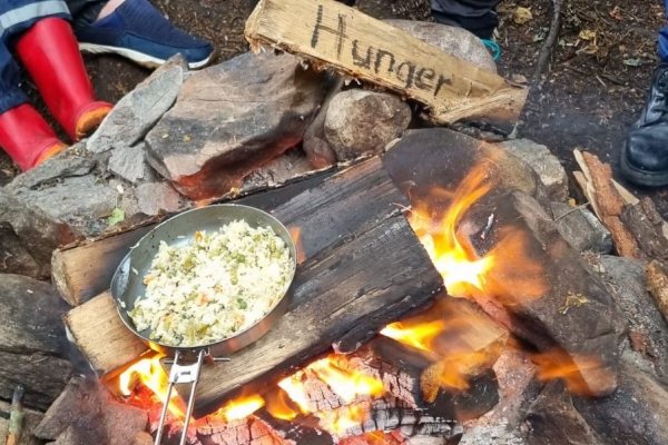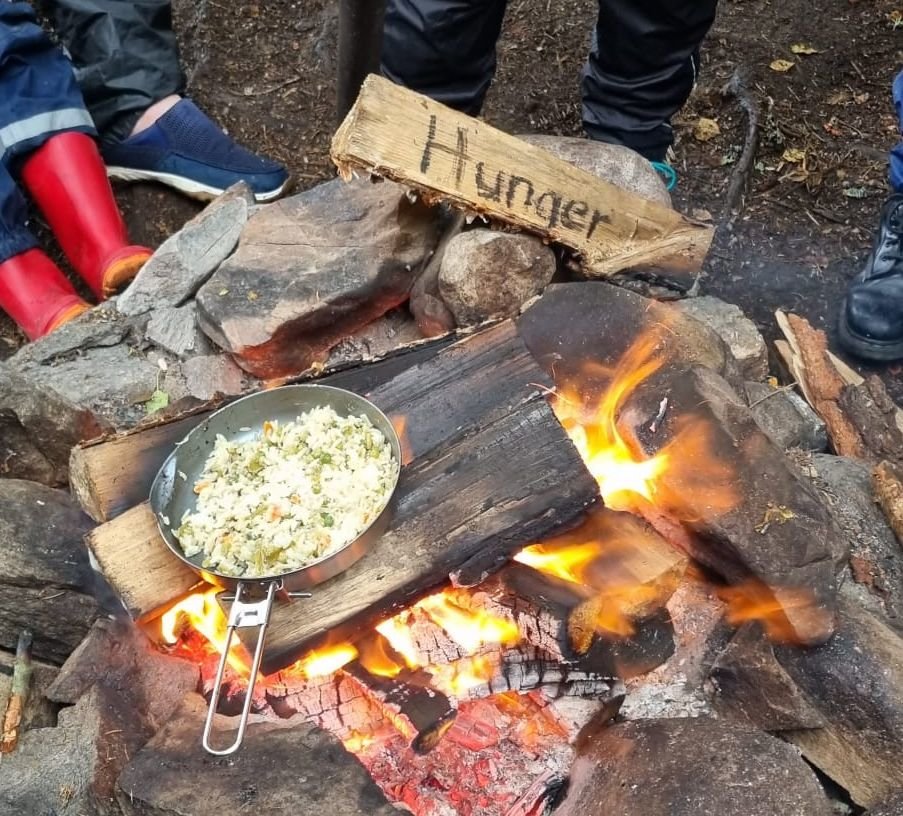 Der letzte Tag auf „See“ ist leider nass und kalt. Somit wird in Lenunsgshammer erstmal ein Regenschutz aufgebaut und danach die Zelte in einer kleinen Regenpause. Da der Treffpunkt am kommenden Morgen mit Arne um 8 Uhr anberaumt ist, entschließen sich viele Paddler die letzte Nacht direkt hier zu verbringen. So kochen wir alle gemeinsam die Reste unserer Reisgerichte und sitzen lange am Lagerfeuer, zwar mit Regen von oben, aber wenn man gut genug einheizt, ist es trotzdem auszuhalten. Der Regen wird nachts immer mehr und wird auch nicht aufhören bis wir wieder in Deutschlang sind. So packen und säubern wir unsere Ausrüstung am kommenden Tag im Regen, gehen ein bisschen Geocachen im Regen und warten auf den Bus im Regen, der uns zurück nach Höglund bringt. Diesmal kein Reisebus, sondern ein kleiner schwedischer Bus mit einem Fahrer, der einen etwas abenteuerlichen Fahrstil hat. Aber wir kommen, widererwarten, wohl behalten im Basiscamp an, wo wir mit vielen Anderen, geschützt vor dem Regen den Nachmittag warten, Kekse essen, Uno spielen und einen Elchburger verspeisen.