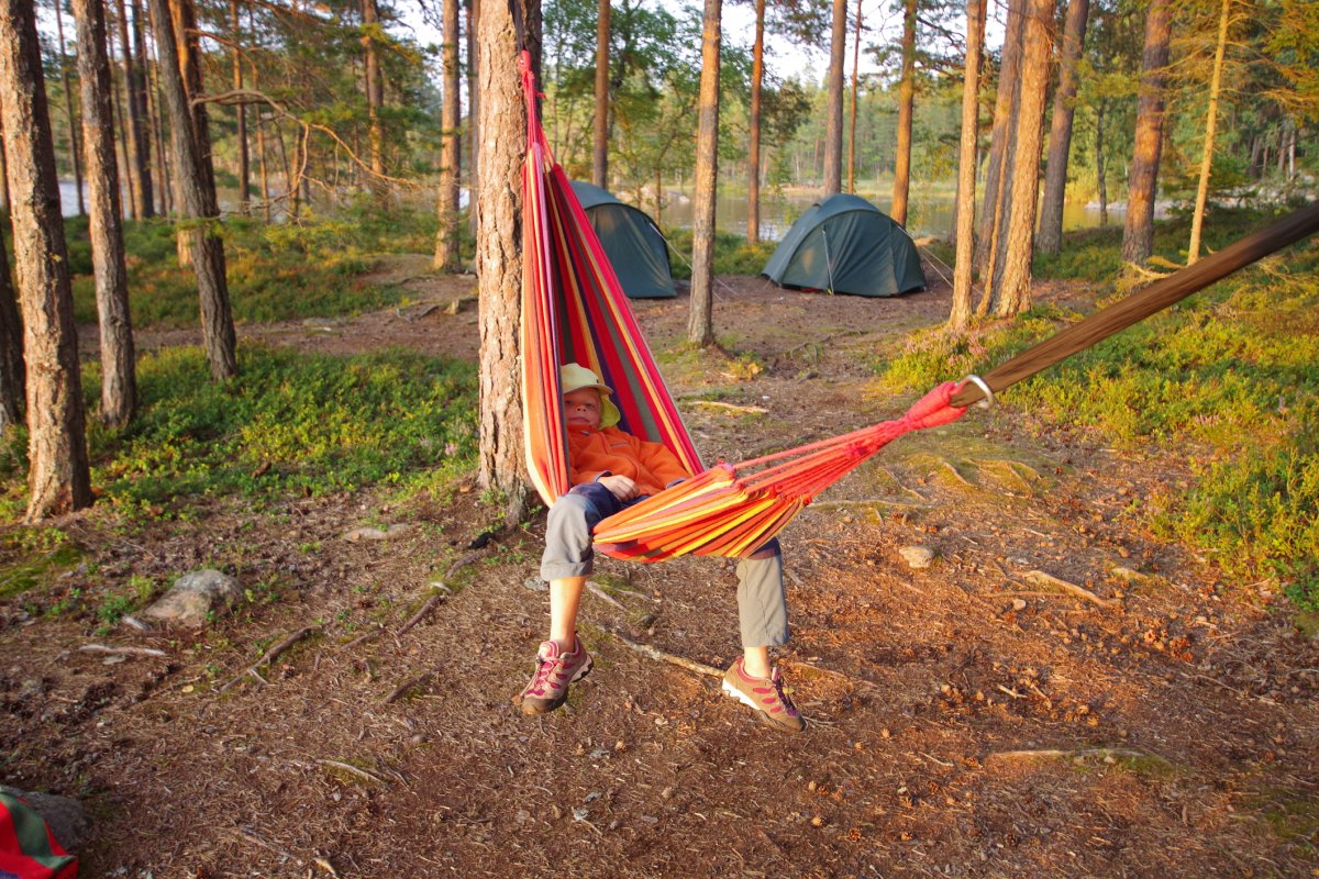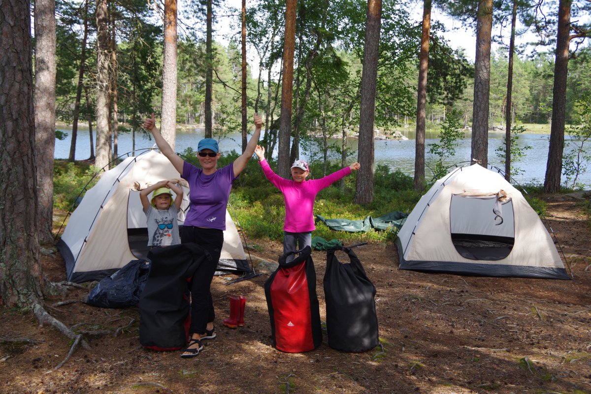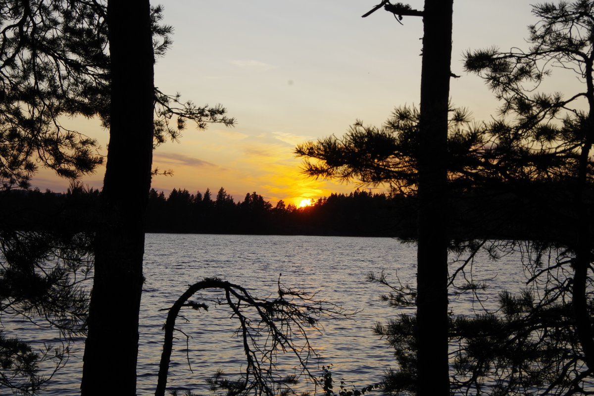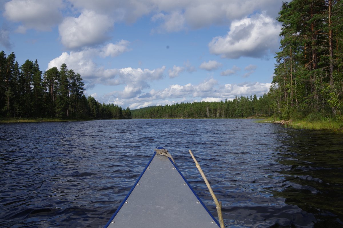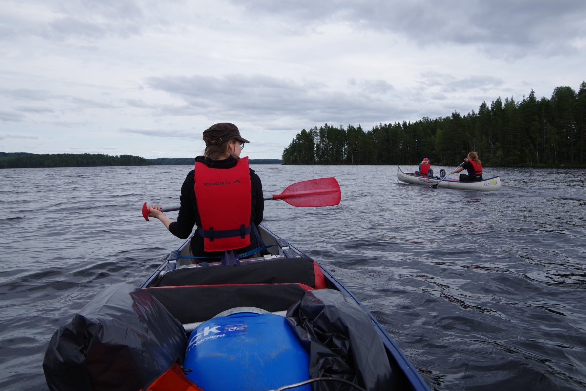 Wir, das sind Lena 10 Jahre, Jacob 6 Jahre, die Eltern Sonja und Michael, sowie Martin und Kerstin und Sonja und Moritz. Nach einem leckeren Essen, das letzte was nicht auf dem Feuer gekocht wird, machen wir uns auf den Weg zum Hamburger ZOB wo bereits eine große Gruppe junger WWFler, sowie weitere Abenteurer auf die Abfahrt des Scandtrack-Shuttles warteten. Mit etwas Verspätung trifft dieser auch ein. Wir freuen uns sehr über die Sitzplatzauswahl, ganz vorne mit bester Aussicht und Beinfreiheit, was bei 12 Stunden Busfahrt echt schön ist. Trotz etwas lauter Hintersitzer schlafen zumindest die Kinder sofort ein und müssen auf den Fähren aus dem Bus getragen werden. Etwas müde und zerschlagen kommen wir im Basiscamp Höglund an, achja stimmt, hier war das also, so wir bereits vor ca. 15 Jahren das erste Mal Kanutour auf eigene Faust gemacht haben. Aber diesmal geht es noch weiter. So heißt es warten und Kekse essen bis unser Bus nach Glaskogen abfährt, wo uns Arne, einer der Scandys nett in Empfang nimmt. Unser Plan nur drei Boote zu nehmen und die Kinder jeweils in die Mitte zu setzen, klappte leider aus Platzmangel nicht. So werden nach viel Hin und Her doch vier Boote beladen und zu Wasser gelassen. Mit etwas Gegenwind war das Vorankommen am ersten Paddeltag sehr anstrengend, vor allem für die Boote mit Kind, weil das heißt, der Hintermann muss lenken und den Anschub leisten. (Am Schluss unserer Reise kommen wir auf die schlaue Idee ein Kanu als Gepäck-Anhänger zu nehmen, so dass wir doch zwei dreier-Boote machen können, das geht gleich viel besser.)