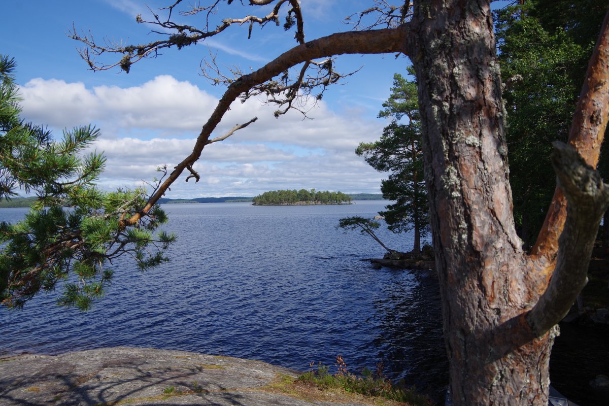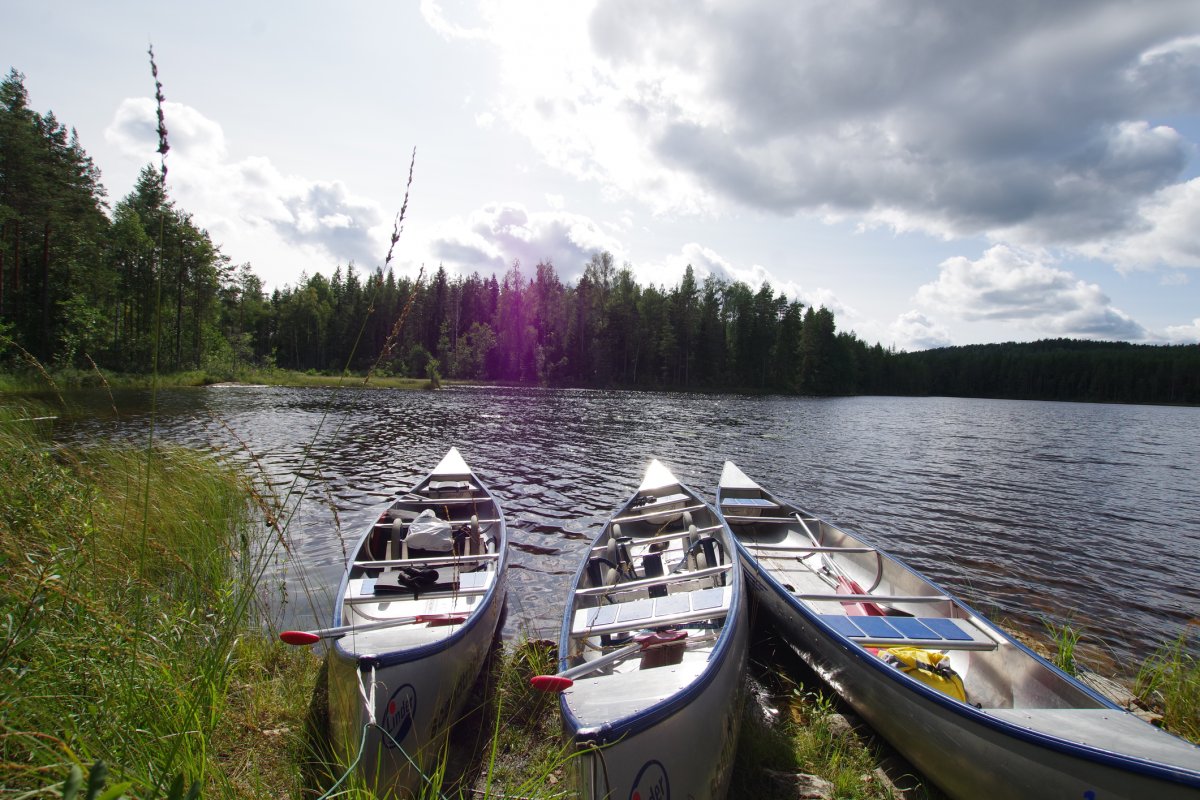 Tag zwei auf dem Wasser schaut dann aber doch gleich viel besser aus, der Urlaub kann beginnen. Der Regen verzieht sich, sobald wir die Zelte abgebaut haben und wir machen uns bei schönstem Wetter auf in den angrenzenden See - Glasjörn. Der Bach, der dort rein fließt ist leider etwas wild mit vielen Steinen, so dass wir umtragen müssen, bei vier Booten, eine ganz schöne Arbeit. Aber mit zwei Kanuwagen je Boot bauen wir uns prima Bollerwagen, so dass das Gepäck gefahren werden kann. Nur die Strecke müssen wir somit zweimal laufen. Am dortigen Rastplatz angekommen genießen wir die Sonne, das frische Seewasser und versuchen mit der neu gekauften Angel einen Fisch zu fangen. Leider erfolglos. Auch die kommenden Tage haben wir mit den Fischen kein Glück. Ein kleiner Zackenbarsch erbarmt sich, den wir uns dann zu acht teilen…Ganz schön teuer, wenn man bedenkt, dass die Angelkarte 40 Euro gekostet hat, aber lecker war er trotzdem und wenn der Hecht nicht ganz so groß gewesen wäre und die Angel zerbrochen hätte, wer weiß, vielleicht wäre es doch noch ein guter Fang geworden? Oder wir hätten uns an den Grndsatz halten sollen, „wir gehen Fische fangen“ und nicht bloß angeln (hat beim Pilze finden (statt suchen) auch geklappt).