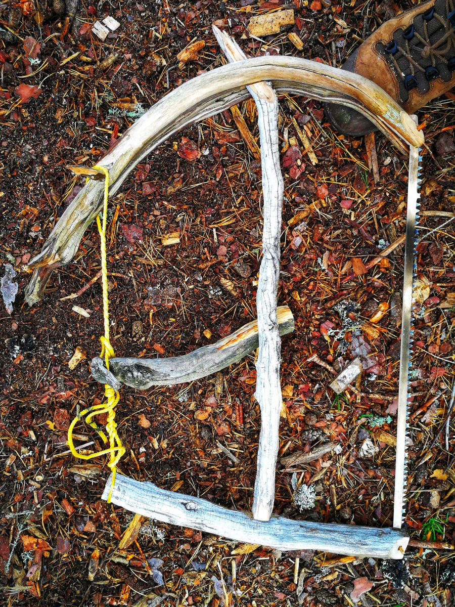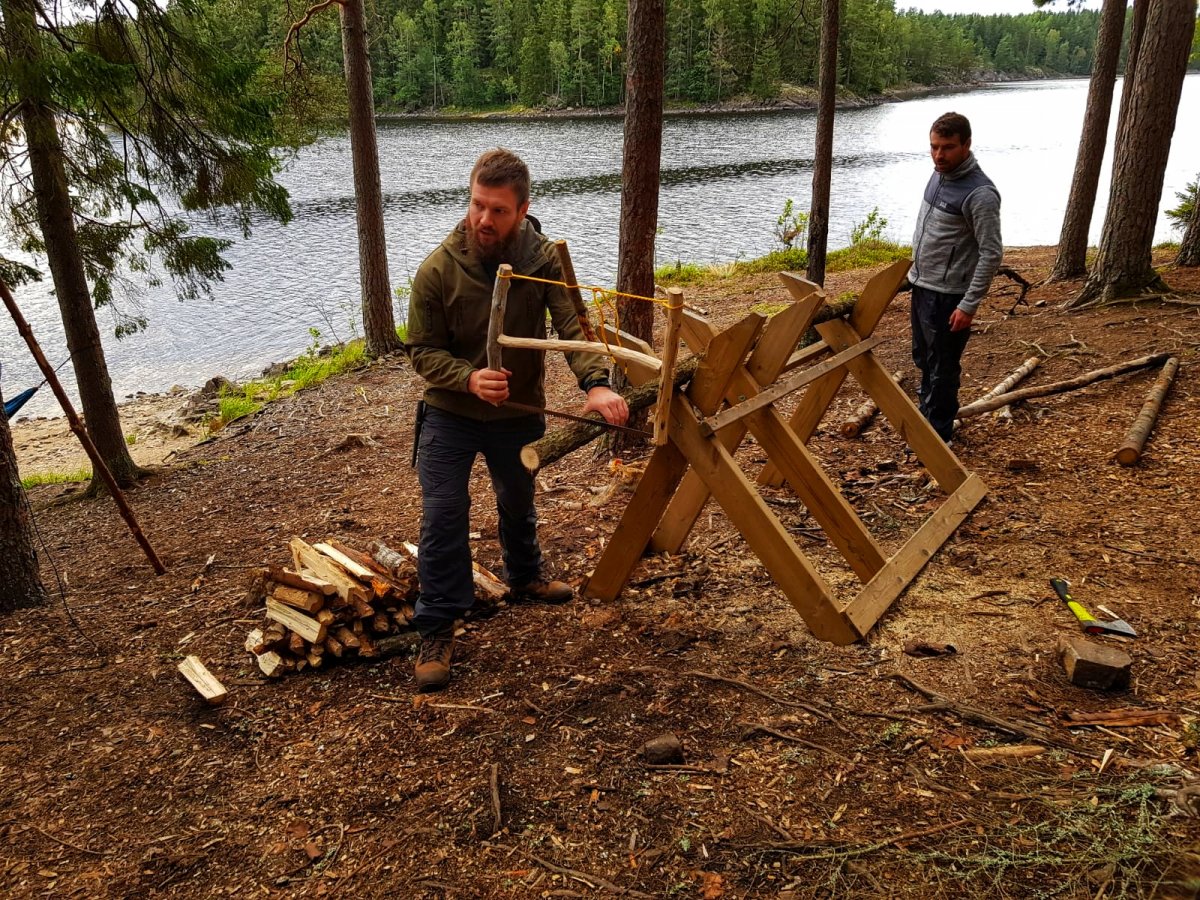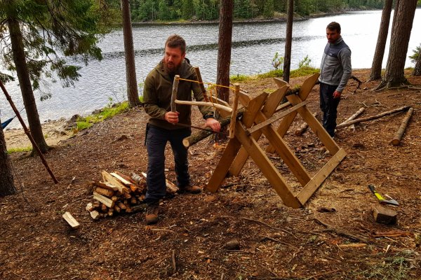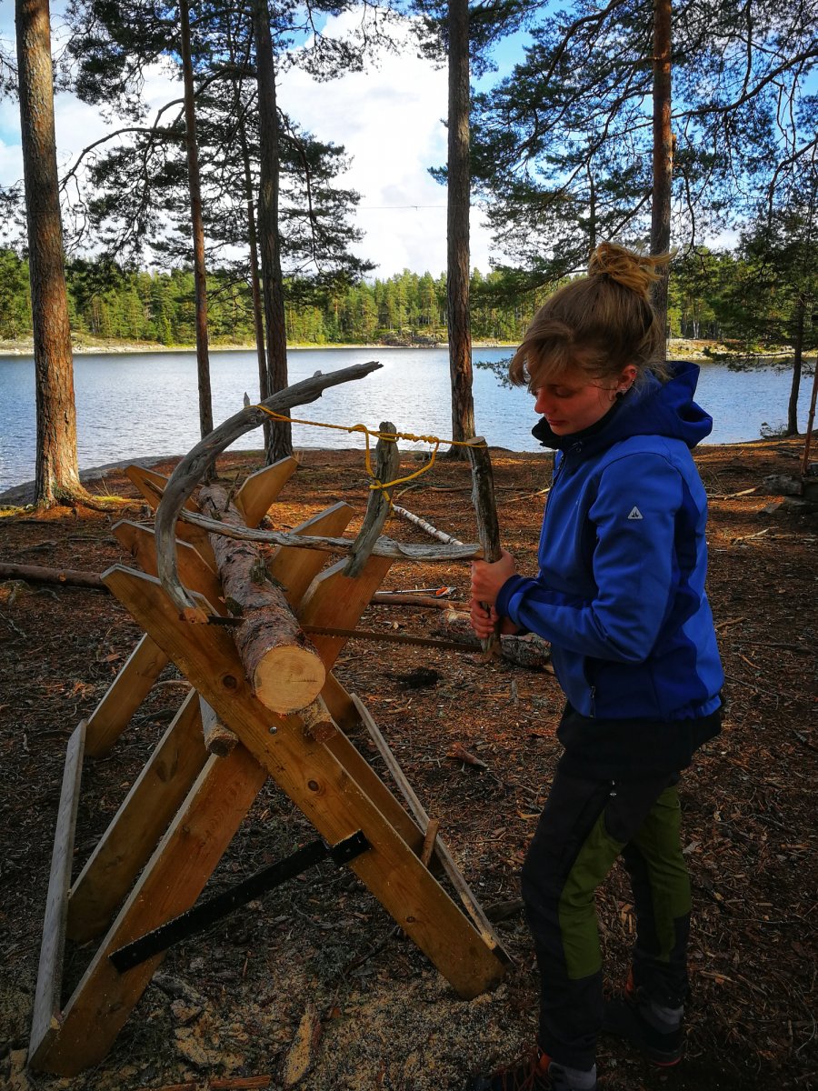 Ich verbrachte den Tag damit eine Bügelsäge zu bauen, da die im Ausrüstungspaket leider alle etwas stumpf waren. Die Anderen verbrachten den Tag mit Angeln, in der Hängematte entspannen, Gegend erkunden und Feuerholz machen.