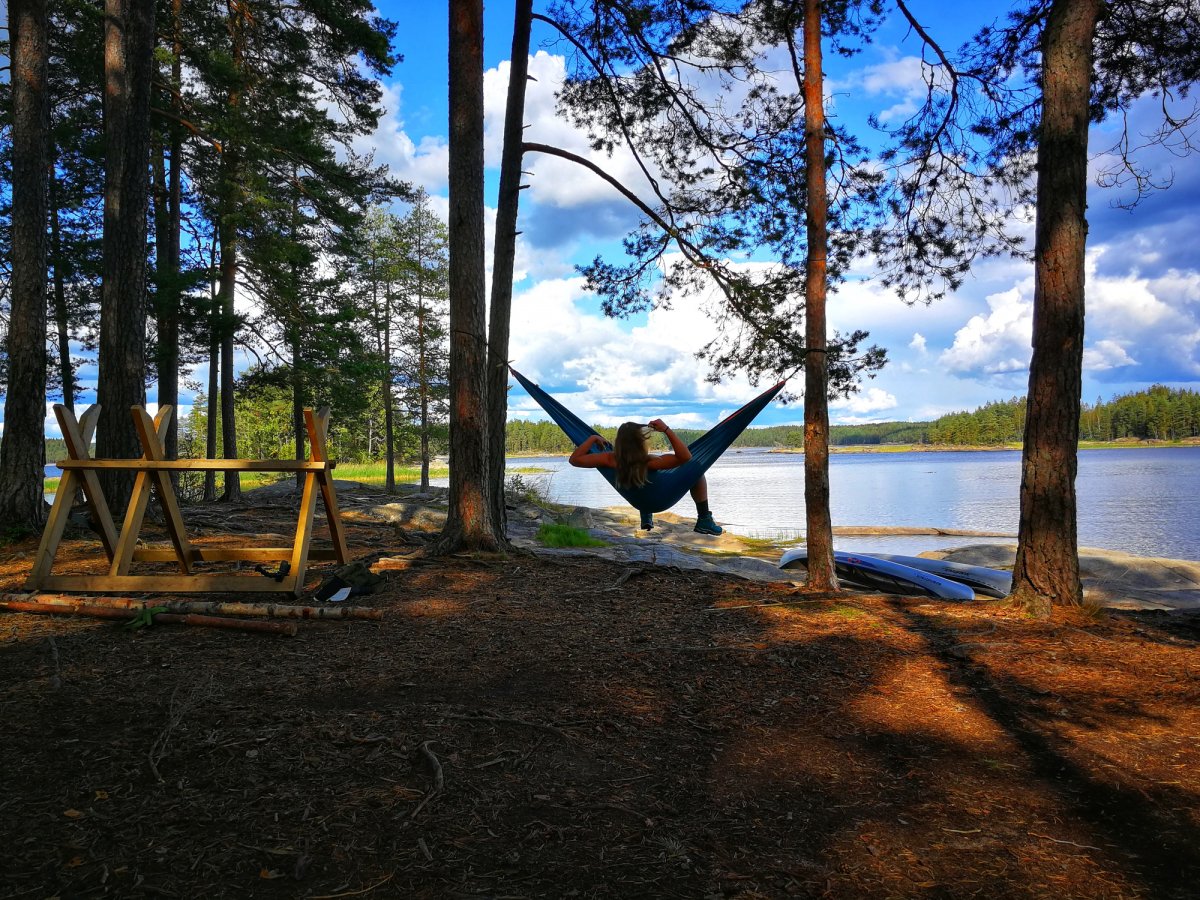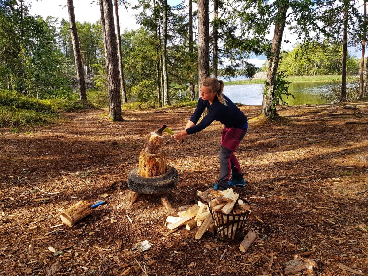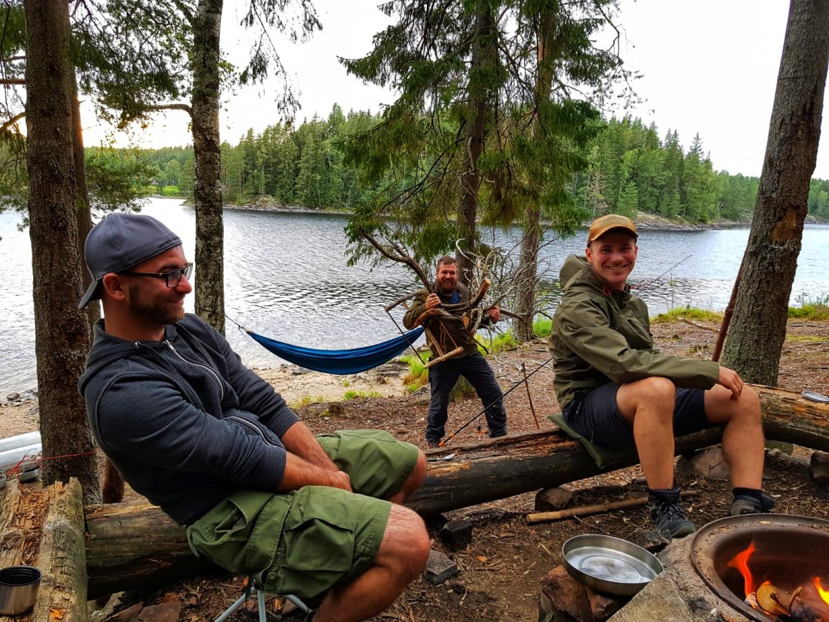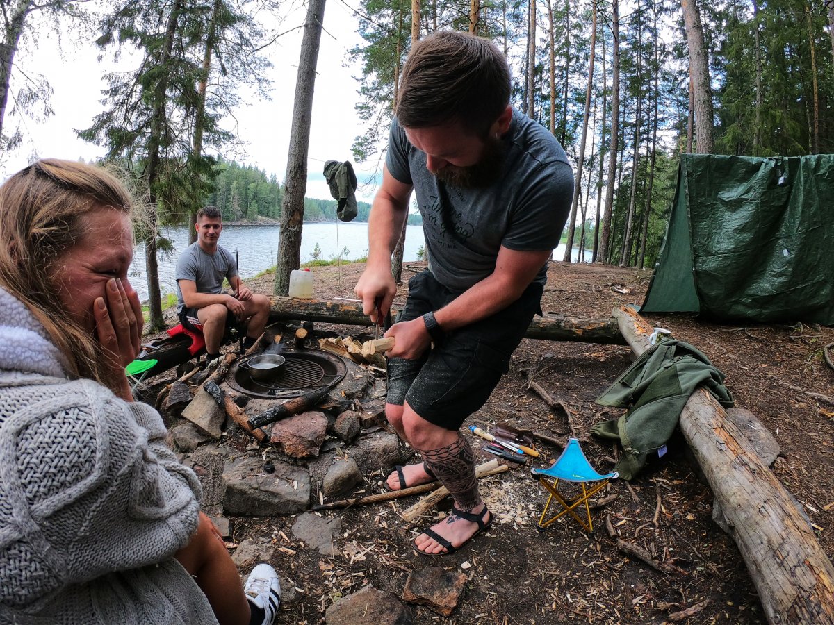 Ich verbrachte den Tag damit eine Bügelsäge zu bauen, da die im Ausrüstungspaket leider alle etwas stumpf waren. Die Anderen verbrachten den Tag mit Angeln, in der Hängematte entspannen, Gegend erkunden und Feuerholz machen.