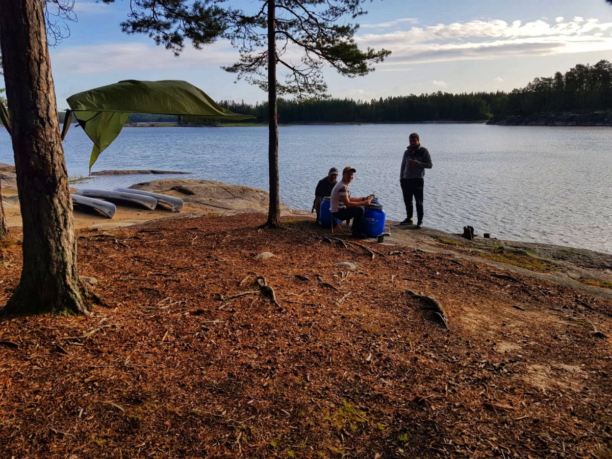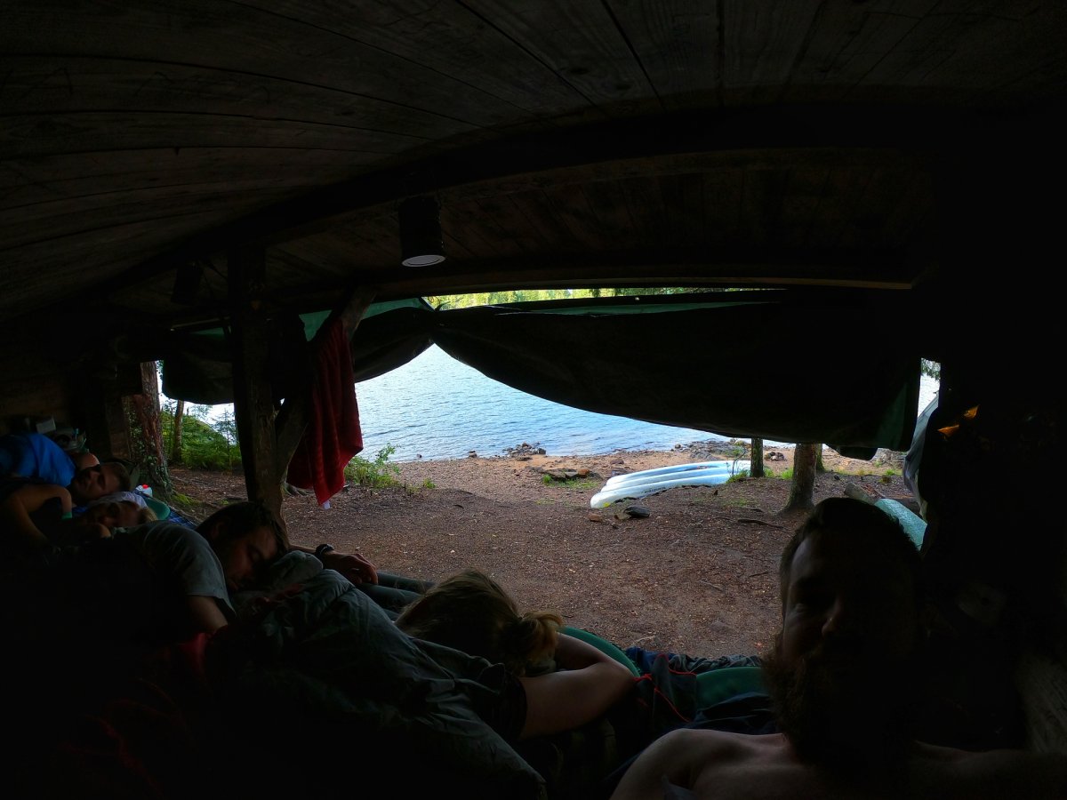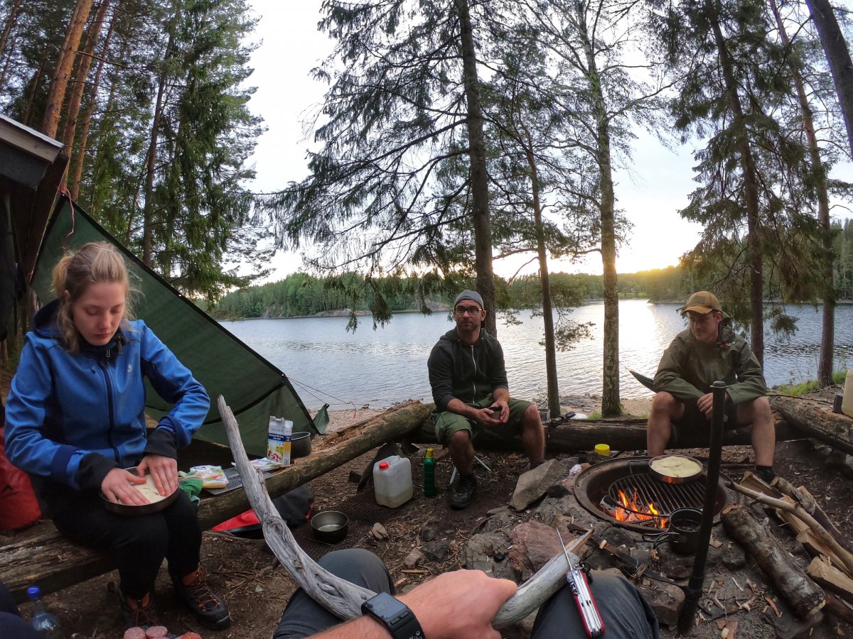 Wir landeten an und entluden unsere Sachen. Danach wurde die Insel erkundet und Feuerholz gesucht. Zu unserem Glück hinterließen die letzten Übernachter ein Tarp, eine große Bratpfanne und zwei Feile zurück, was uns auf dem Rest der Reise noch sehr von nutzen war.