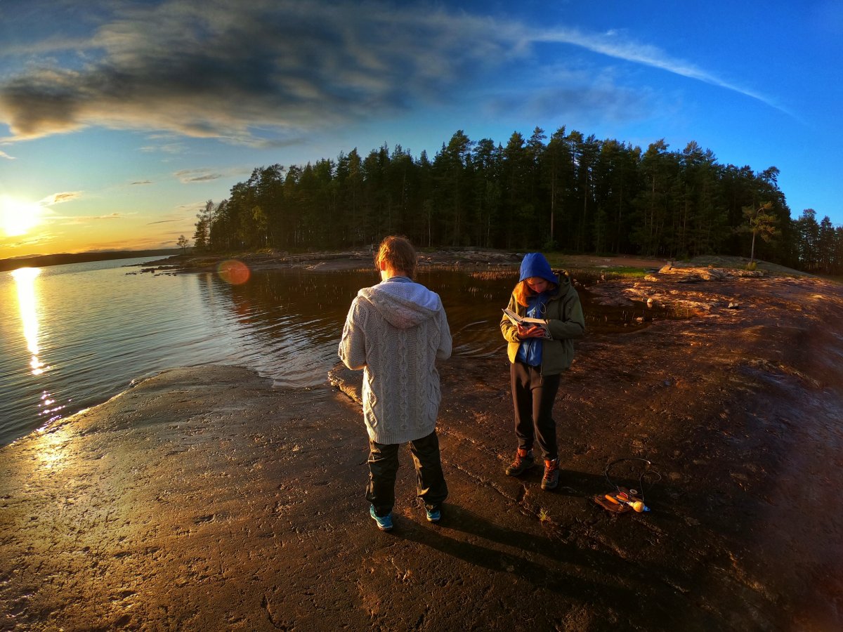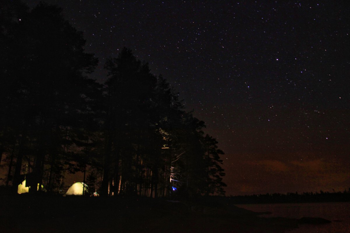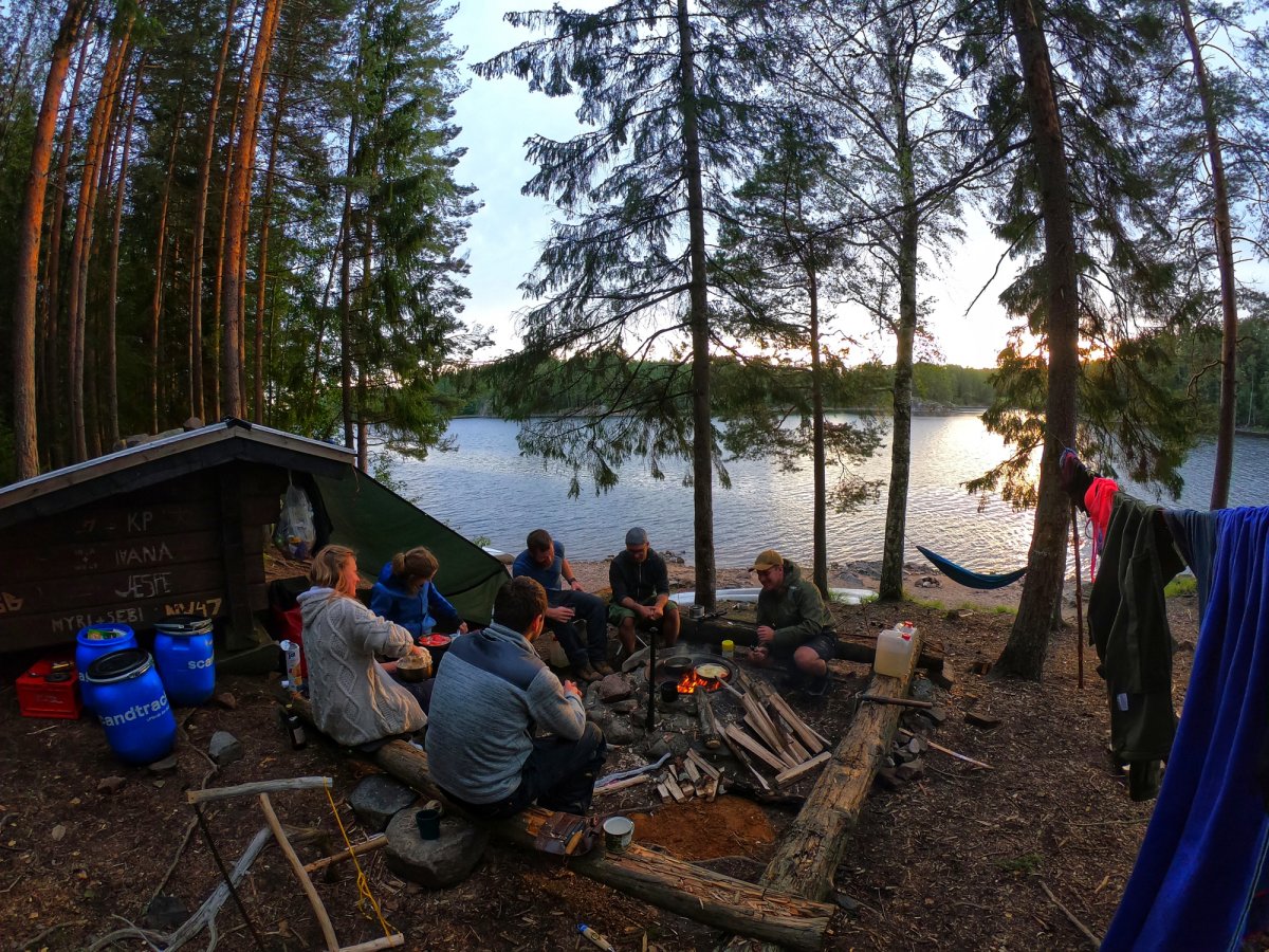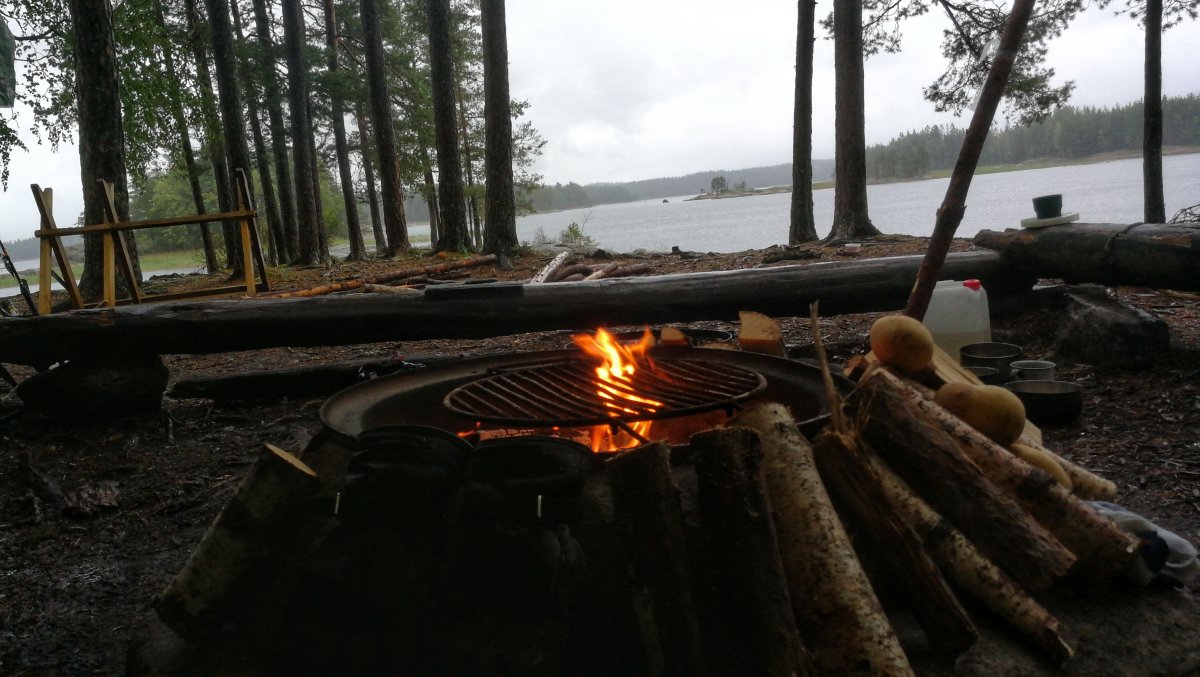 Wir landeten an und entluden unsere Sachen. Danach wurde die Insel erkundet und Feuerholz gesucht. Zu unserem Glück hinterließen die letzten Übernachter ein Tarp, eine große Bratpfanne und zwei Feile zurück, was uns auf dem Rest der Reise noch sehr von nutzen war.