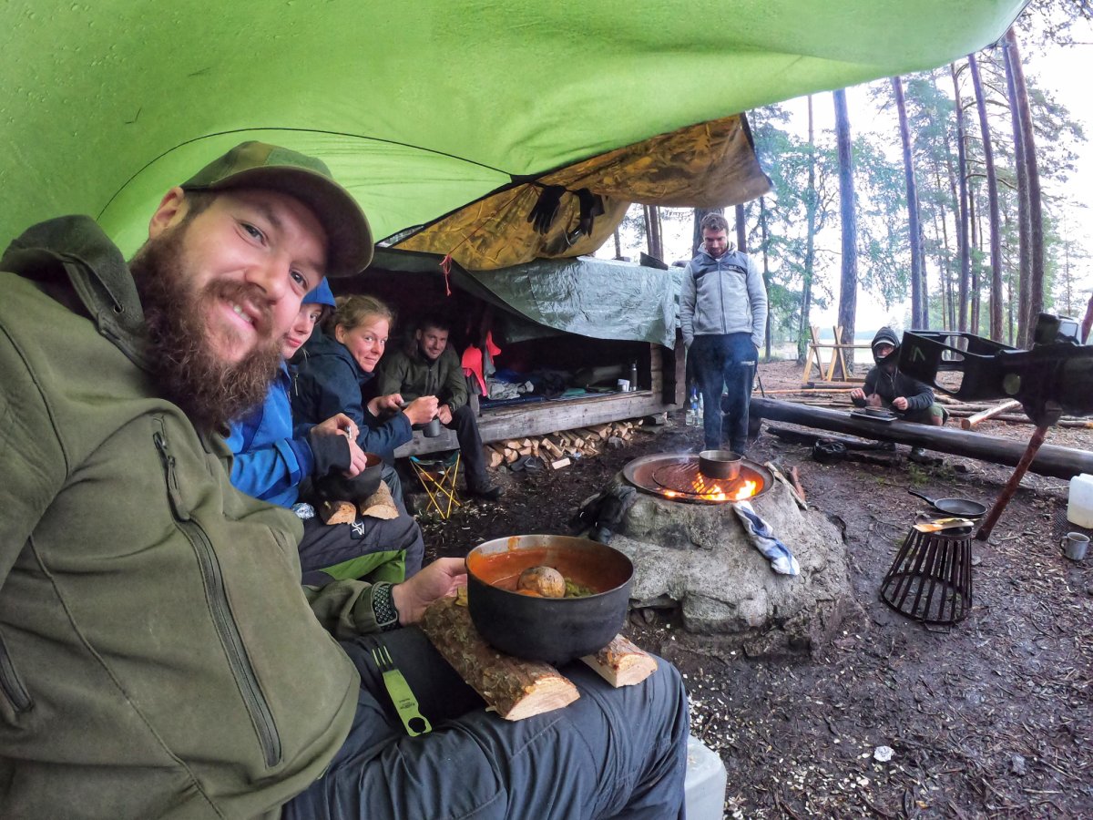 Anschließend machten wir uns daran das Lager zu befestigen, da der nächste Tag sehr regnerisch werden sollte. Wir spannten also die Tarps vor das DANO und halb über die Feuerstelle, sodass wir Wind- und Regensicher kochen und auch essen konnten.