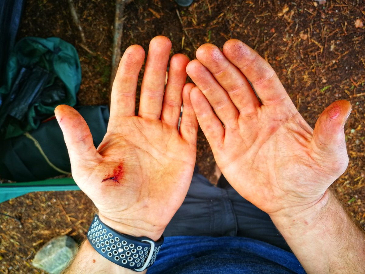 Basislager war für mich wie aufgeben, wir berieten uns und stimmten schließlich ab, das DANO gewann. Also bauten wir unsere Zelte neben dem DANO auf, danach bauten wir uns einen Gruppenplatz, dazu befestigten wir an zwei Bäumen eine Querstange und spannten dann unsere Tarps so darüber, dass wir von zwei Seiten windgeschützt waren und ein Tarp als Dach darüber.