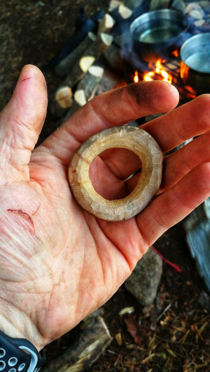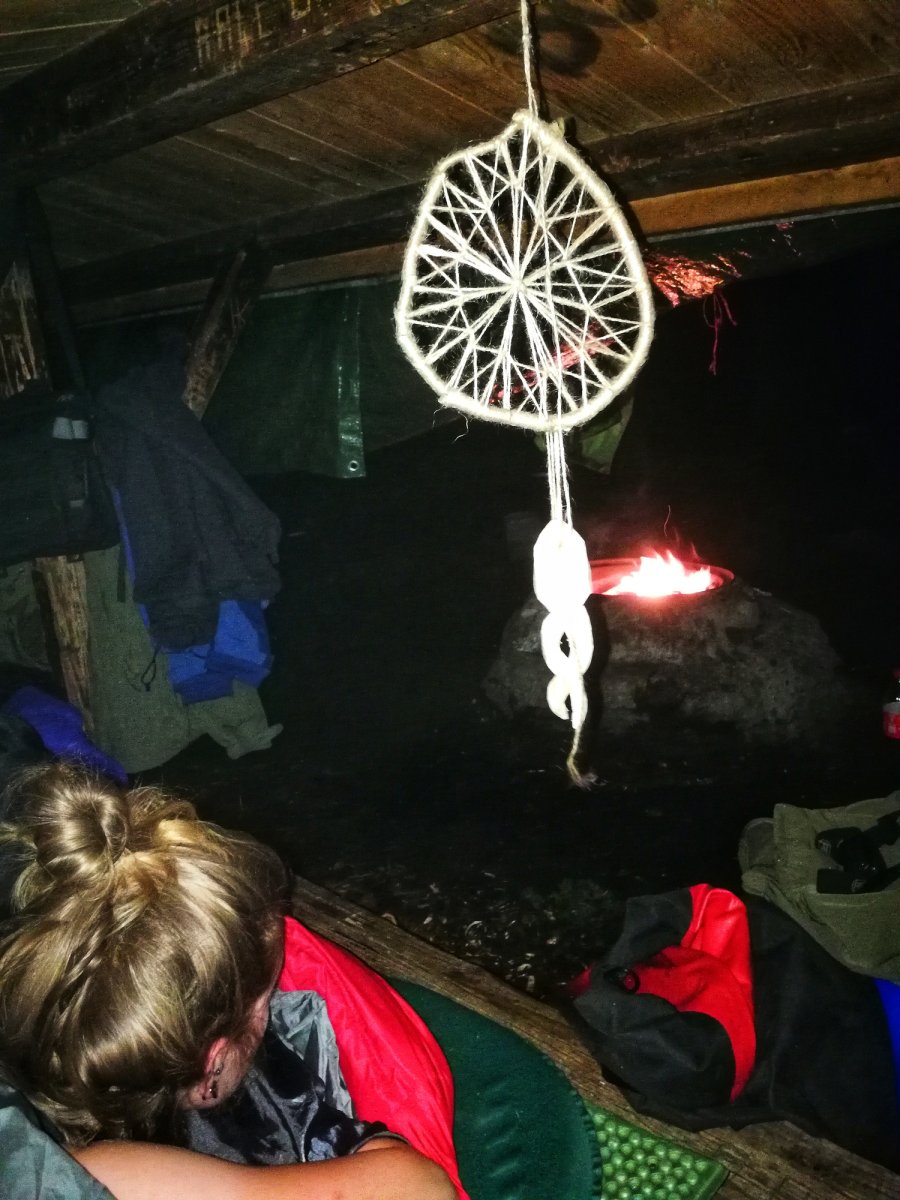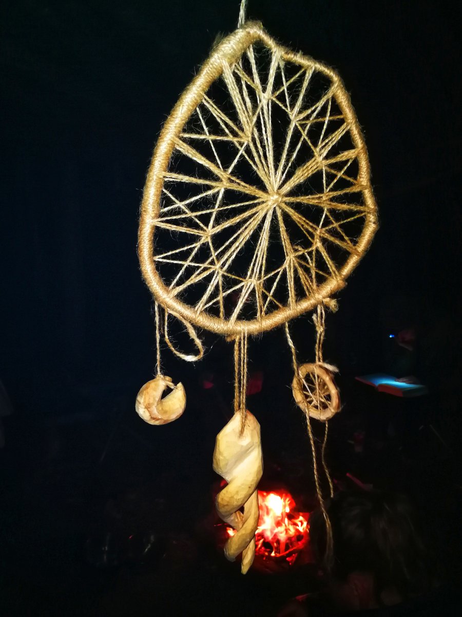 Ich beschäftigte mich den ganzen Tag mit dem basteln meines Traumfängers und dem schnitzen einer Doppelspirale dafür. Die anderen lasen Buch, schnitzten und plauderten am Lagerfeuer.
