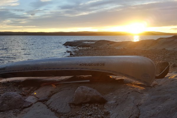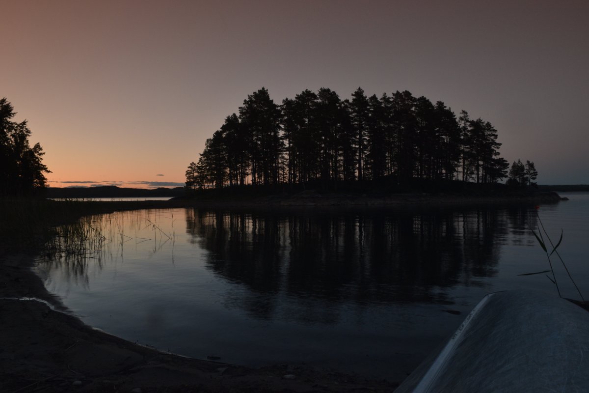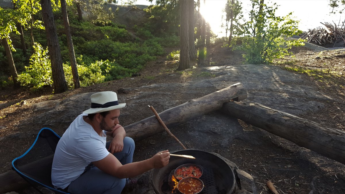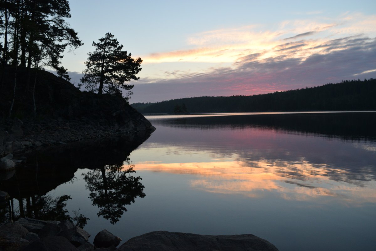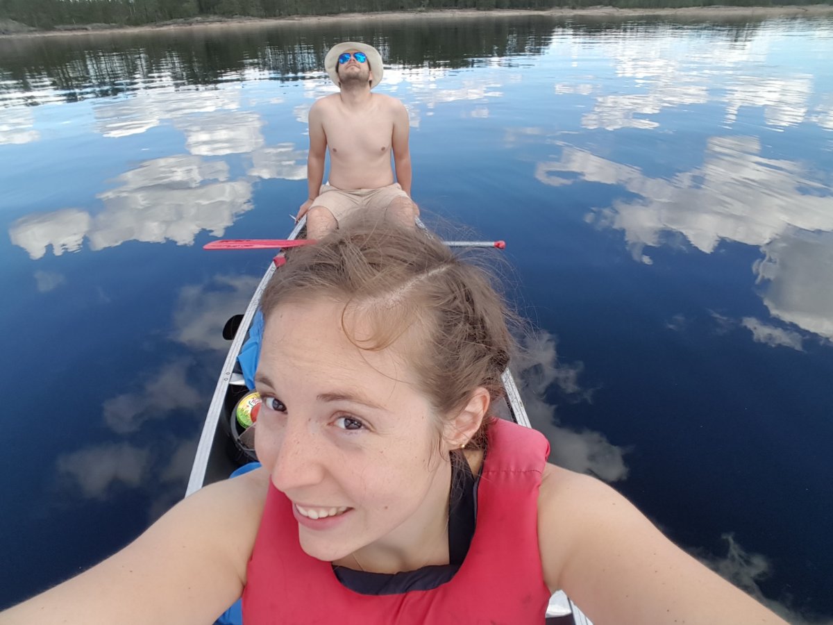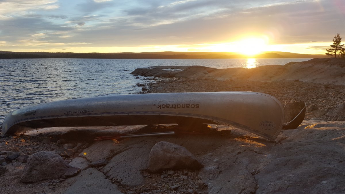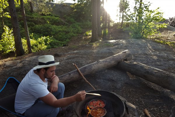 Dort angekommen, wussten wir: Diese Insel wird beliebt sein. Es dauerte auch nicht lange, da hielt ein Kanu an. Doch René managete das super, indem er den Bootinsassen erklärte „Dort hinten ist auch noch ein Lagerplatz, nicht weit von hier. Da haben die Ranger soeben Holz abgeladen“ und diese daraufhin tatsächlich wieder verschwanden. Ich war so stolz auf ihn! Natürlich wussten wir, dass hier das Jedermanns-Recht gilt und wir keinen Platz für uns alleine beanspruchen können. Doch wir wollten die Woche eben ungestört verbringen und sehnten uns nicht nach Gesellschaft. Bei der Erkundung der Insel haben wir sogar einen Steinpilz gefunden, der gleich mit in die „Terence-Hill-Pfanne“, ebenfalls ein leckeres Bohnenrezept aus dem Scandtrack-Kochbuch, geschnippelt wurde. Als vorbeugende Maßnahme schliefen wir diese Nacht mit geöffneten Außenzelt, so konnten wir auch bis spät in die Nacht den rötlich erstrahlten Himmel beobachten.