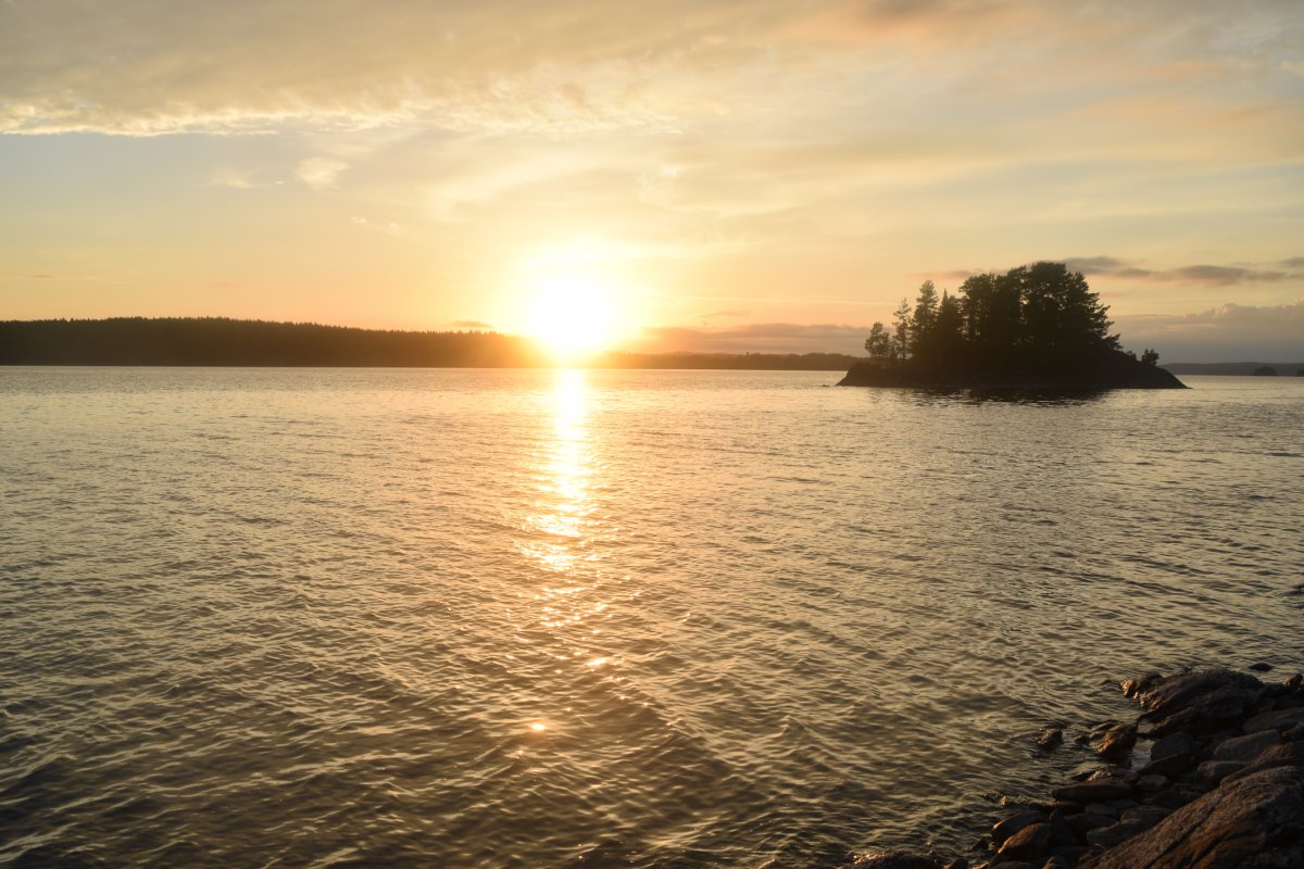 Vom zweiten Grenzstein aus war es nicht mehr weit bis zu unserer Zielinsel. Mit dem Fernrohr konnten wir erkennen, dass soeben ein Pärchen von dort abreiste. Was für ein Glück! Doch da hatten wir uns zu früh gefreut: Als wir um die Ecke bogen, haben sich bereits zwei Leute auf der Insel, direkt an der Schutzhütte, ausgebreitet. Jetzt weiß ich auch, wie sich das Pärchen von gestern gefühlt haben muss. Schöner Mist! Wir umkreisten die Insel und fanden an der östlichen Seite schließlich doch noch eine Stelle, an der sowohl Zelten als auch Feuer machen möglich war. Dort angekommen beruhigten sich die Gemüter, vor allem nachdem es leckeres Essen gab. Es war ein wunderschöner Abend: wie liefen zur anderen Seite der Insel und genossen eng aneinander gekuschelt den Sonnenuntergang.