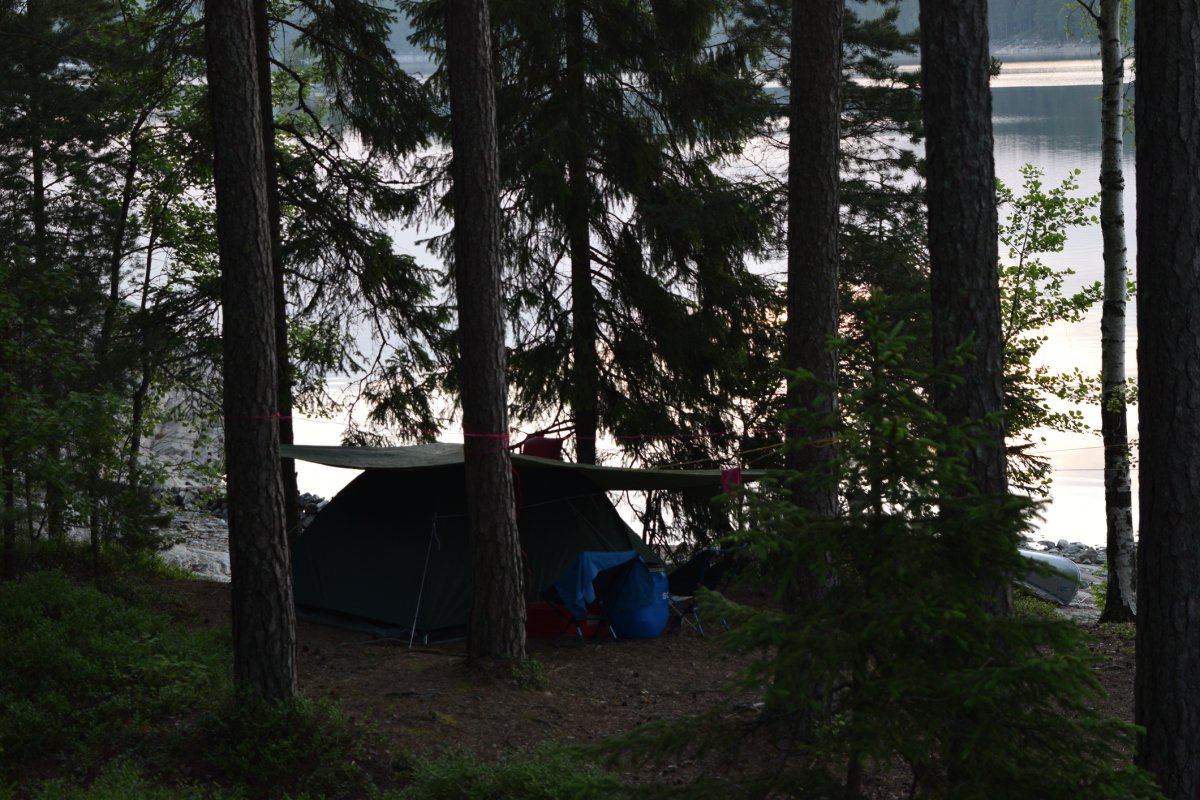 Wir hielten an einer Insel an, die zum Übernachten ideal gewesen wäre, da sie ebenen Waldboden zum Zeltaufbauen und eine kleine Feuerstelle bot. Doch weil wir erst zwei Stunden gepaddelt sind und die Befürchtung hatten, noch jemand könne sich auf die Insel verirren -wir wollten ja schließlich einen Urlaub in trauter Zweisamkeit verbringen - paddelten wir doch noch ein Stück weiter. Die zweite Lektion noch am gleichen Tag: Wenn du einen perfekten Schlafplatz gefunden hast, dann bleib auch dort! Auf den nächsten Inseln und Buchten sah es vom Wasser aus nicht nach einer Schlafmöglichkeit aus, sodass wir noch ein ganzes Stück paddeln mussten, ehe wir an einem Strand anlegten. Wir erkundeten die Umgebung und enschieden uns auf Grund der fortgeschrittenen Zeit und der nachwirkenden Busfahrt, im Wald unmittelbar hinter dem Sandabschnitt zu campieren. Unglücklicherweise war das ein Paradies für Mücken, sodass wir erst einmal eine „Autan-Dusche“ nehmen mussten, um in Ruhe das Zelt aufbauen zu können.