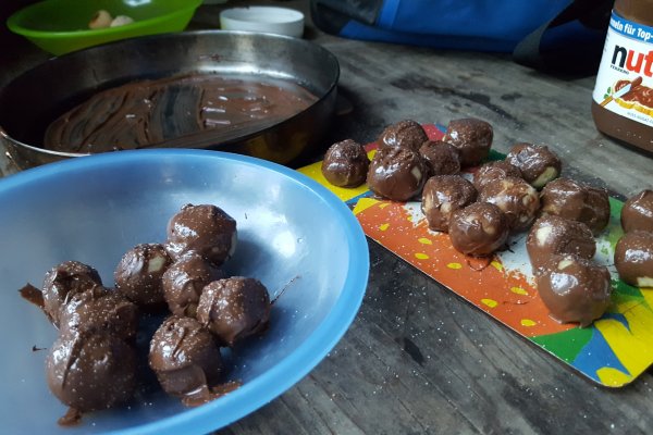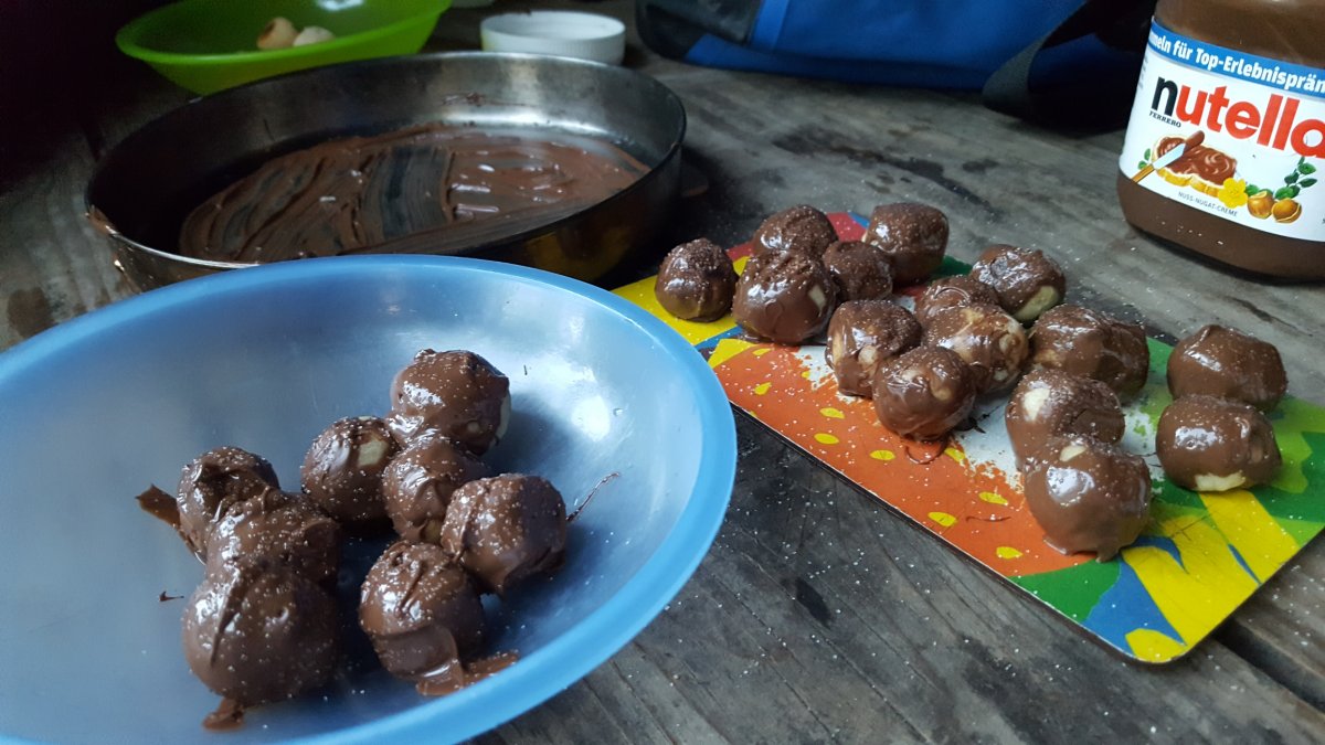 In der Nacht hatte der Wind gedreht, sodass wir durch den Rückenwind regelrecht auf den Wellen Richtung Süden geritten sind. Der Lagerplatz, den wir ansteuern wollten, lag etwas versteckt, wir paddelten anfangs daran vorbei und stellten erst bei der nächsten Bucht, wo es leider keine Schlafgelegenheit gab, fest, dass wir zu weit waren. Also wieder 1,5 km zurük. Für diese Anstrengung belohnten wir uns am Abend mit „Elchköteln“: aus dem Scandtrack-Kochbuch empfohlene Leckerei, bei der Stockbrotkügelchen mit Nutella ummandelt werden.