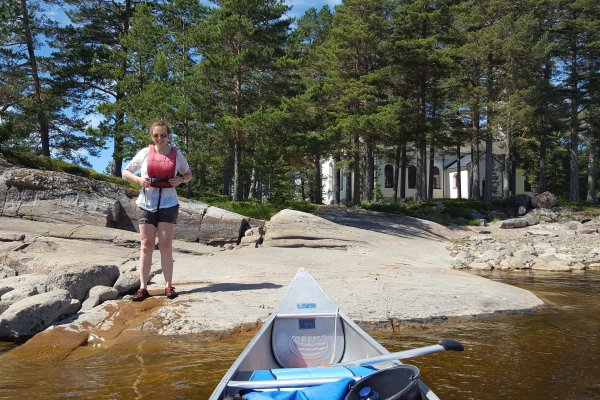 Am Morgen des 3. Tages hörten wir den Wind sausen und dachten schon an eine ähnliche Tortur wie am Vortag. Doch als wir im Wasser waren, bemerkten wir einen viel sachteren Wellengang. Das Paddeln verlief ohne Probleme. Wir steuerten unser Zwischenziel, eine Kirche in V. Fagelvik an, die schon nach wenigen hundert Metern nach dem Startpunkt in Lennartsfors in der Ferne zu sehen ist. Beim Anlegen stieg ich aus dem Kanu, doch leider waren die Steine unter mir so glatt, dass ich wegrutschte. Mit noch einem Bein im Boot und dem restlichen Körper im Wasser lag ich da, wie ein Maikäfer auf dem Rücken und kam so schnell nicht hoch. Nachdem mein Schatz sich erst einmal fünf Minuten den Bauch gehalten hat vor Lachen, half er mir schließlich doch hoch und gab mir den Packsack mit unseren trockenen Klamotten. Ich zog mich ohne große Überlegungen um, als er hinter mir rief „Zieht du dir vielleicht mal was an? Wir stehen hier vor Gottes Haus!“ - da musste auch ich schließlich herzlich lachen. Aus Verlegenheit, jemand hätte mich beobachtet, schauten wir uns die Kirche doch nicht von innen an und paddelten weiter, vorbei an einer Lachsfarm.
