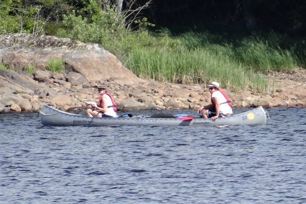 Für unsere Altersklasse typisch schliefen wir während der gesamten Woche aus. Gegen 10 Uhr kroch ich aus dem Zelt, war dabei Wasser für den Kaffee warmzumachen, als ein Kanu an der Insel hielt. Ich sagte ja, die ist beliebt. „Guten Morgen! Bist du etwa ganz alleine unterwegs?“ ertönte es. „Nein, mein Freund schläft nur noch“. Etwas peinlich berührt stiegen sie wieder ins Kanu „Macht euch keinen Stress, wir müssen eh noch Wasser holen“. Wir haben uns beide gefragt, wie man im Urlaub nur so zeitig wach sein kann, zumal die beiden nach ihren Erzählungen her schon eine ordentliche Strecke zurückgelegt haben. Nachdem sie uns noch mit Tipps für mögliche Lagerplätze ausgestattet haben, zogen wir los. Die erste Hälfte unserer heutigen Tour gestaltete sich leider wieder einmal ziemlich unharmonisch: Ich nutzte jede Gelegenheit aus, um mal eine Paddelpause zu machen, was René ziemlich störte und er sich zudem erneut über meine Paddeltechnik aufregte. Es artete schließich so aus, dass wir anhielten und die Plätze tauschten. Ich wollte ihm beweisen, dass es vorne schwieriger sei. Leider hatte ich den Dreh mit dem Lenken nicht ganz so raus, sodass wir nach ca. 500 m Zick-Zack wieder getauscht haben. Als wir am ersten Grenzstein Schweden-Norwegen vorbeizogen, harmonierten wir wieder. Lag es vielleicht daran, dass wir in Norwegen waren?