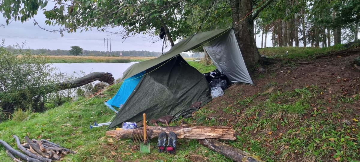 Am sechsten und vorletzten Tag unserer Reise machten wir einen Zwischenstopp in der Stadt Tidan und ein paar Einkäufe zu erledigen. Doch waren wir ziemlich sprachlos als wir realisierten, dass die Menschen in Schweden ohne Maske einkaufen gehen durften. Nach einer kleinen Stärkung stellten mein Vati und ich auf dem Weg zur Einsetzstelle erneut fest, dass in fast jedem Garten der Schweden ein Rasenroboter herumfährt – einer sogar direkt ins Wasser. Wieder auf dem Wasser verpassten wir unser ausgesuchtes Camp. Aus diesem Grund schafften mein Vati und ich doch noch den darauffolgenden See in der Nähe von Östen. Doch das Lager, welches wir als nächstes ansteuerten, war unauffindbar. Aufgrund dessen suchten wir uns einen Platz inmitten einer Baumgruppe aus. Die nächste Stunde waren wir damit beschäftigt, alles wind- und wasserfest zu bauen. An diesem Abend mussten wir erstmals das Mückenspray rausholen, damit wir in Ruhe am Lagerfeuer sitzen konnten. In dieser Nacht habe ich zum ersten Mal Oropax benutzen müssen und das nicht mal wegen des Schnarchens meines Vatis, sondern weil die Plane durch den Wind ziemlich laut flatterte.
