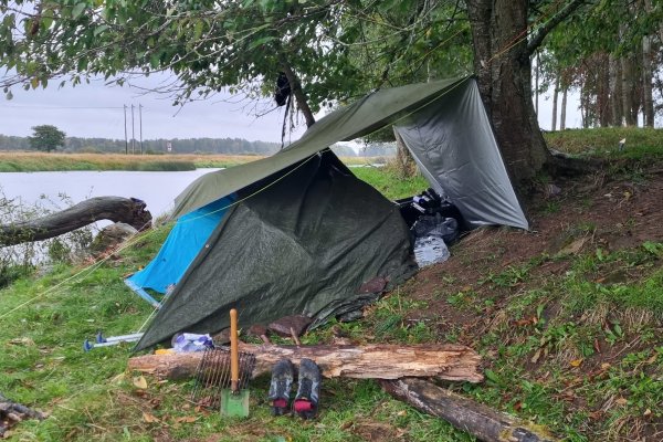 Der darauffolgende Tag wird uns besonders lange an diese Reise erinnern. Das Ziel waren 30 km bis zum nächsten Camp. Während mein Vati die Etappe für diesen Tag eher beenden wollte, blieb ich hartnäckig, damit wir die 30 km für diesen Tag schafften – die längste Strecke bis dahin. Wir passierten die 18. und letzte Umtragestelle, doch ein Camp tauchte nicht auf und es wurde zunehmend dunkler. Plötzlich kam doch ein Schild zum Vorschein, allerdings sahen wir nichts außer Wildnis. Dennoch stiegen mein Vati und ich aus und improvisierten einen Lagerplatz neben dem Toilettenhäuschen aus unserem Boot und Planen. Vor lauter Aufregung machten wir uns zu später Stunde nur noch eine Nudelsuppe warm.